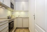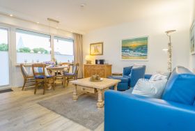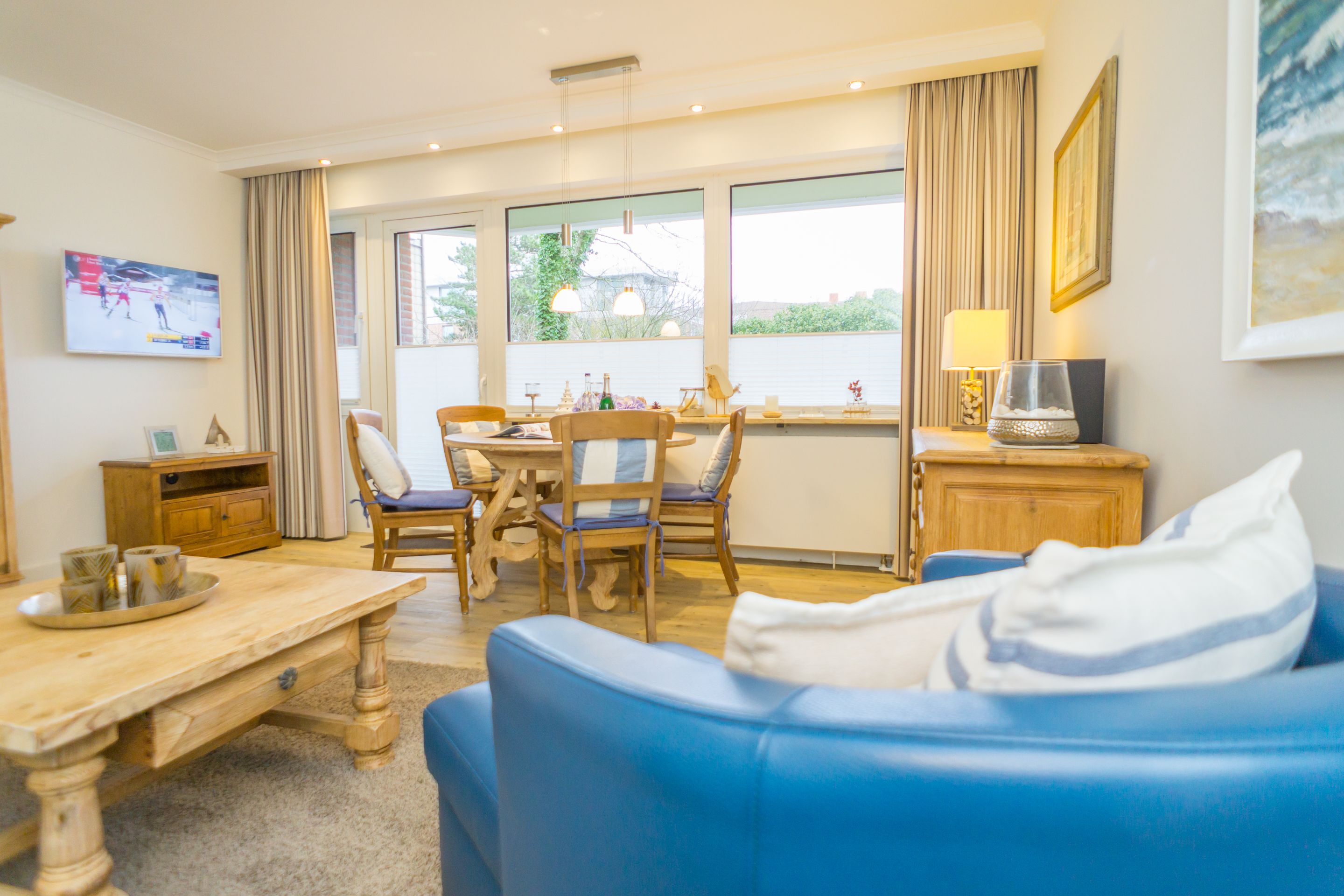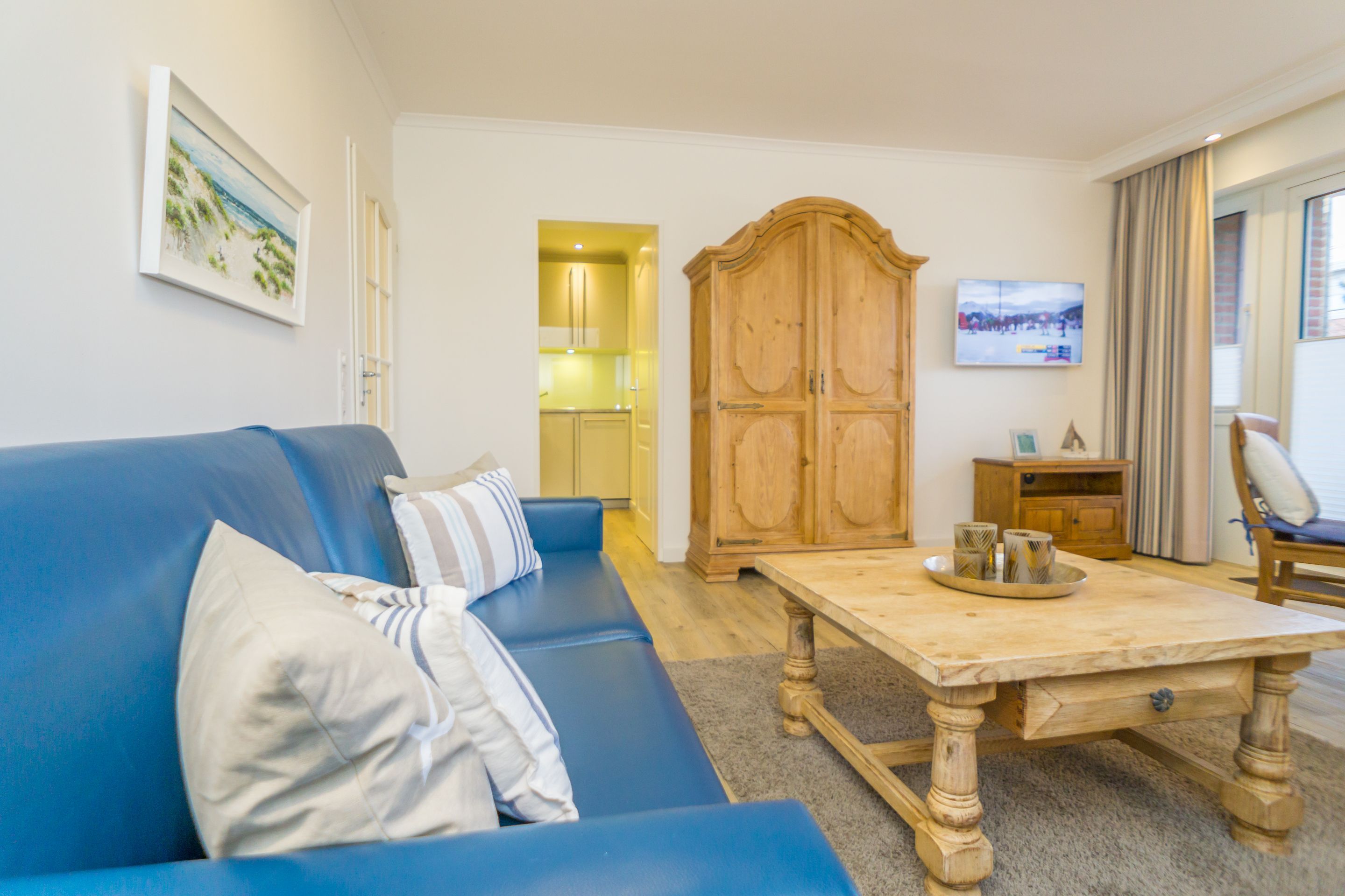 Der Wohnraum besteht aus einer Couchgarnitur von Bielefelder Werkstätten mit Schlaffunktion (separat ausklappbare Matratze in Komfortliegehöhe), einem Sessel, einem Essplatz, Kabel-Flachbild-TV, Radio und Telefon. Vom Wohnzimmer gelangt man in die vollausgestattete separate Küche bestehend aus einem Herd mit Backofen und Cerankochfeld, Geschirrspüler, Mikrowelle und Kühlschrank. Kaffeemaschine, Wasserkocher und Toaster gehören zur Grundausstattung.