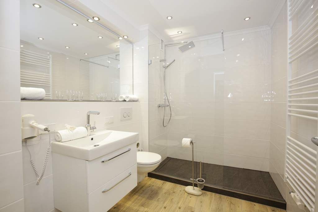 Im Bad befindet sich eine großzügige Dusche mit extraflachem Einstieg, ein Waschtisch, Handtuchtrockner und WC.