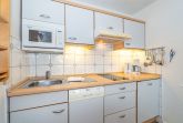 Die helle Küchenzeile ist mit einem Geschirrspüler, einer Mikrowelle, einem 2-Platten-Ceran-Kochfeld und einem Kühlschrank ausgestattet.