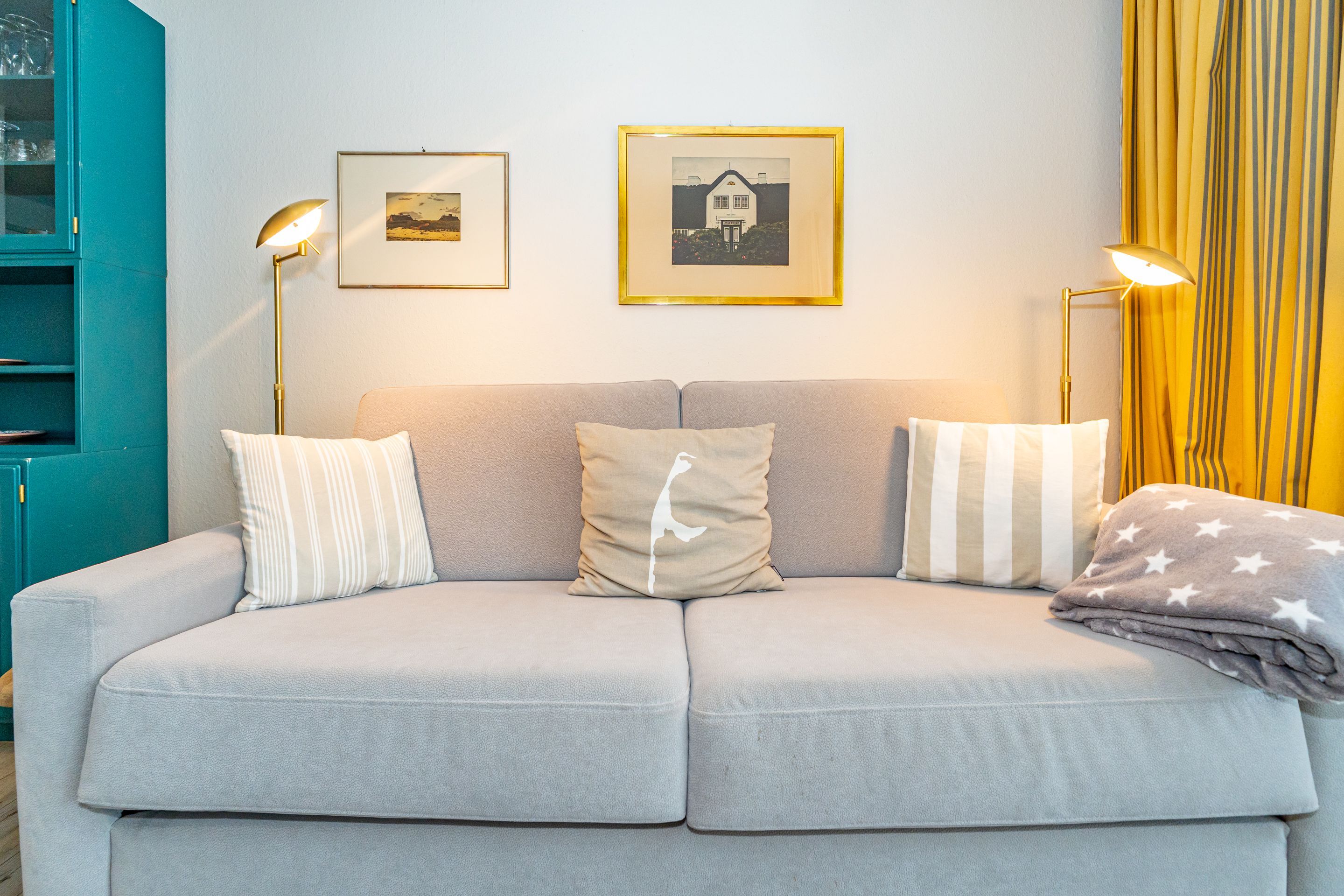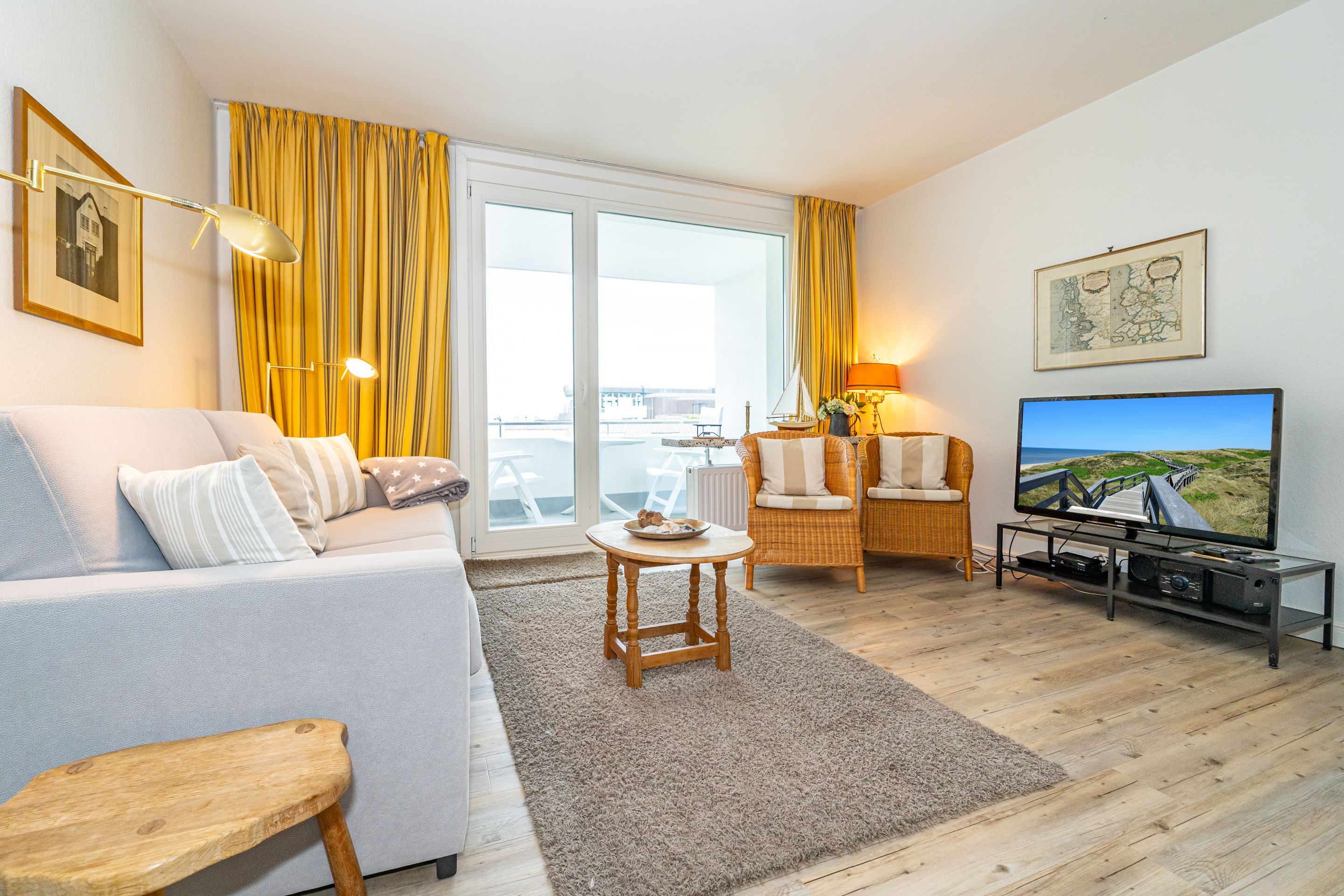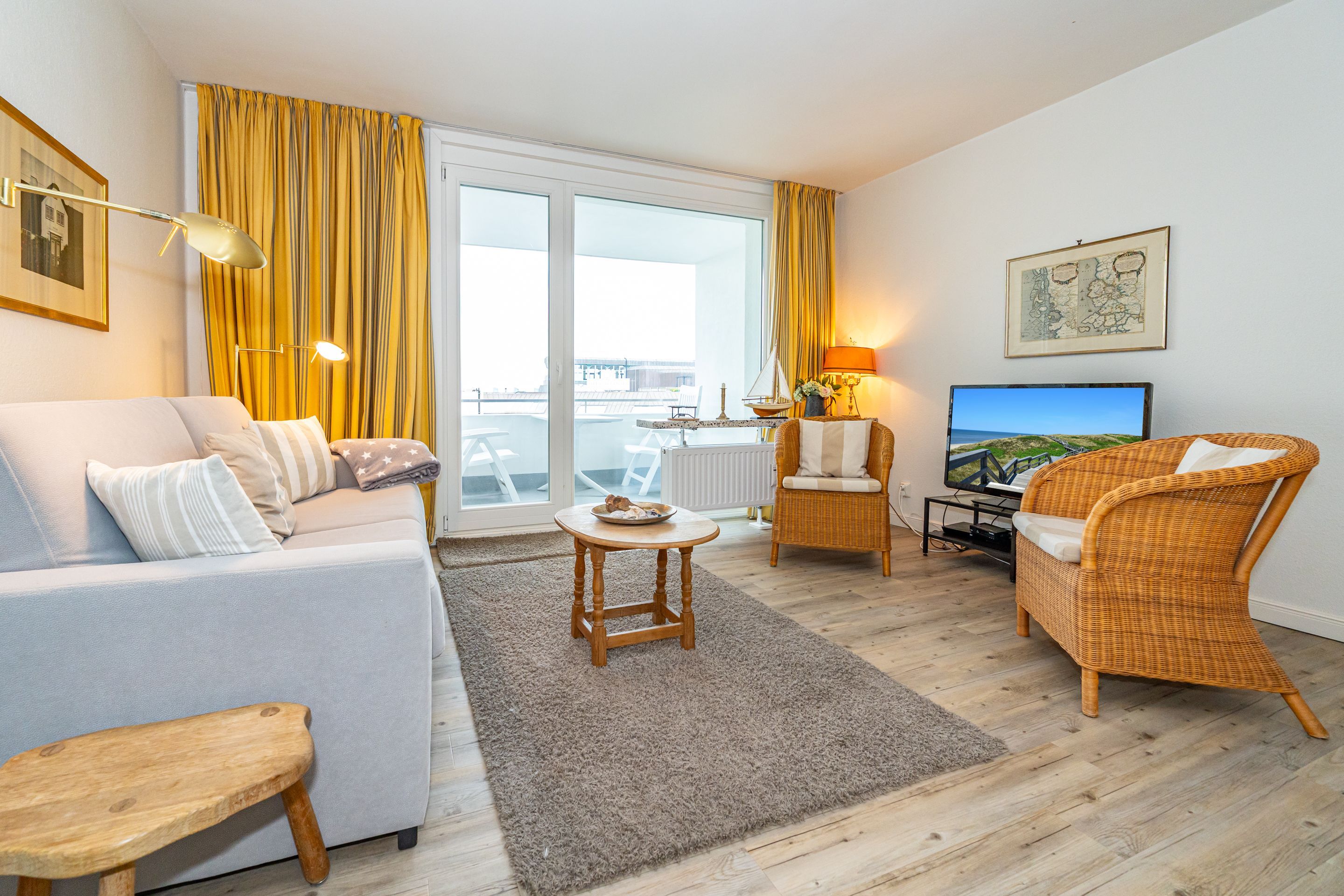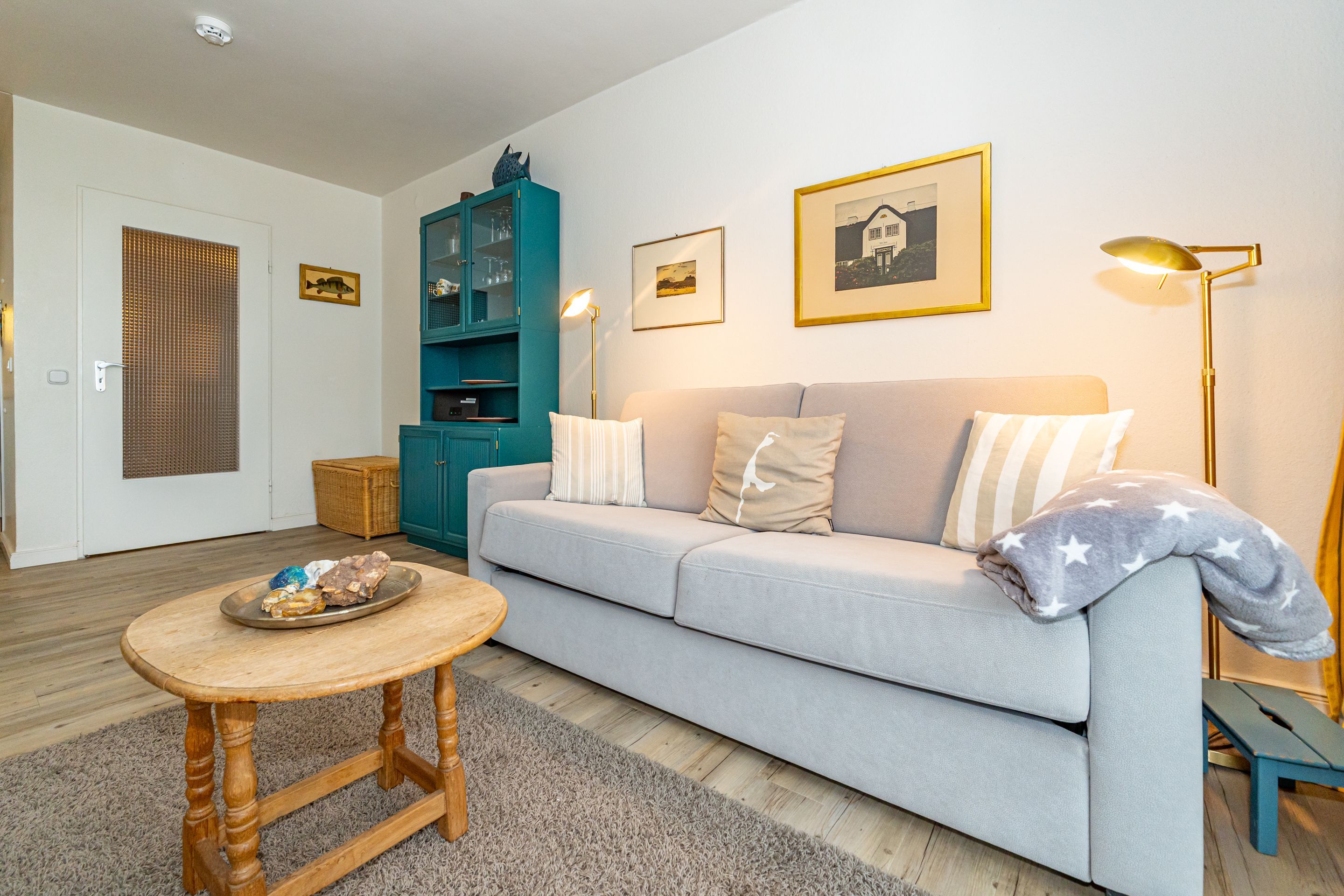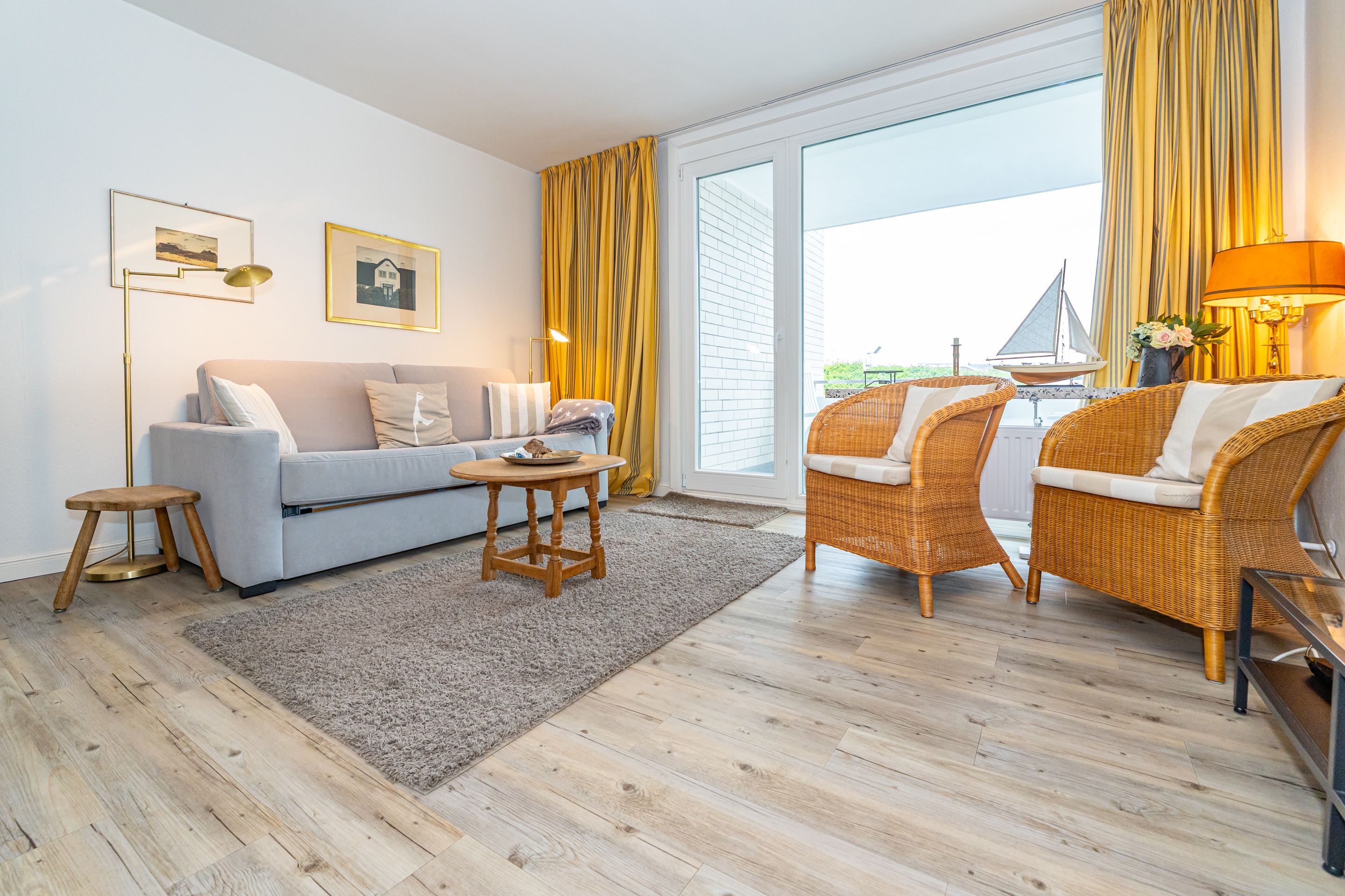 Der Wohnraum hat eine cremefarbene Doppelschlafcouch mit integrierter, guter, durchgehender Matratze in optimaler Liegehöhe (Liegefläche ca. 1,80 x 1,98 m), zwei Korbsessel, einen Essplatz, einen Sat-Flachbild-TV, WLAN und eine offene Küchenzeile.