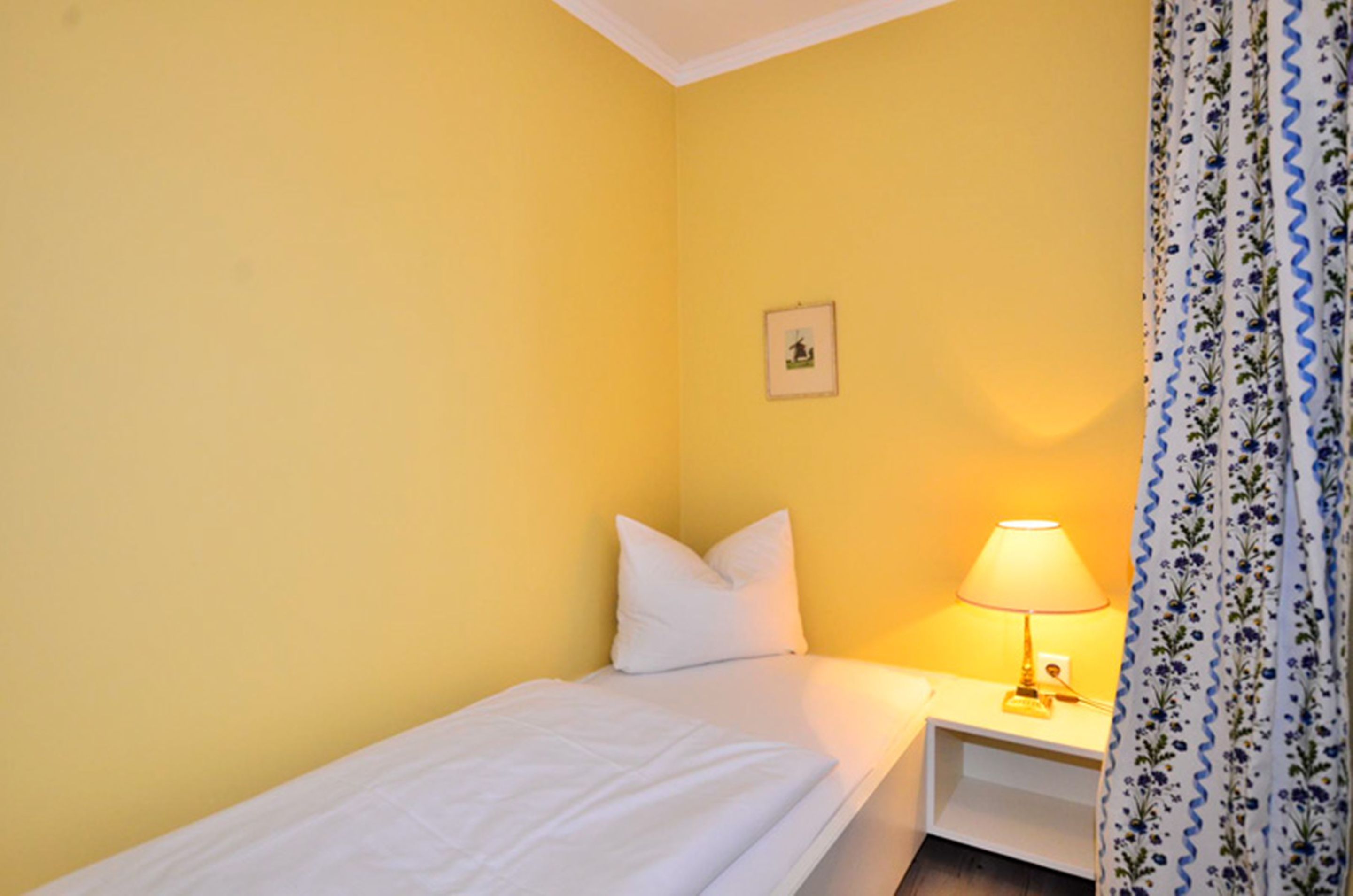 Das kleine Schlafzimmer hat ein Einzelbett und ein Fenster.