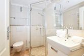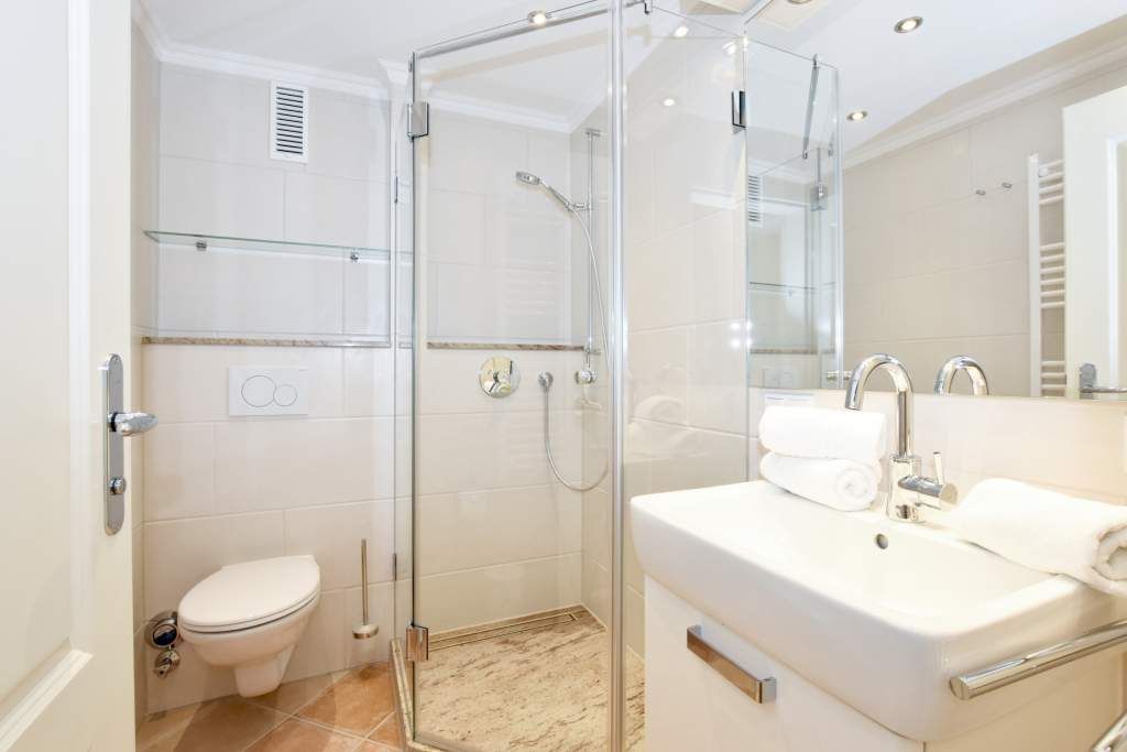 Im Bad befinden sich eine Dusche, ein WC und ein Waschtisch.