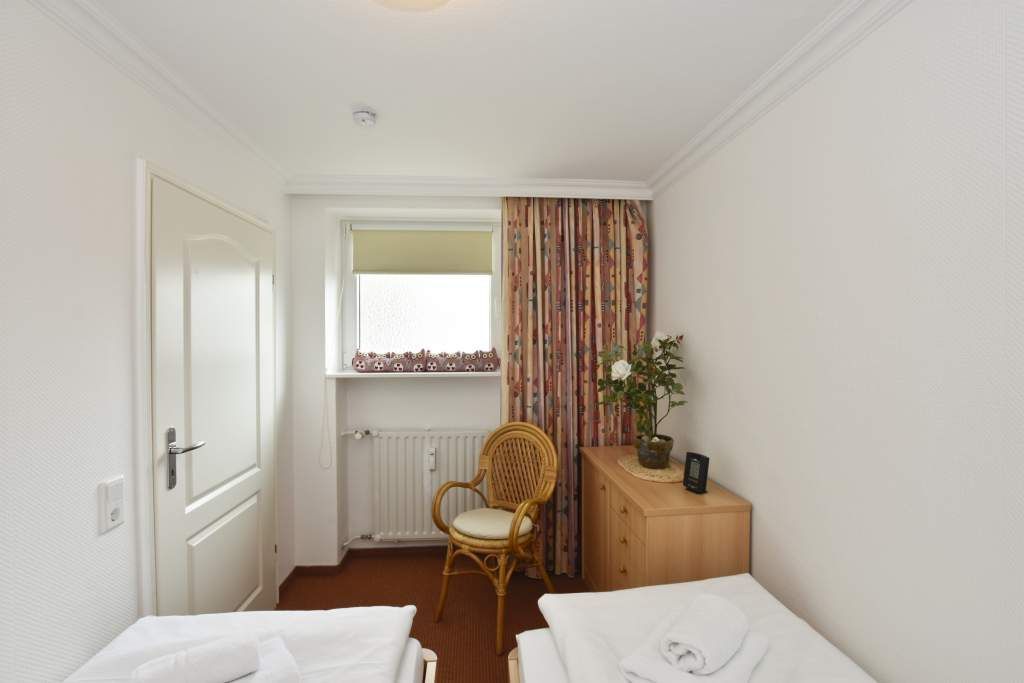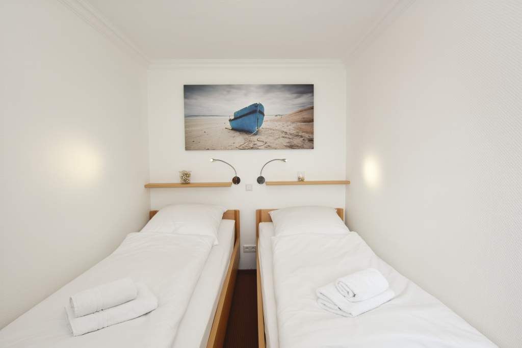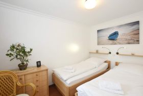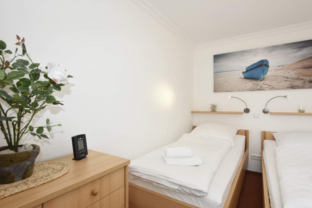 Das Schlafzimmer ist mit zwei auseinander stehenden Einzelbetten.
