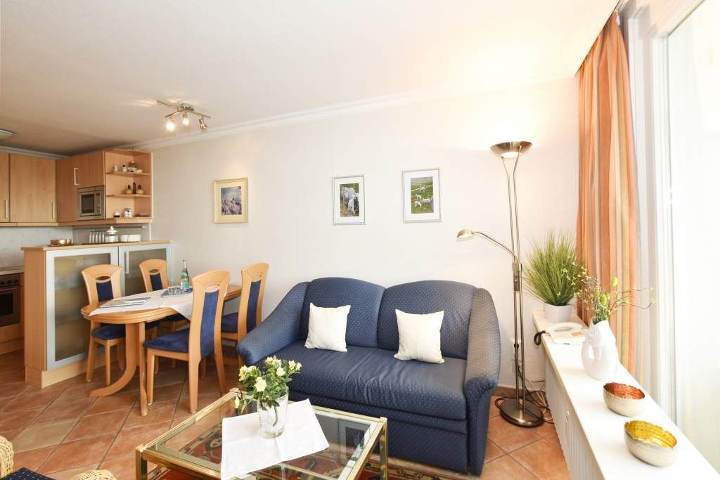 Der Wohnraum besteht aus einer gemütlichen Sitzgarnitur (2-Sitzer-Couch und 2 Korbsessel), einem Essplatz, einem Doppelschrankbett (einzeln ausklappbar), Sat-Flachbild-Fernseher, DVD-Player und Telefon.