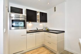 Die offene Küchenzeile ist gut ausgestattet: Geschirrspüler, Mikrowelle, Ceranfeld mit 2 Kochzonen, Kühlschrank mit 3*-Gefrierfach, Kaffeemaschine, Wasserkocher und Toaster stehen bereit.