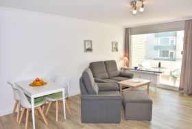 Im Wohnzimmer erwarten Sie eine gemütliche Sitzecke mit 2-Sitzer-Sofa und Sessel, ein Essplatz sowie ein bequemes Doppelschrankbett (ausklappbar, mit getrennten Matratzen). Für Unterhaltung sorgen Sat-TV und Radio. Der angrenzende Südbalkon lädt mit bequemen Balkonmöbeln und Auflagen zu sonnigen Stunden ein.