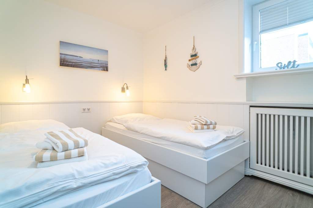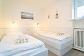 Das Schlafzimmer ist mit zwei auseinander stehenden Einzelbetten und einem Flachbild-TV ausgestattet.