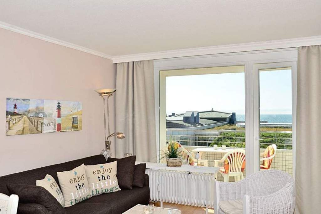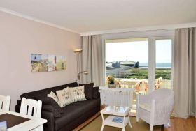 2-Zimmer-Nichtraucher-Ferienwohnung, ca. 54 m², in der 4. Etage zur Seeseite mit tollem Meerblick und sonniger Westloggia (Nachmittags- und Abendsonne, mit Balkonmöbeln und Auflagen) für max. 4 Personen.