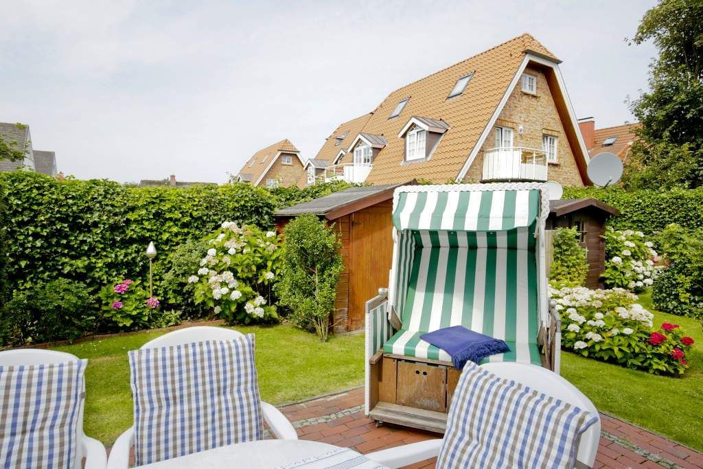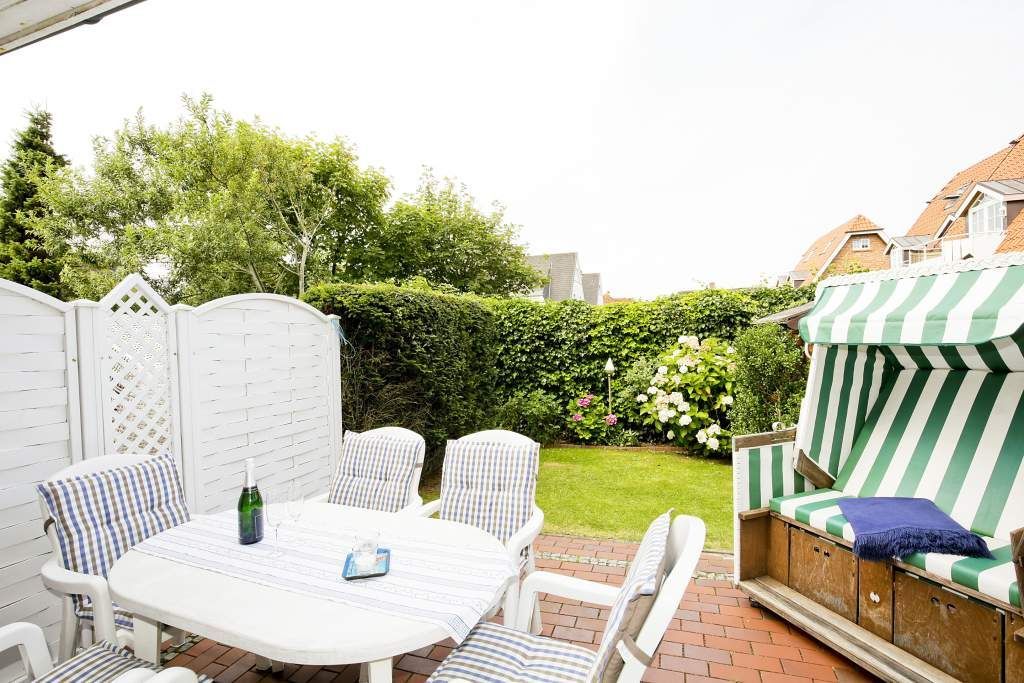 Ein besonderes Highlight ist die sonnige Terrasse mit eigenem Gartenanteil und Strandkorb ideal zum Entspannen nach einem Tag am Meer.