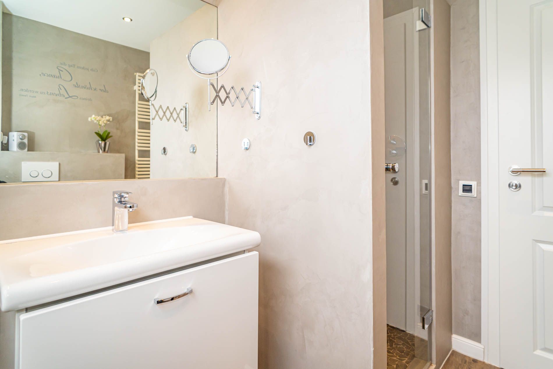 Komplett renoviert. Wohnzimmer mit 2-Sitzer-Schlafcouch, 2 Sessel, Essplatz, Kabel-Flachbild-TV, Telefon inklusive kostenfreier Flatrate ins deutsche Festnetz sowie kostenfreies W-Lan, geräumiger Flur, Schlafzimmer mit Doppelbett (Einzelmatratzen 0,90 x 2,00 m) in Komfort-Liegehöhe (ca. 60 cm) und weiterem Fernseher, separate Küche mit Fenster, Backofen, Geschirrspüler, Kaffeemaschine, Wasserkocher, Toaster und Eierkocher. Modernes, neues Duschbad/WC in Wischputztechnik (Salmea) mit Waschtisch, Handtuchtrockner, Fön und Fußbodenheizung. Großzügige geschützte Südloggia mit komfortablen Hochlehner-Stühlen, PKW-Stellplatz.