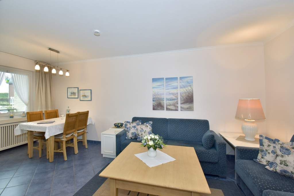 Komfortabel ausgestattete 2-Zimmer-Nichtraucher-Ferienwohnung, ca. 48 qm Hochparterre, (vergleichbar mit 1. Etage) zur Westseite. Schlafzimmer mit 2 Einzelbetten, Wohnzimmer mit Doppelschlafcouch (ca. 170x200 cm), Essplatz, Kabel-Flachbild-TV, Telefon mit Telefonflatrate ins deutsche Festnetz, WLan, großzügiger Westbalkon, Küche mit Geschirrspüler, Backofen und Ceranfeld, Kaffeemaschine, Wasserkocher und Toaster gehören zur Grundausstattung, Duschbad/WC.