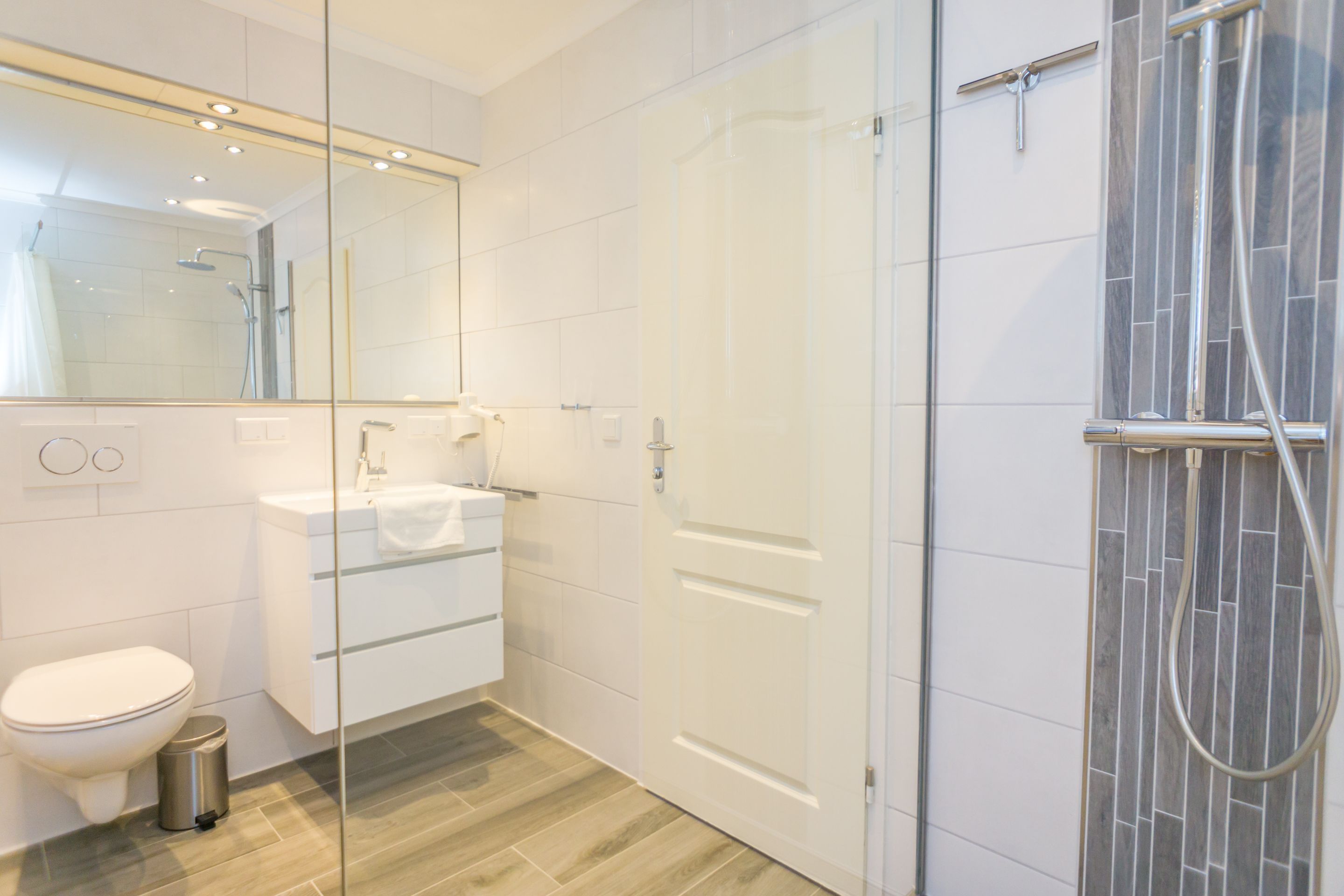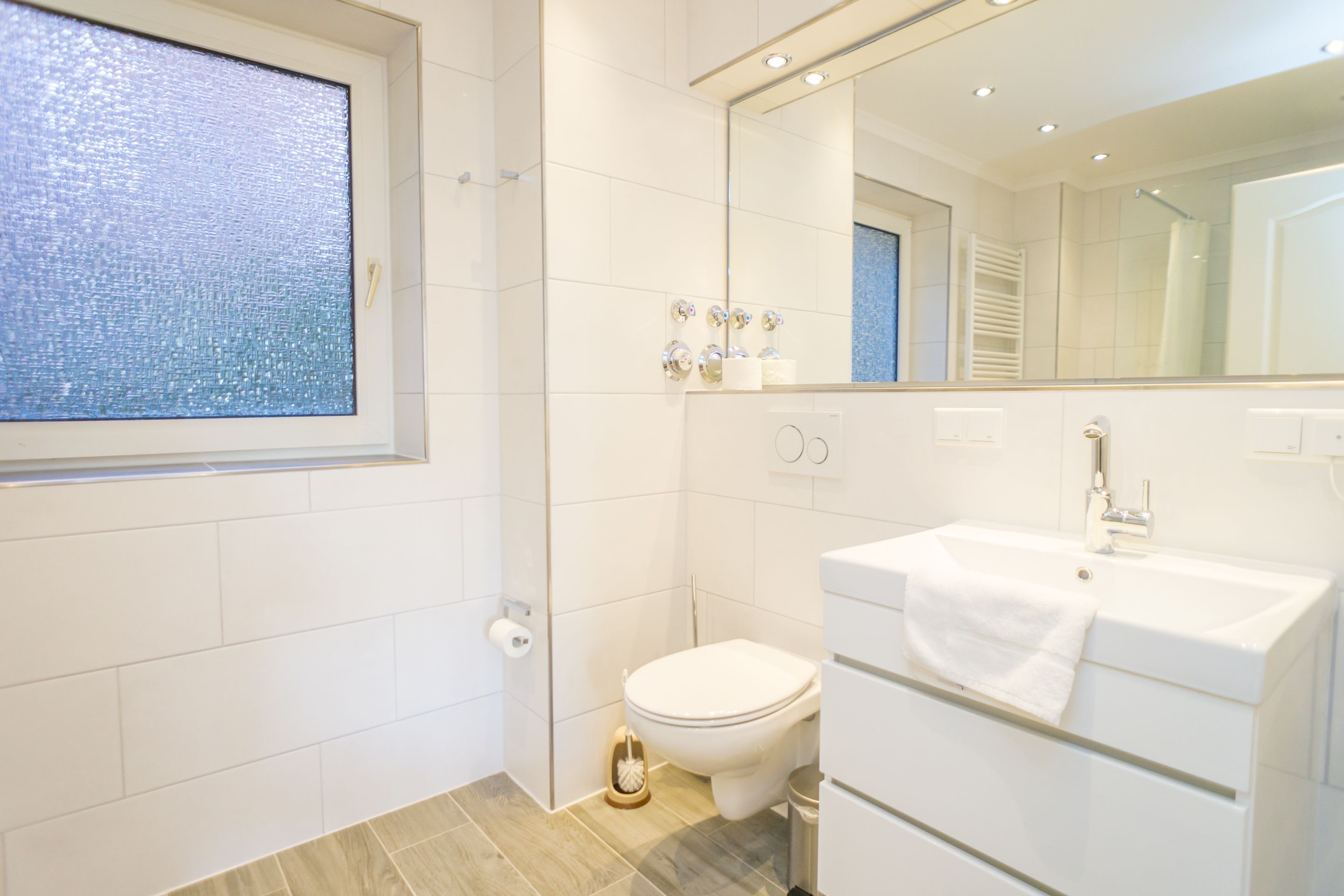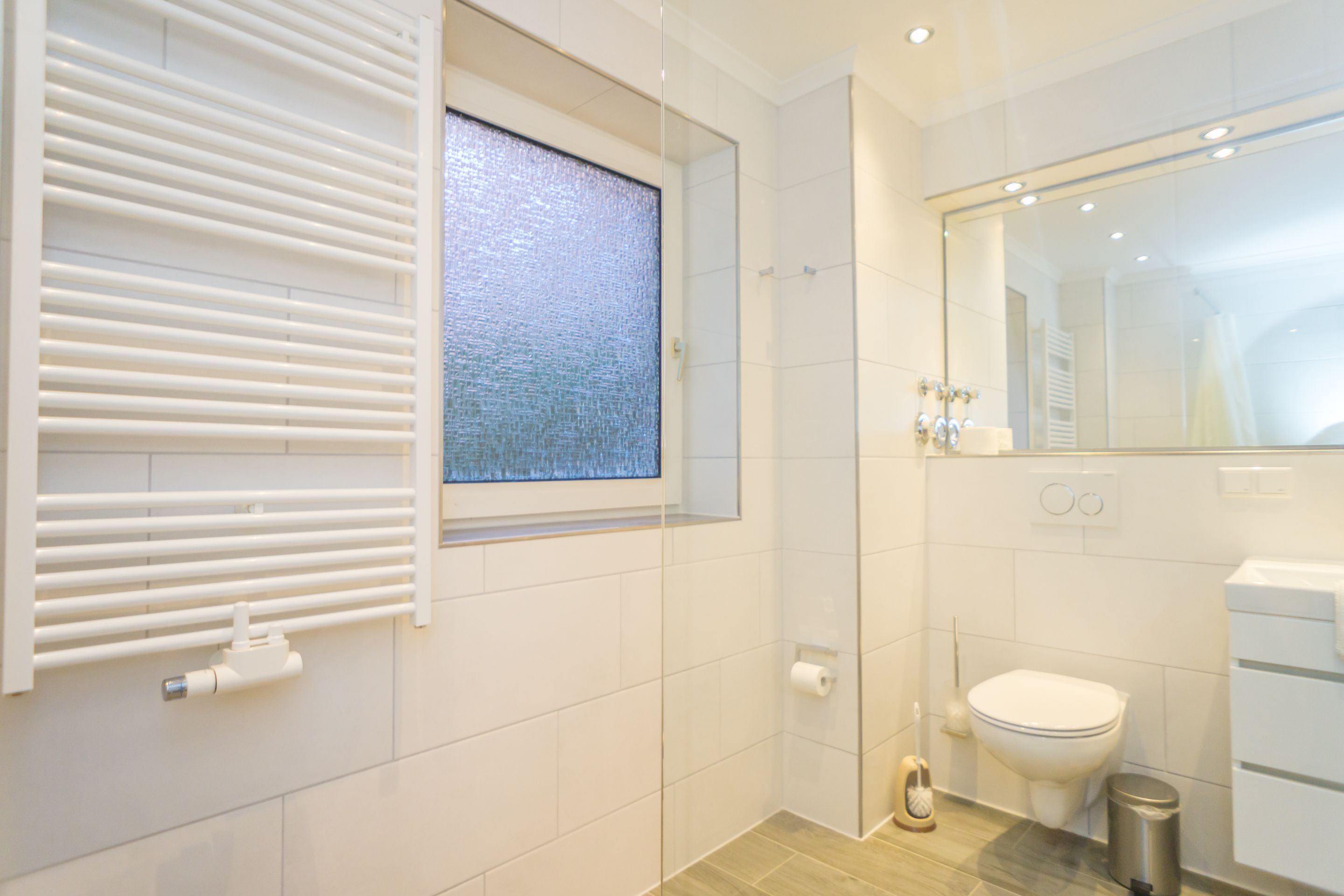 Das neue Badezimmer hat ein Dusche mit extraflachem Einstieg, einen Waschtisch, einen Handtuchtrockner und ein Fenster.