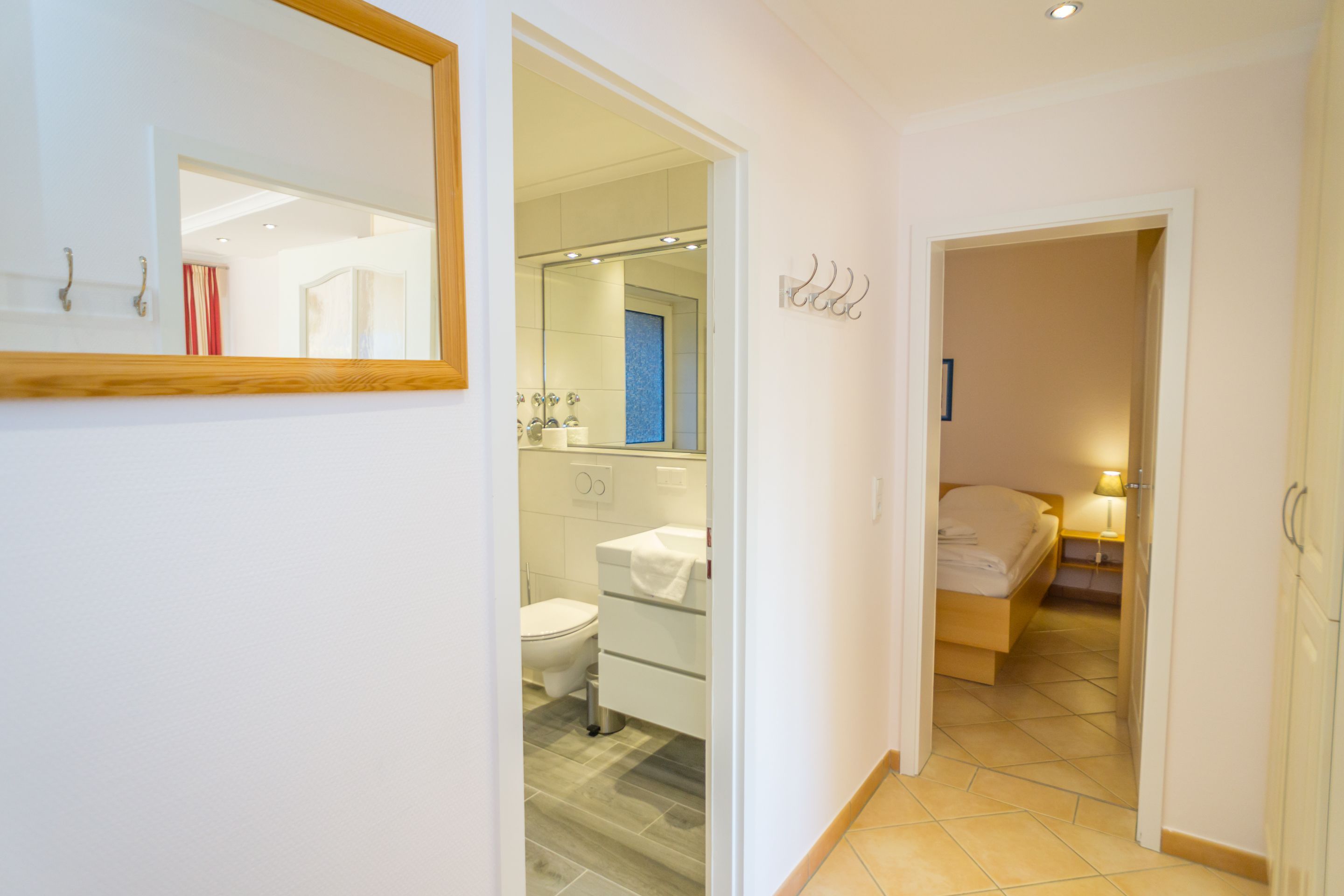 Vom Vorflur mit Garderobe gelangt man in das Wohnzimmer, Schlafzimmer und Duschbad/WC.