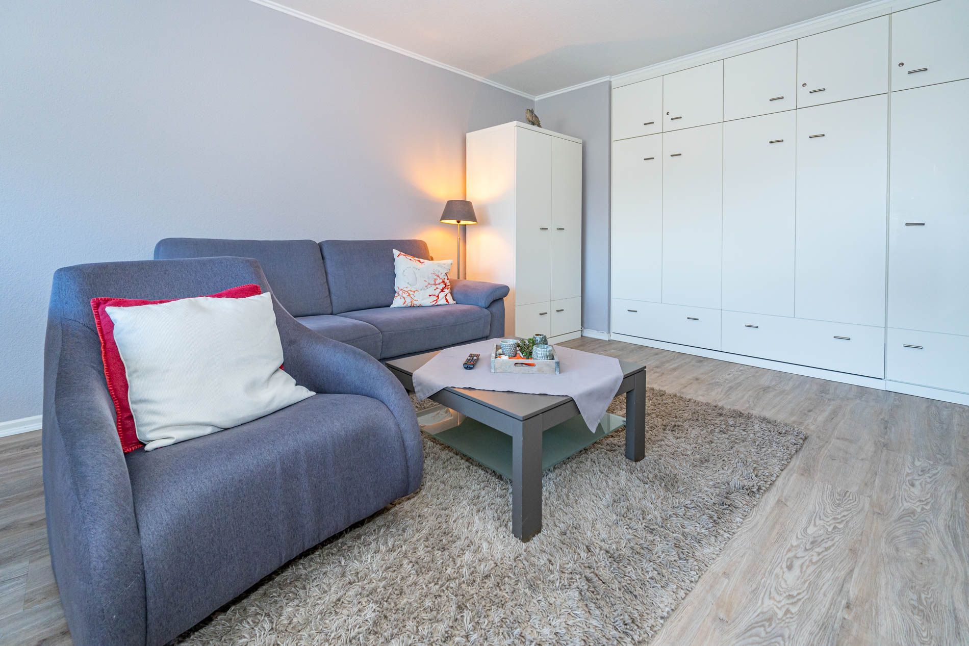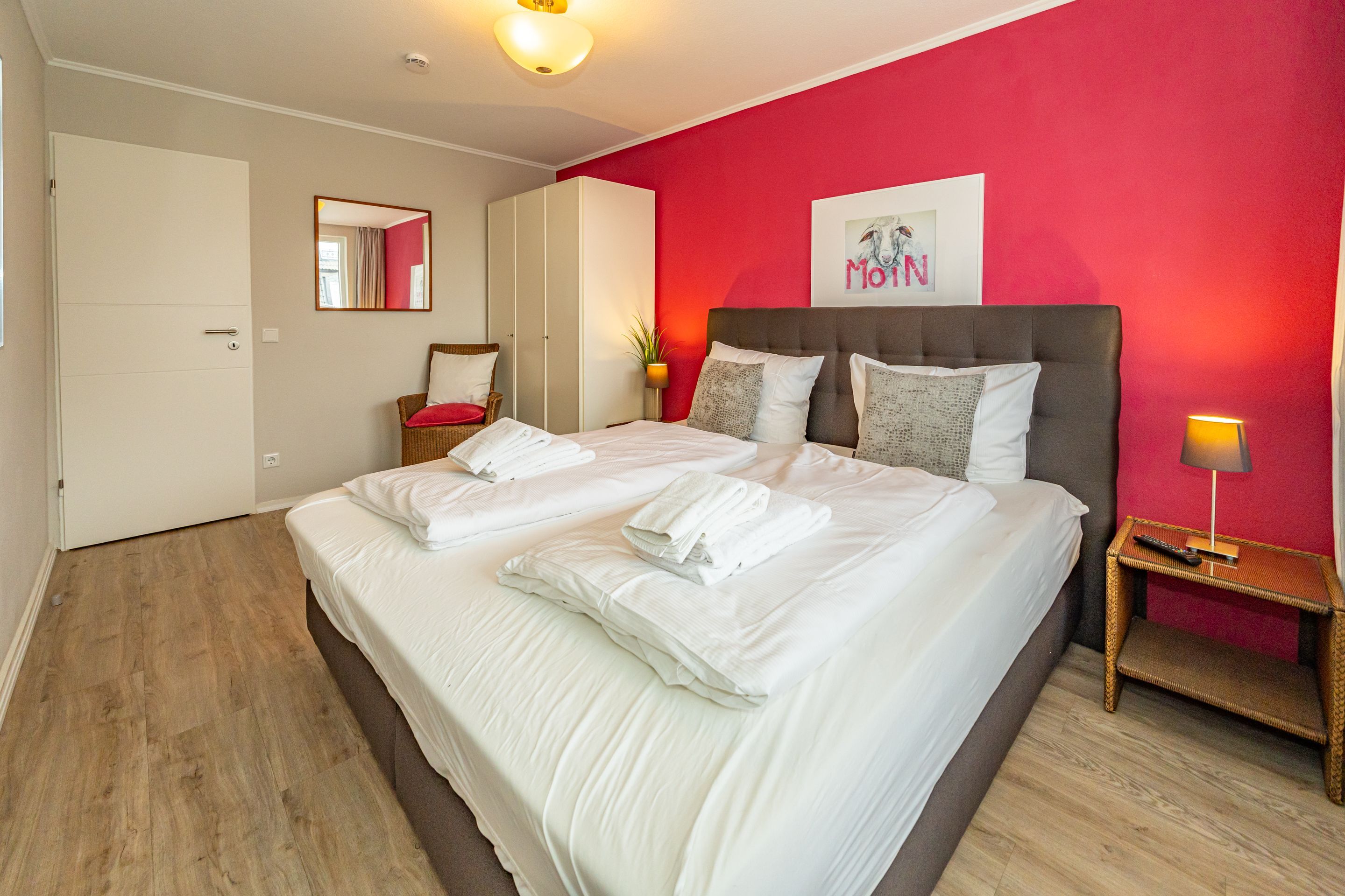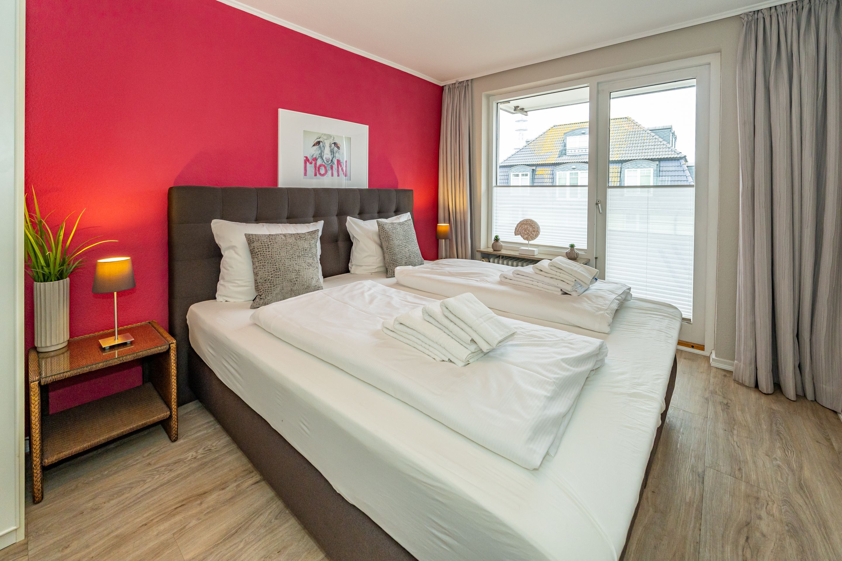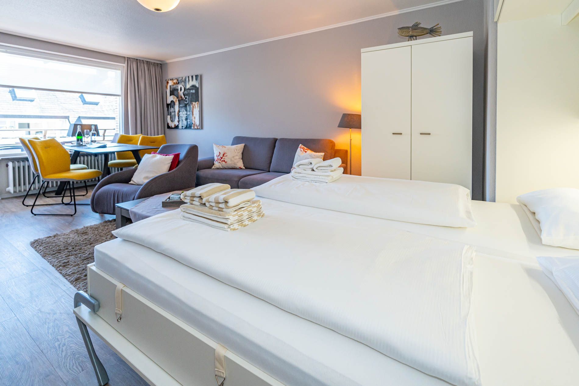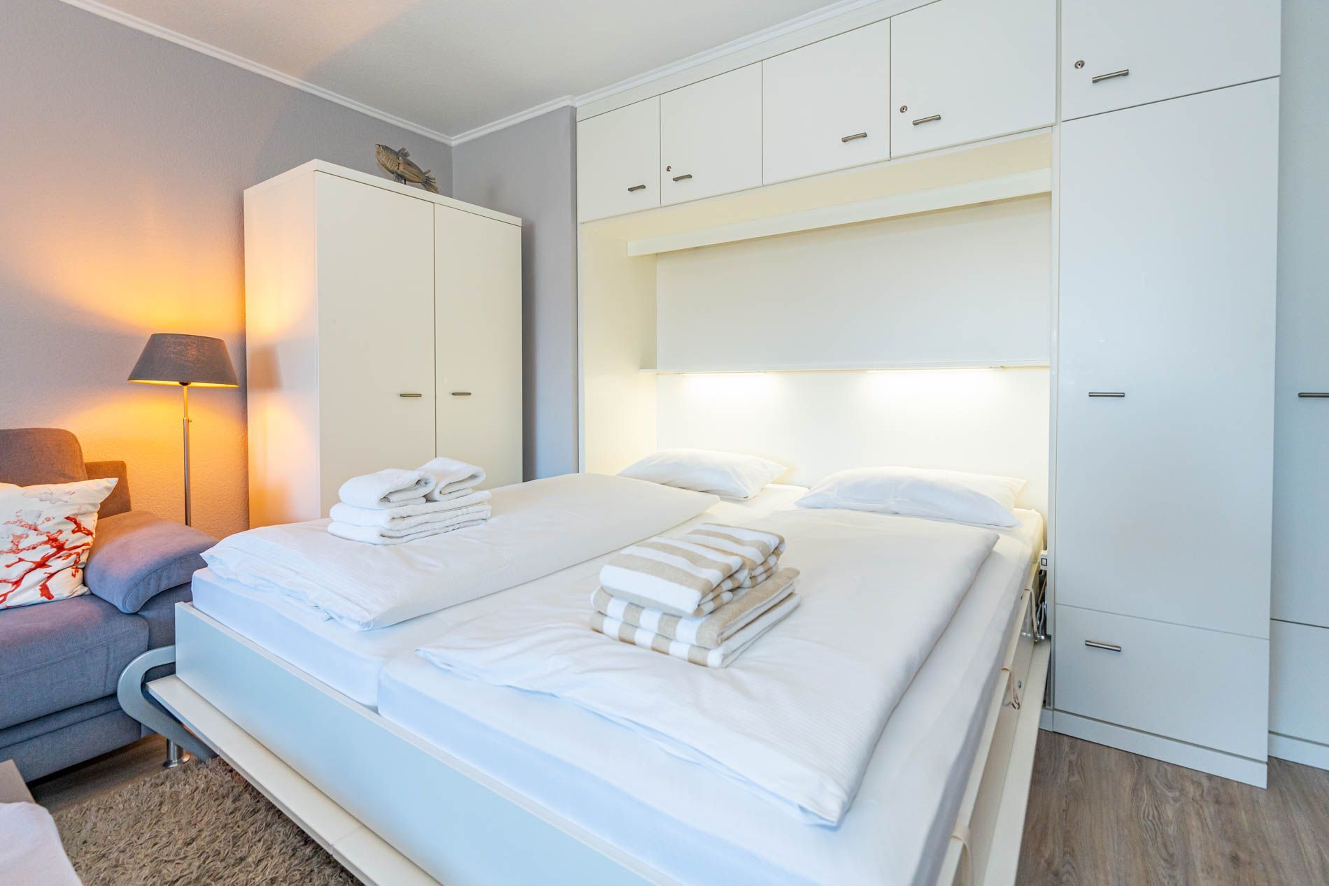 Diese moderne 2-Zimmer-Nichtraucher-Ferienwohnung (ca. 58 qm) in der 2. Etage bietet komfortablen Wohnraum für bis zu 4 Personen. Im Schlafzimmer erwartet Sie ein gemütliches Doppelbett, bestehend aus zwei Einzelmatratzen (je 0,90 x 2,00 m), ergänzt durch stilvolle Nachttische und einen eleganten Sessel in Loom-Ausführung. Das Wohnzimmer überzeugt mit Doppelschrankbetten (je mit Einzelmatratzen von 1,70 x 0,90 m), einem Sat-Flachbild-TV, Telefon und WLAN ideal für flexible Schlafmöglichkeiten und entspannte Abende. Die offene Küche, die ohne trennende Tür direkt in den Wohnbereich integriert ist und über ein Fenster verfügt, lässt keine Wünsche offen: Ausgestattet mit Backofen, Cerankochfeld, Kühlschrank mit Eisfach, Geschirrspüler, Kaffeemaschine, Wasserkocher und Toaster, bietet sie alles, was Sie für die Zubereitung Ihrer Lieblingsgerichte benötigen. Das moderne Duschbad/WC rundet das Raumkonzept ab.