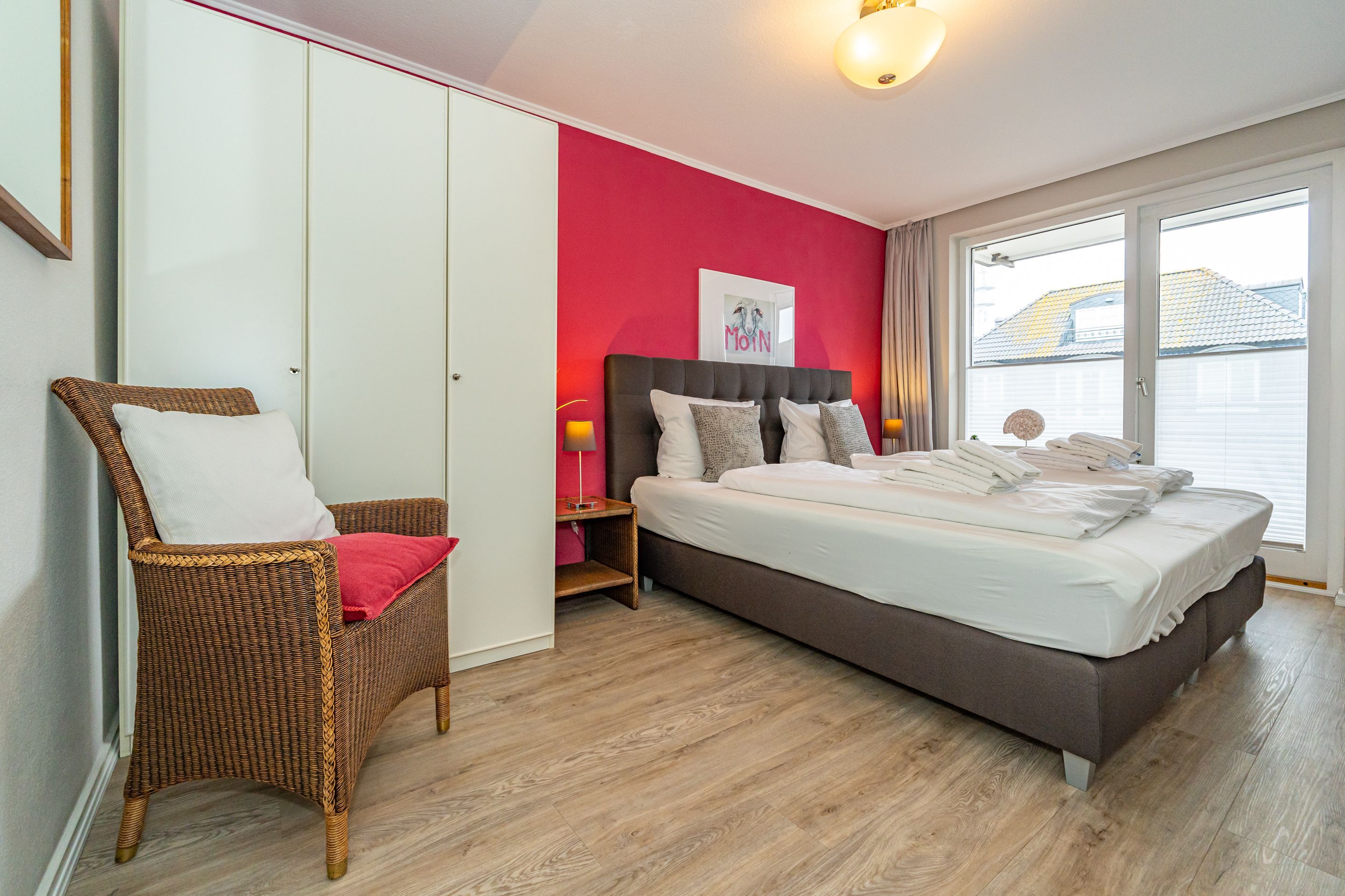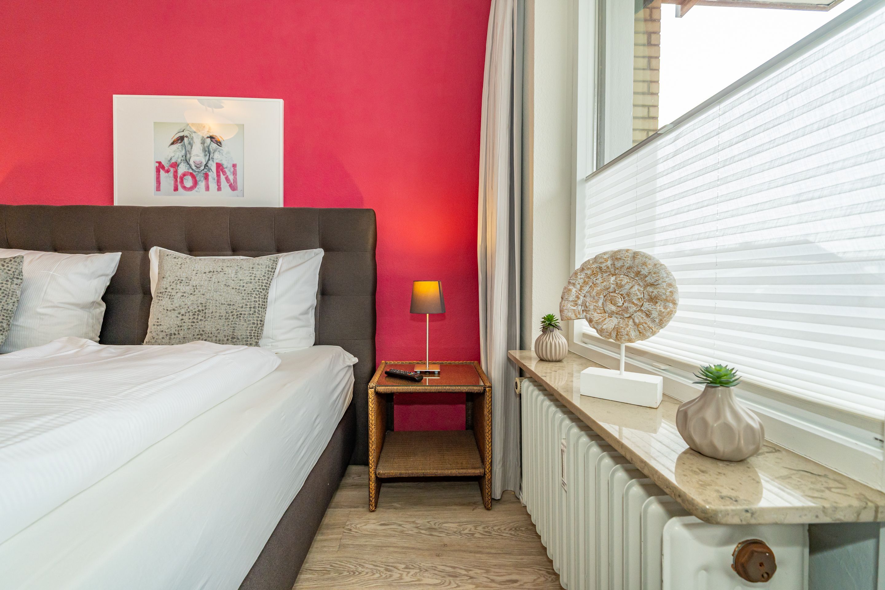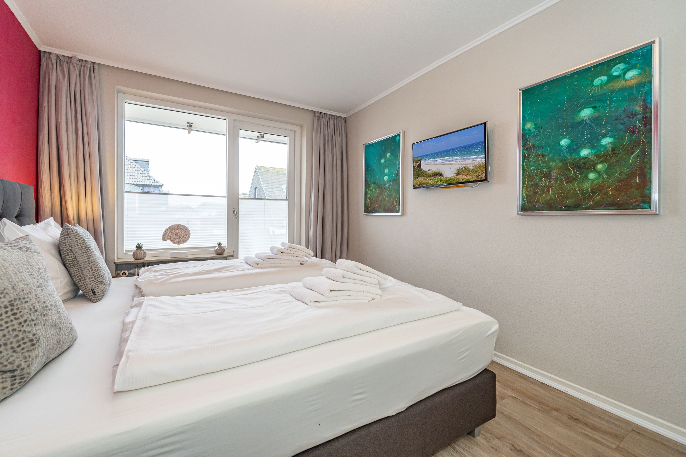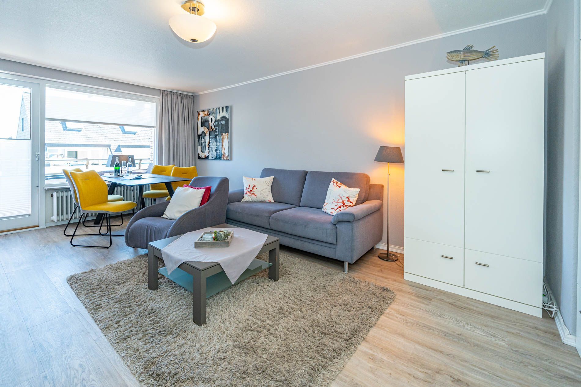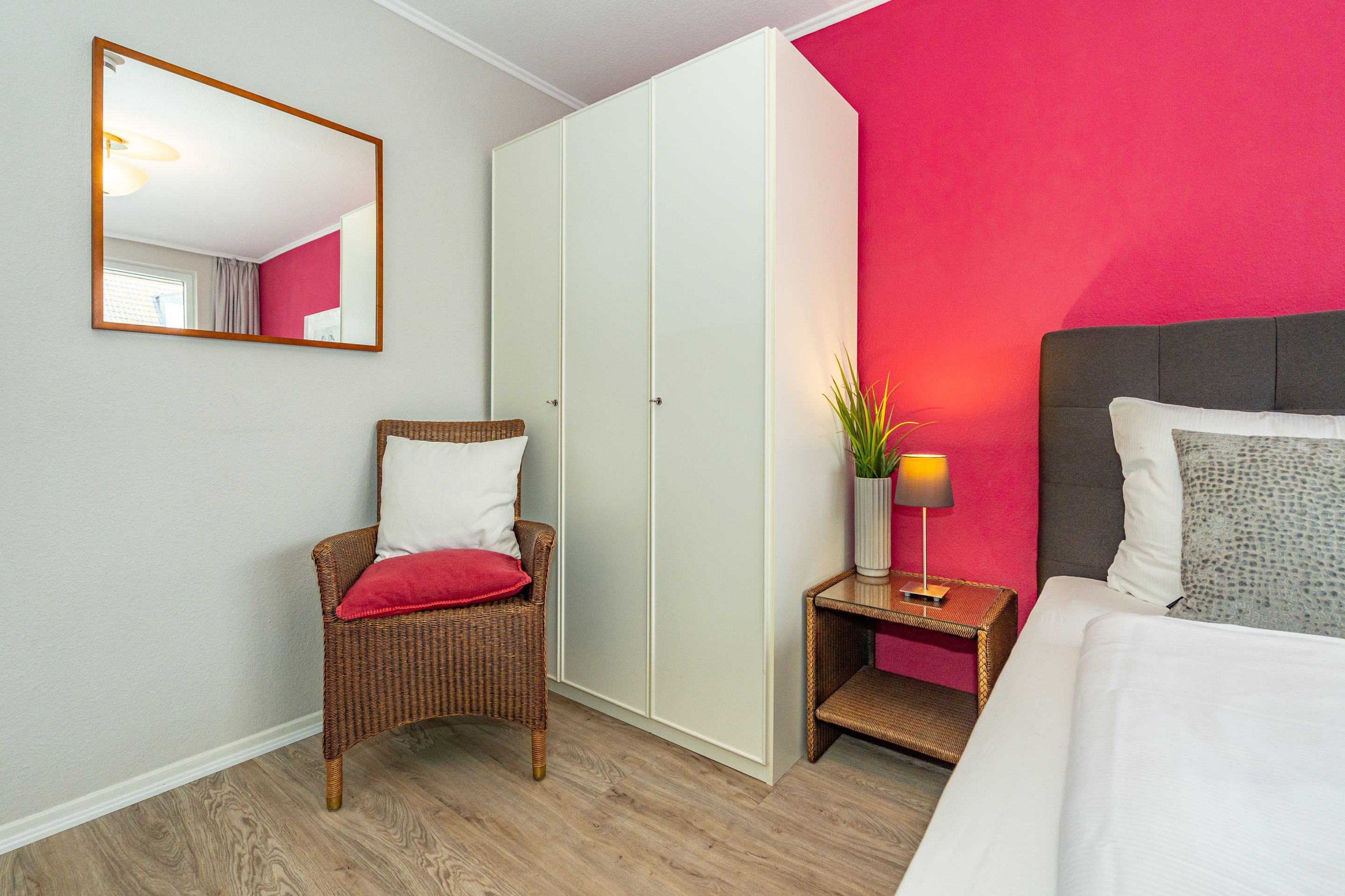 Diese moderne 2-Zimmer-Nichtraucher-Ferienwohnung (ca. 58 qm) in der 2. Etage bietet komfortablen Wohnraum für bis zu 4 Personen. Im Schlafzimmer erwartet Sie ein gemütliches Doppelbett, bestehend aus zwei Einzelmatratzen (je 0,90 x 2,00 m), ergänzt durch stilvolle Nachttische und einen eleganten Sessel in Loom-Ausführung. Das Wohnzimmer überzeugt mit Doppelschrankbetten (je mit Einzelmatratzen von 1,70 x 0,90 m), einem Sat-Flachbild-TV, Telefon und WLAN ideal für flexible Schlafmöglichkeiten und entspannte Abende. Die offene Küche, die ohne trennende Tür direkt in den Wohnbereich integriert ist und über ein Fenster verfügt, lässt keine Wünsche offen: Ausgestattet mit Backofen, Cerankochfeld, Kühlschrank mit Eisfach, Geschirrspüler, Kaffeemaschine, Wasserkocher und Toaster, bietet sie alles, was Sie für die Zubereitung Ihrer Lieblingsgerichte benötigen. Das moderne Duschbad/WC rundet das Raumkonzept ab.