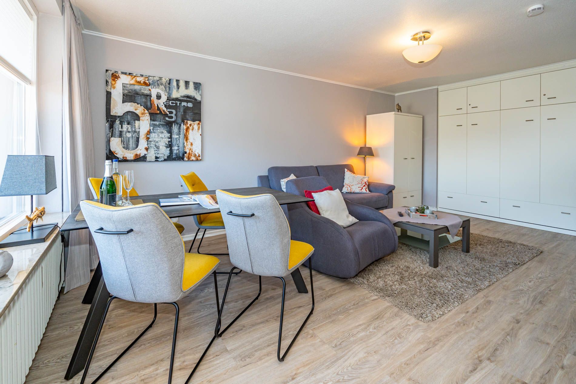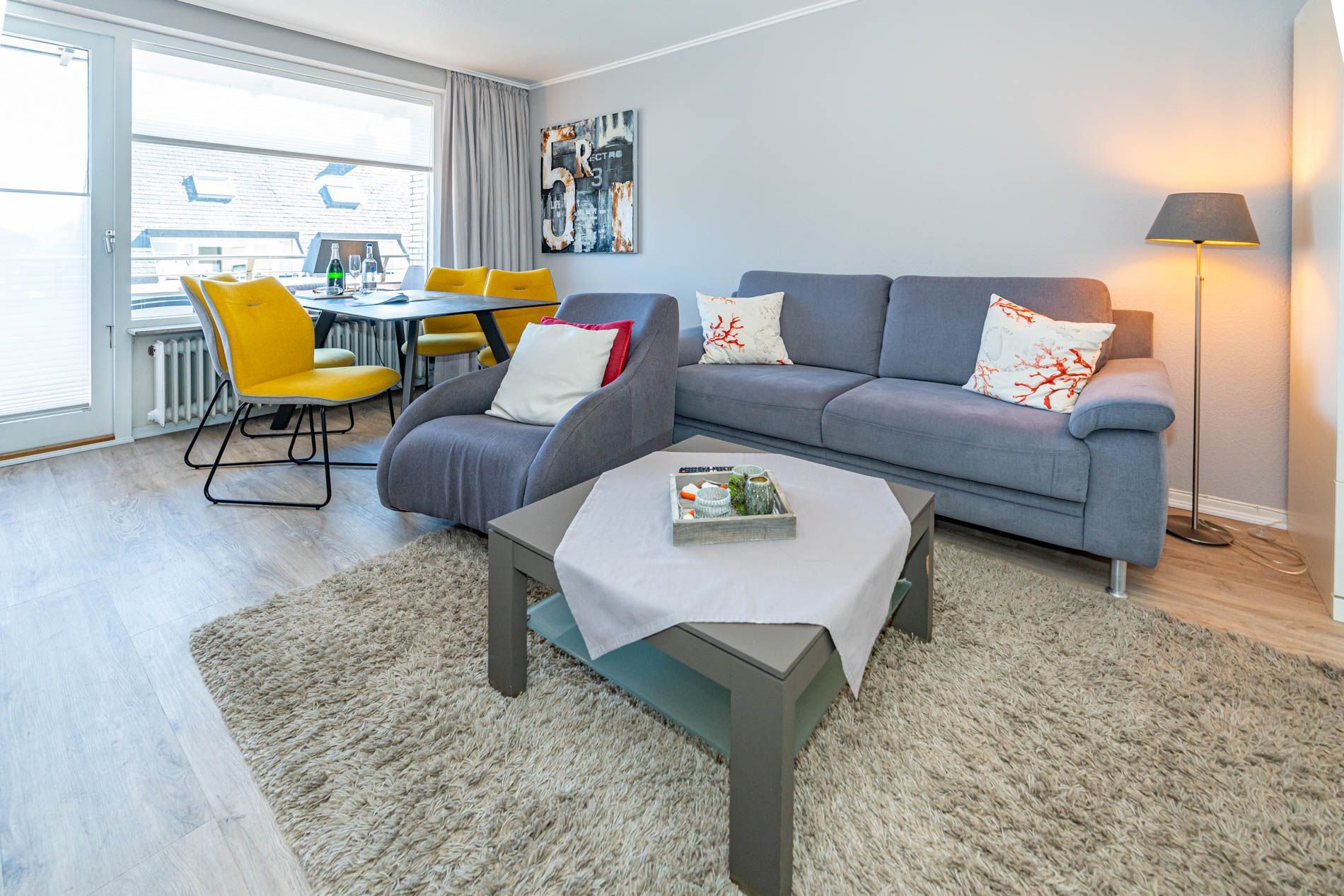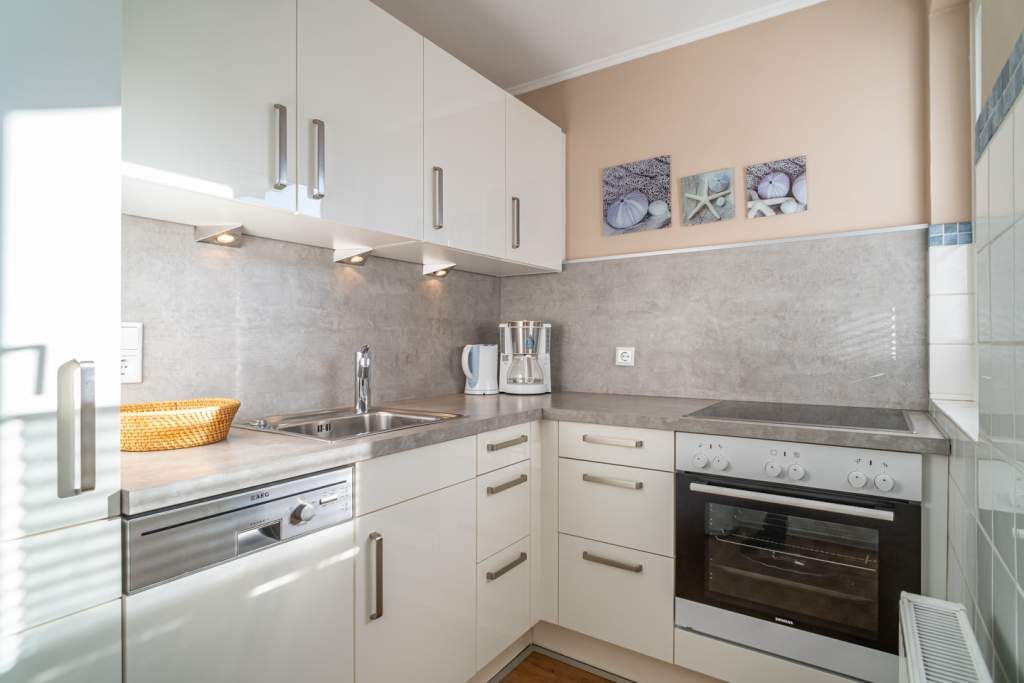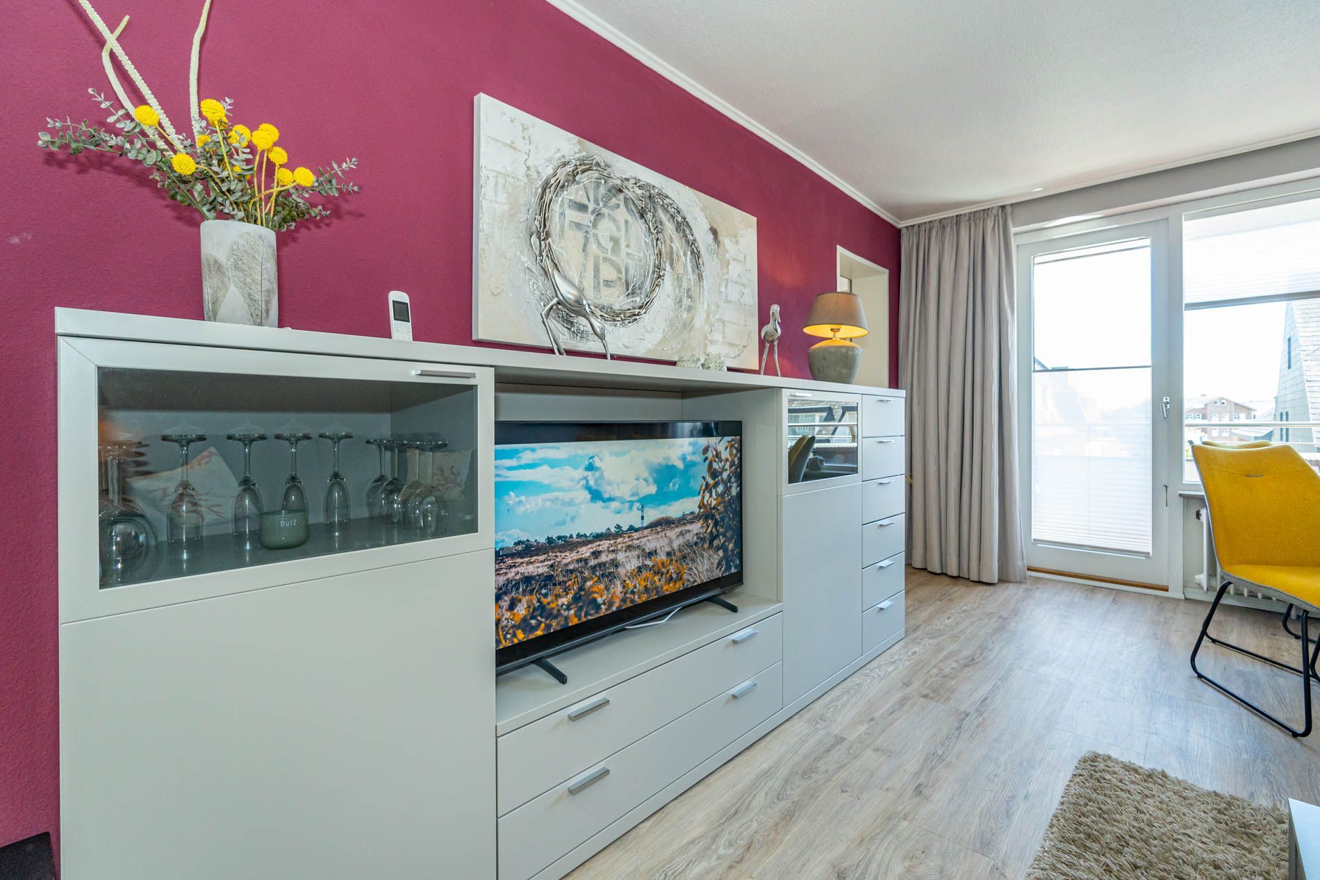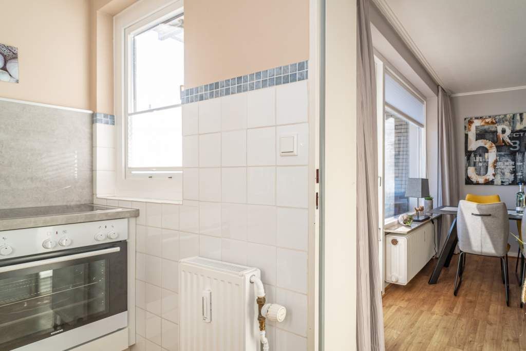 Diese moderne 2-Zimmer-Nichtraucher-Ferienwohnung (ca. 58 qm) in der 2. Etage bietet komfortablen Wohnraum für bis zu 4 Personen. Im Schlafzimmer erwartet Sie ein gemütliches Doppelbett, bestehend aus zwei Einzelmatratzen (je 0,90 x 2,00 m), ergänzt durch stilvolle Nachttische und einen eleganten Sessel in Loom-Ausführung. Das Wohnzimmer überzeugt mit Doppelschrankbetten (je mit Einzelmatratzen von 1,70 x 0,90 m), einem Sat-Flachbild-TV, Telefon und WLAN ideal für flexible Schlafmöglichkeiten und entspannte Abende. Die offene Küche, die ohne trennende Tür direkt in den Wohnbereich integriert ist und über ein Fenster verfügt, lässt keine Wünsche offen: Ausgestattet mit Backofen, Cerankochfeld, Kühlschrank mit Eisfach, Geschirrspüler, Kaffeemaschine, Wasserkocher und Toaster, bietet sie alles, was Sie für die Zubereitung Ihrer Lieblingsgerichte benötigen. Das moderne Duschbad/WC rundet das Raumkonzept ab.