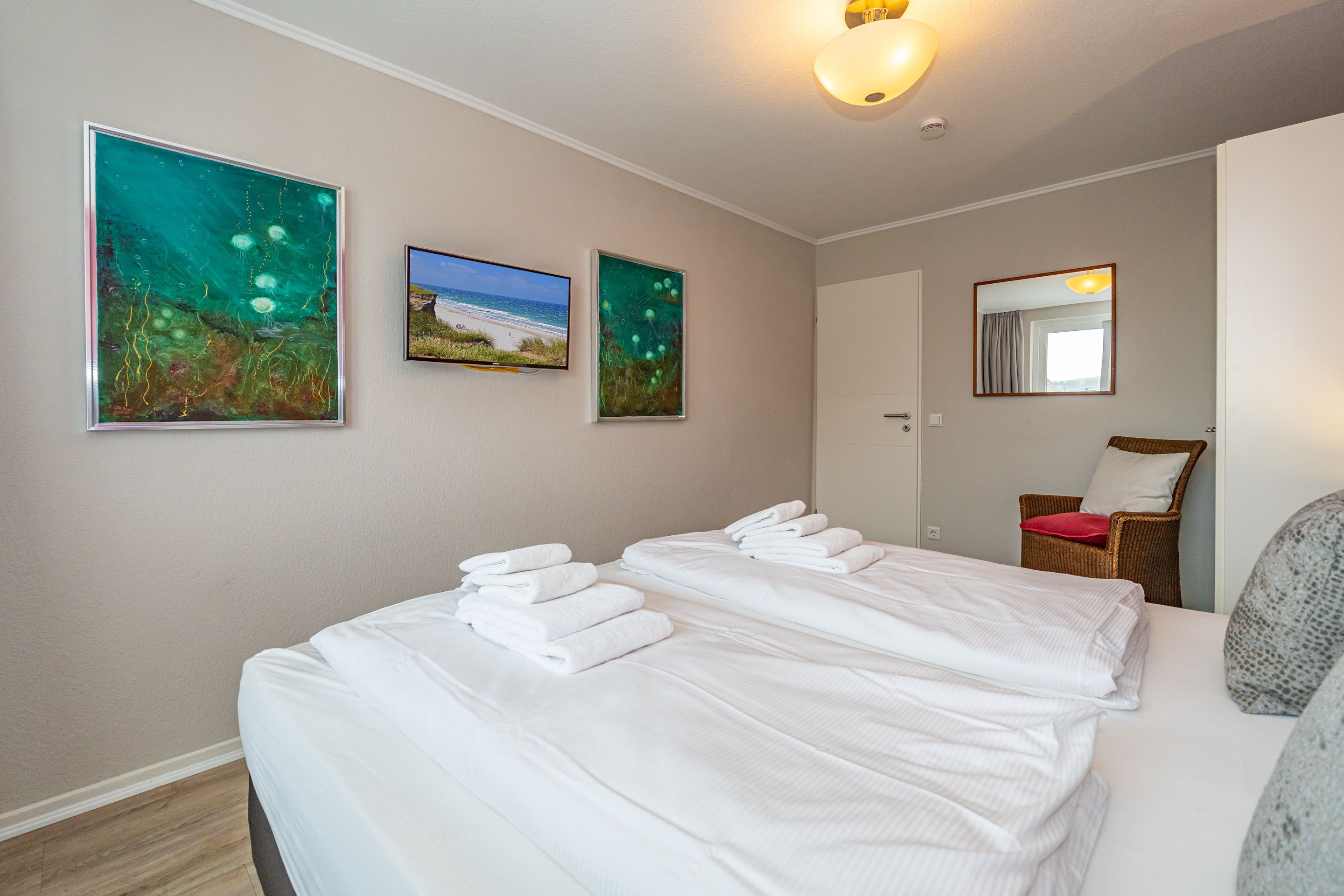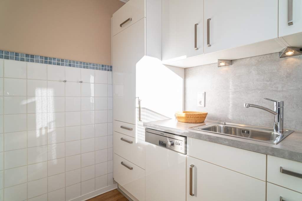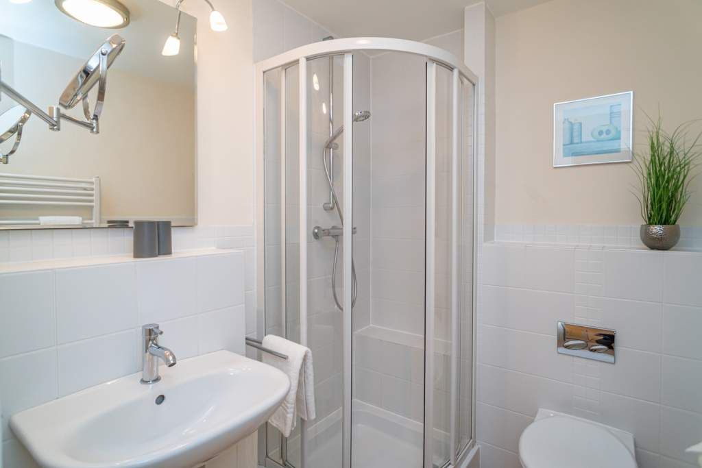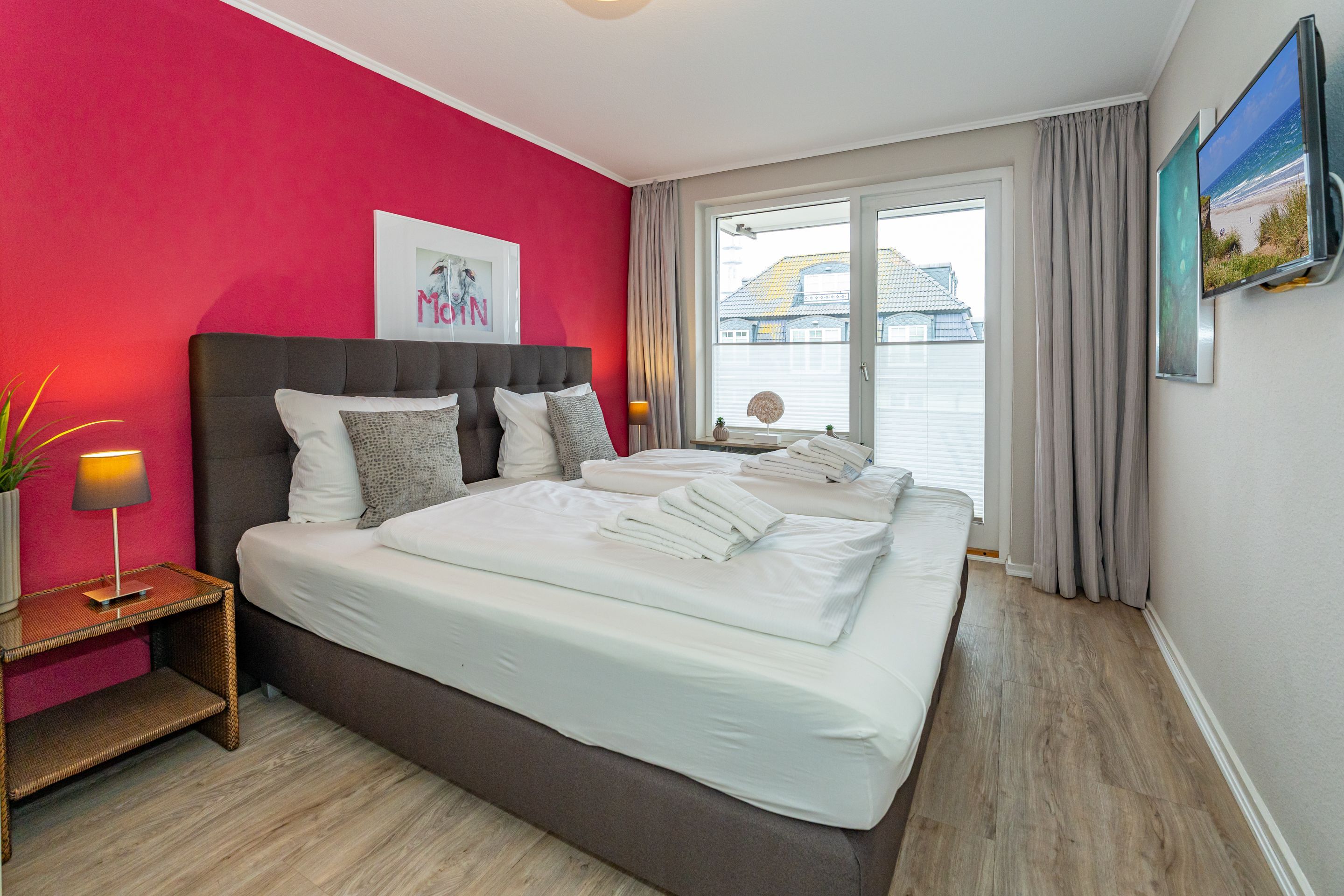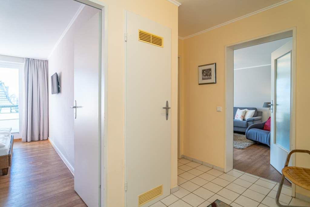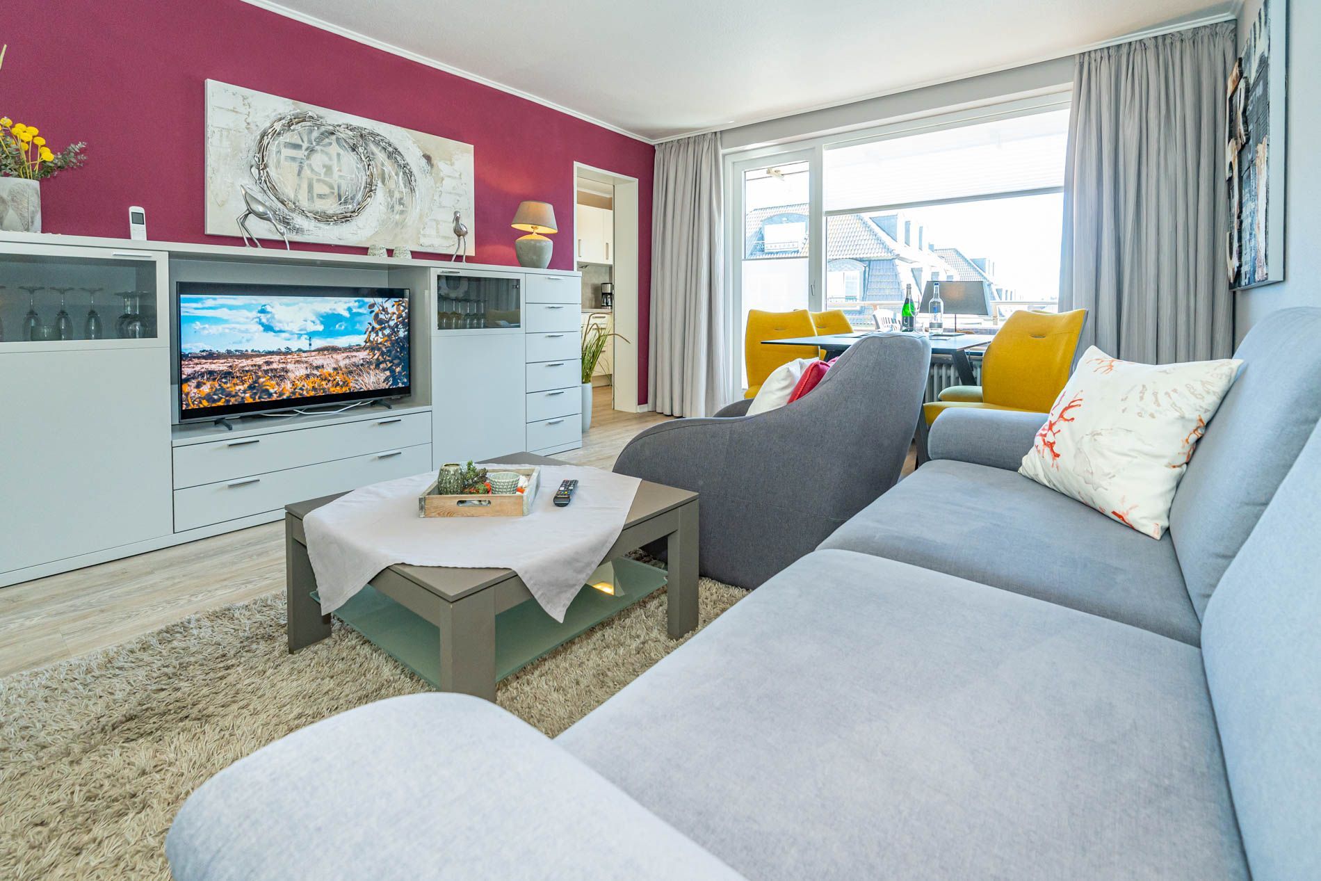 Diese moderne 2-Zimmer-Nichtraucher-Ferienwohnung (ca. 58 qm) in der 2. Etage bietet komfortablen Wohnraum für bis zu 4 Personen. Im Schlafzimmer erwartet Sie ein gemütliches Doppelbett, bestehend aus zwei Einzelmatratzen (je 0,90 x 2,00 m), ergänzt durch stilvolle Nachttische und einen eleganten Sessel in Loom-Ausführung. Das Wohnzimmer überzeugt mit Doppelschrankbetten (je mit Einzelmatratzen von 1,70 x 0,90 m), einem Sat-Flachbild-TV, Telefon und WLAN ideal für flexible Schlafmöglichkeiten und entspannte Abende. Die offene Küche, die ohne trennende Tür direkt in den Wohnbereich integriert ist und über ein Fenster verfügt, lässt keine Wünsche offen: Ausgestattet mit Backofen, Cerankochfeld, Kühlschrank mit Eisfach, Geschirrspüler, Kaffeemaschine, Wasserkocher und Toaster, bietet sie alles, was Sie für die Zubereitung Ihrer Lieblingsgerichte benötigen. Das moderne Duschbad/WC rundet das Raumkonzept ab.