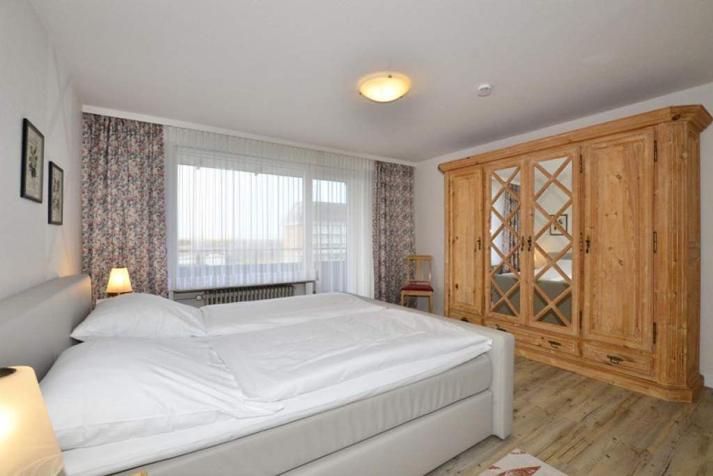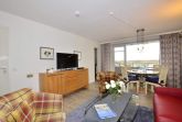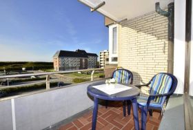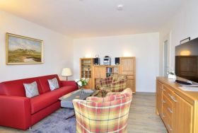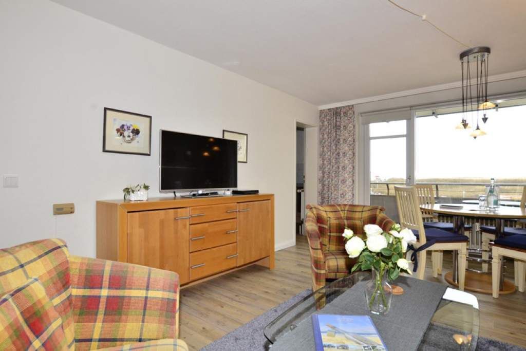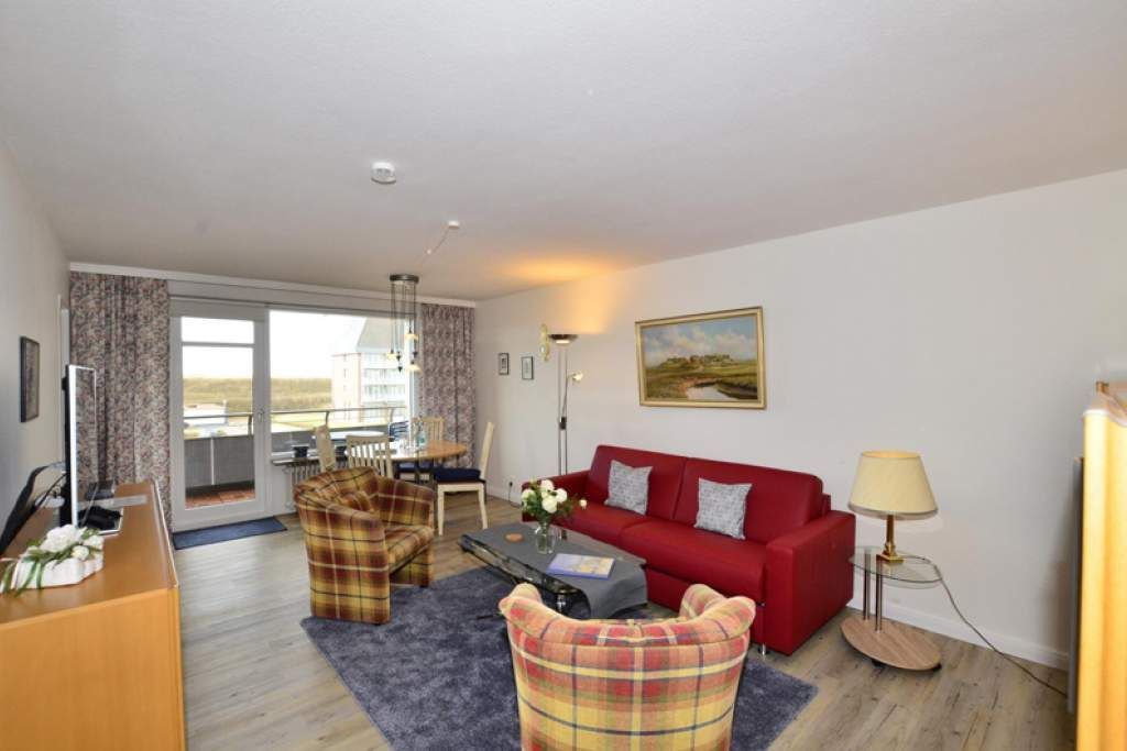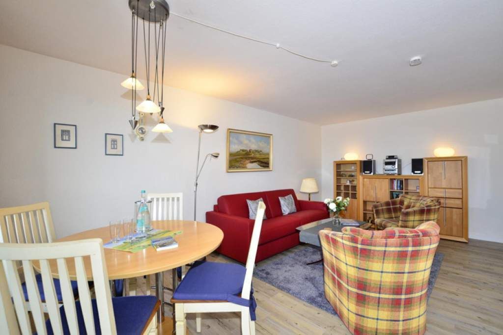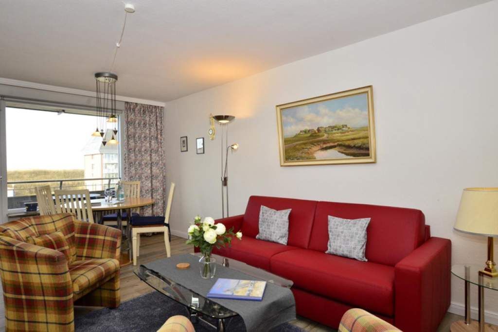 Der Wohnraum besteht aus einer bequemen Sitzgarnitur (2-Sitzer-Schlafcouch, 1,60 x 1,90 m und zwei Sesseln), einem Essplatz (direkt an der großen West-Fensterfront mit Dünenblick), Sat-TV, HiFi-Anlage, W-Lan und Zugang zur Westloggia.