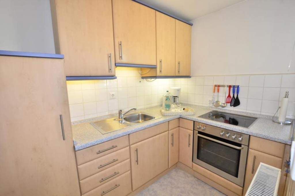 Die Küche hat einen Backofen, ein Cerankochfeld und einen Kühlschrank mit 3-Sterne-Gefrierfach.