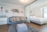 Vom Vorflur (mit Garderobe) gelangt man in das kombinierte Wohn-/Schlafzimmer (mit Austritt zum Balkon), die offene Einbauküche und in das großzügige Duschbad/WC.