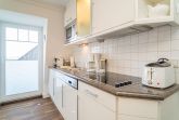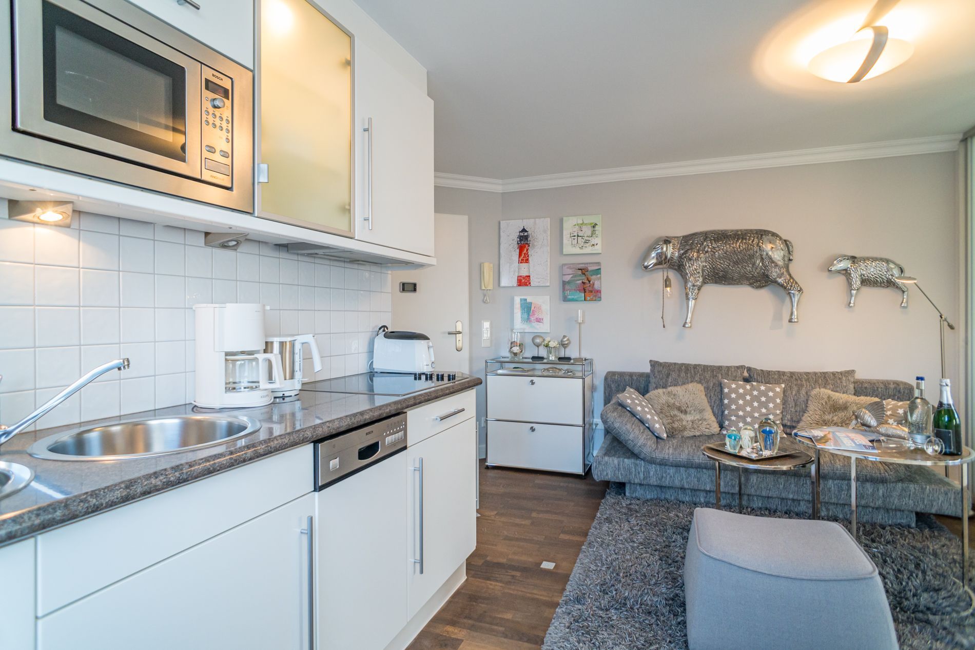 Die offene Küche hat einen Geschirrspüler, eine Mikrowellen-Backofen-Kombi, ein Cerankochfeld und einen Kühlschrank mit 3*-Gefrierfach. Kaffeemaschine, Wasserkocher und Toaster gehören zur Grundausstattung.