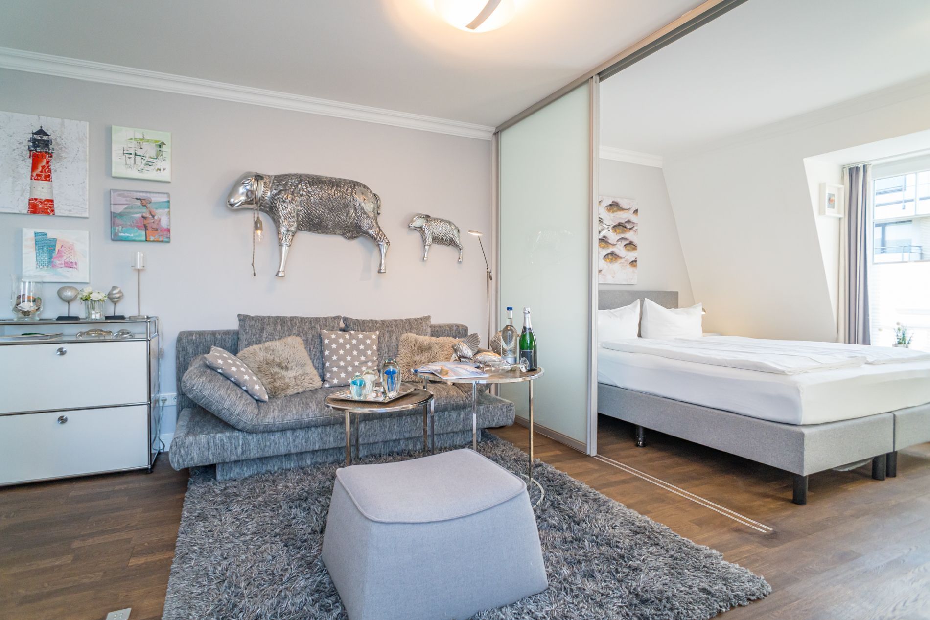 Der Wohn-/Schlafraum ist mit einer gemütlichen Sitzgarnitur, einem hochwertigen Boxspringbett (Liegefläche 1,60 x 2 m, mit zwei Einzelmatratzen und durchgehendem Topper), Flachbild-TV, HiFi-Anlage, Telefon inklusive Flatrate für Gespräche ins deutsche Festnetz (Handynummern gesperrt) und W-Lan ausgestattet.