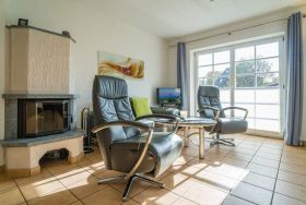 Das Wohnzimmer hat eine komfortable, cremefarbene Ledergarnitur mit zwei Sesseln, einen eigenen Kamin, einen großzügigen Essplatz, Sat-Flachbild-TV, Stereoanlage, Telefon (kostenfrei ins deutsche Festnetz), kostenfreies WLAN