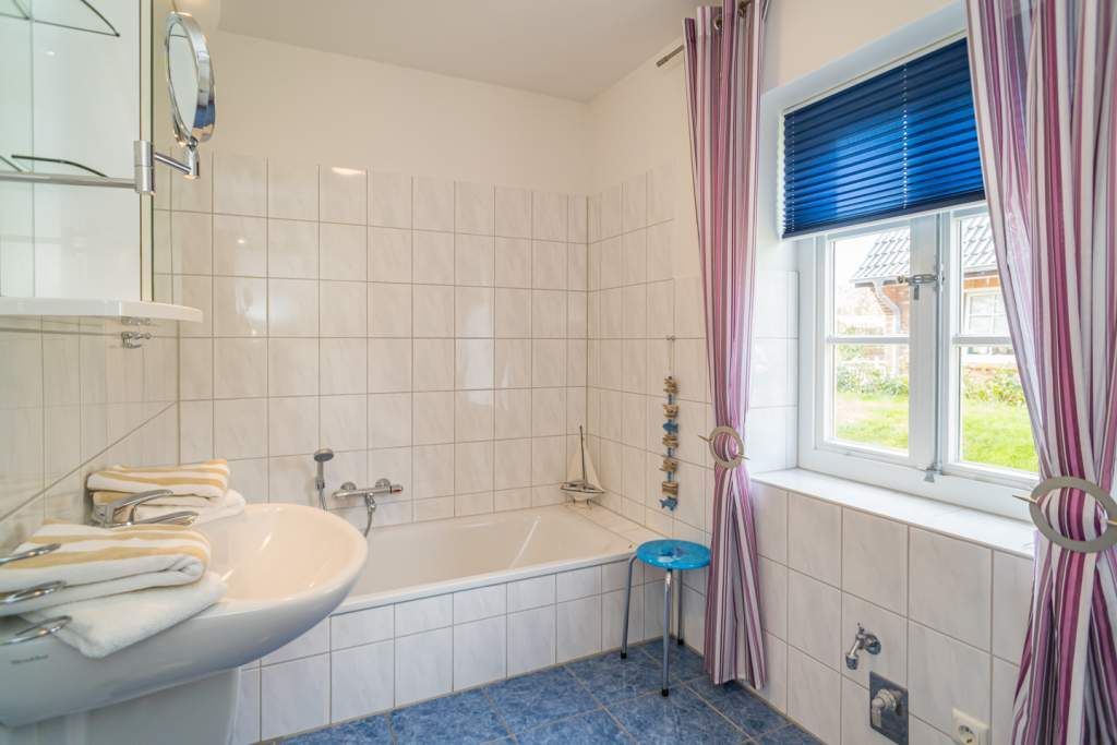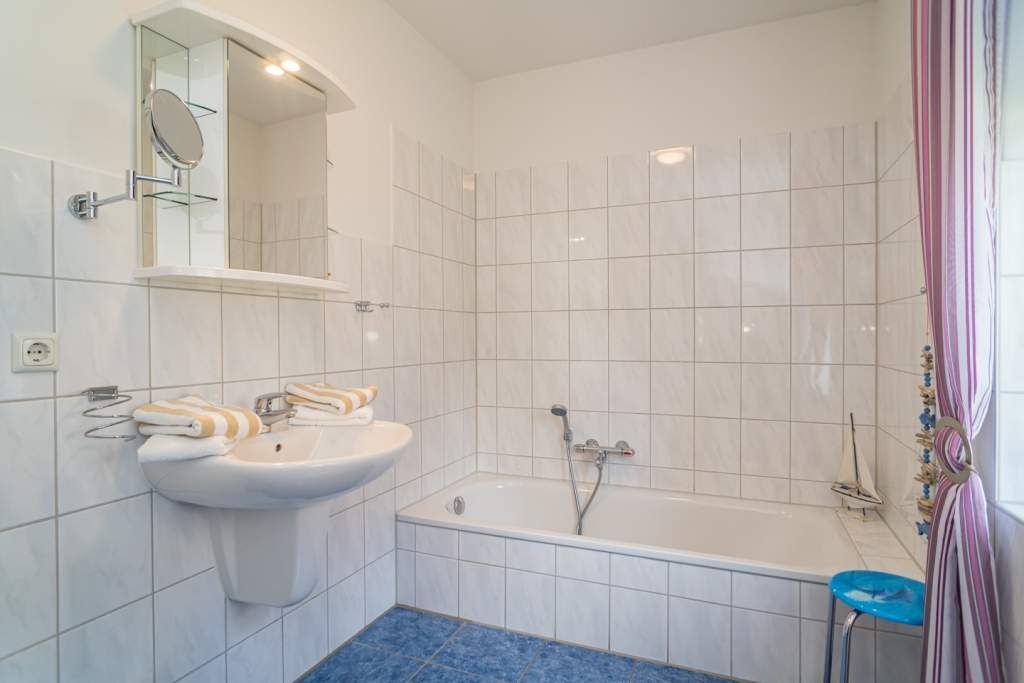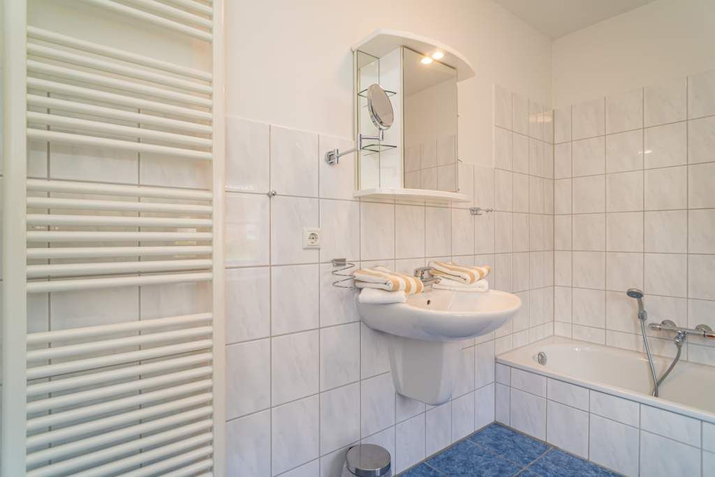 Es ist mit Badewanne, Waschtisch, Handtuchtrockner, Fön und WC ausgestattet.