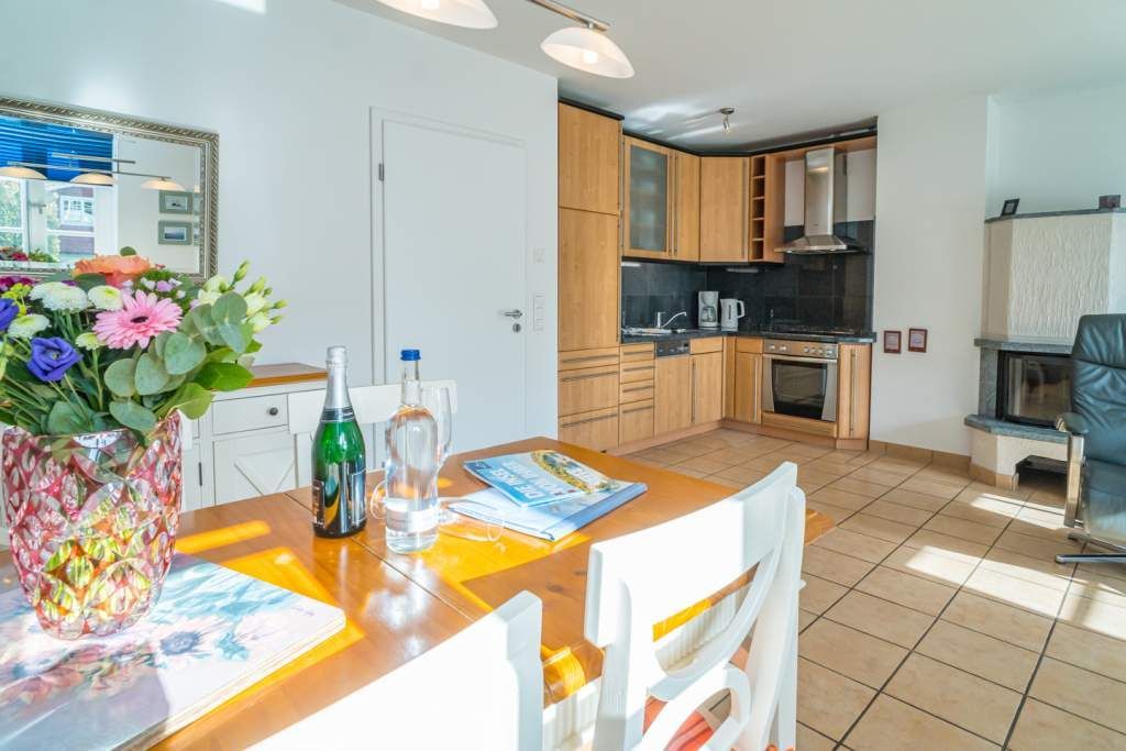 Die vollausgestattete Küche hat einen Geschirrspüler, ein Cerankochfeld mit Dunstabzugshaube, einen Backofen und einen Kühlschrank mit 3-Sterne-Gefrierfach.