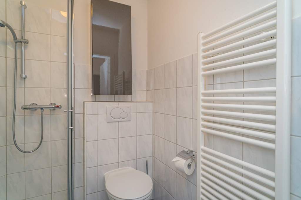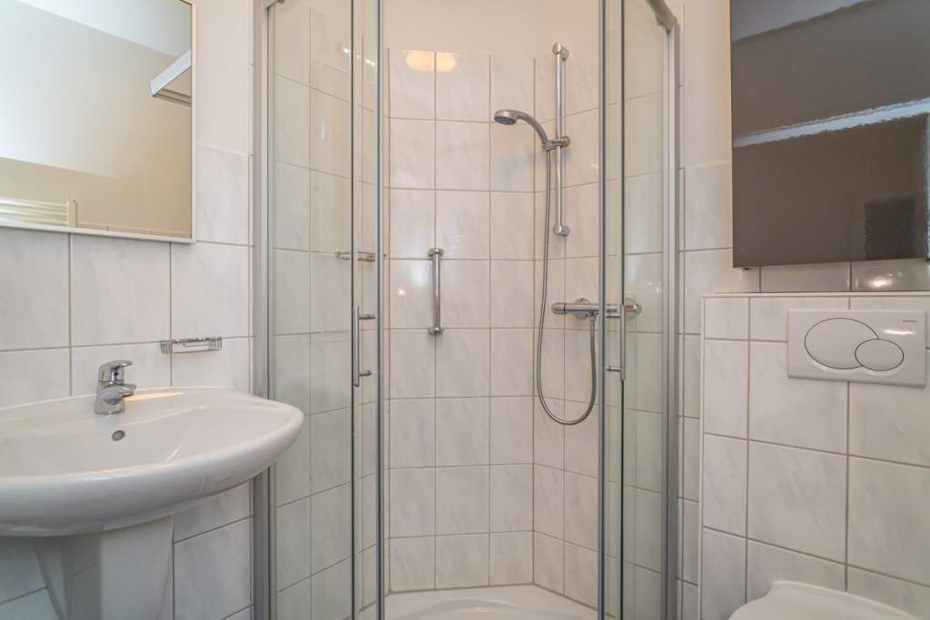 Das Duschbad hat neben der Dusche, einen Waschtisch, Handtuchtrockner und WC.