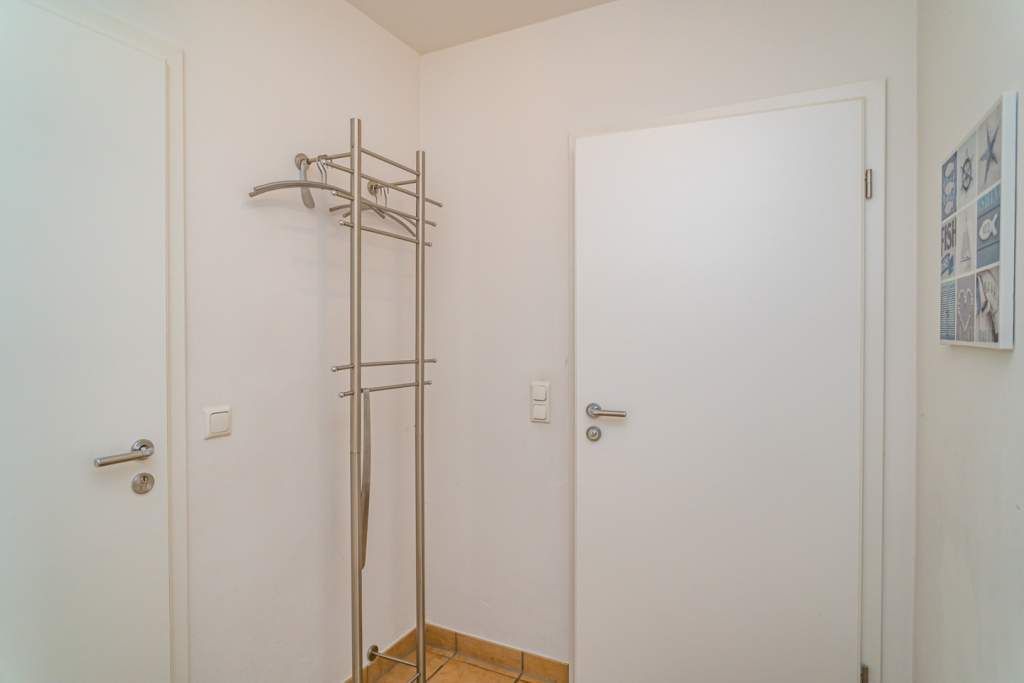 Von der Diele mit Garderobe gelangt man in das Wohnzimmer, in das Schlafzimmer und in das neue Duschbad/WC.