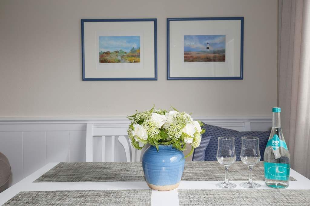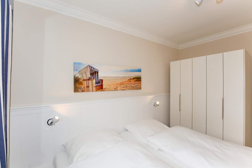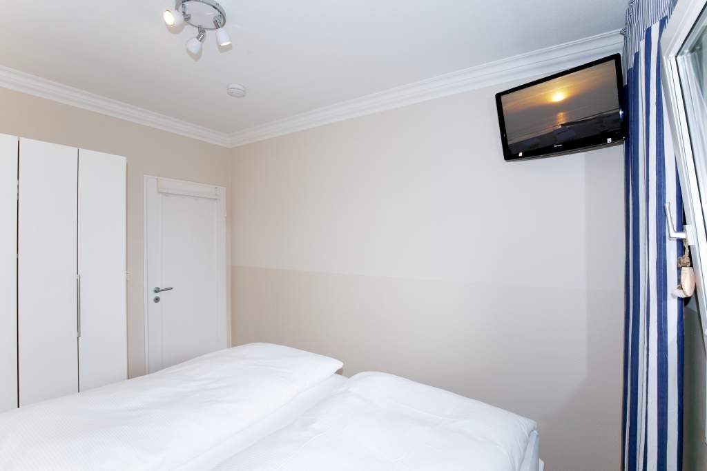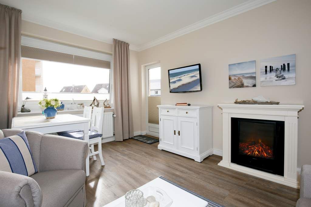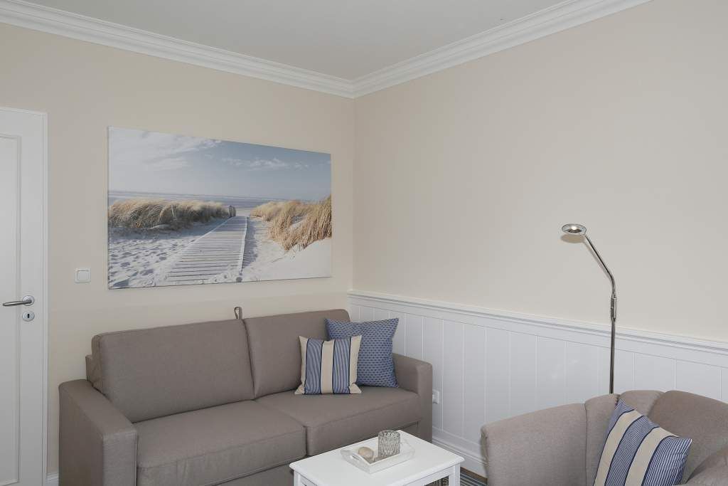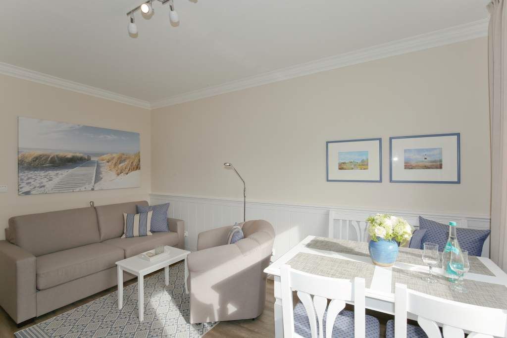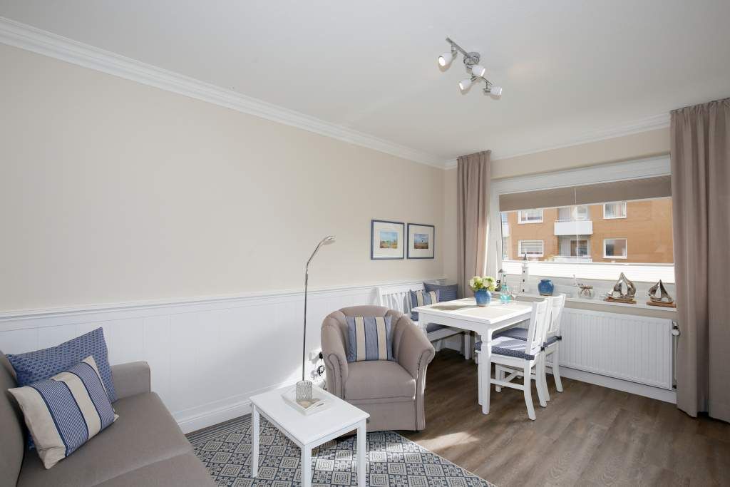 Diese charmante 2-Zimmer-Nichtraucher-Ferienwohnung mit ca. 37 qm Wohnfläche im Hochparterre auf der Süd-Ostseite ist ideal für maximal 2 Personen. Im hellen Wohnzimmer finden Sie eine komfortable Schlafcouch (1,40 x 1,80 m), einen gemütlichen Sessel mit passendem Fußhocker sowie einen separaten Essplatz. Für Ihre Unterhaltung sorgen ein Radio/CD-Player, Kabel-TV und ein stimmungsvoller Elektrokamin. Der angrenzende Süd-Ostbalkon lädt dazu ein, die frische Seeluft zu genießen.
