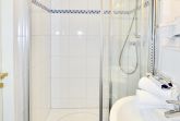Im Bad befinden sich eine superflache Duschanlage, ein WC, ein Waschtisch und ein Fön.