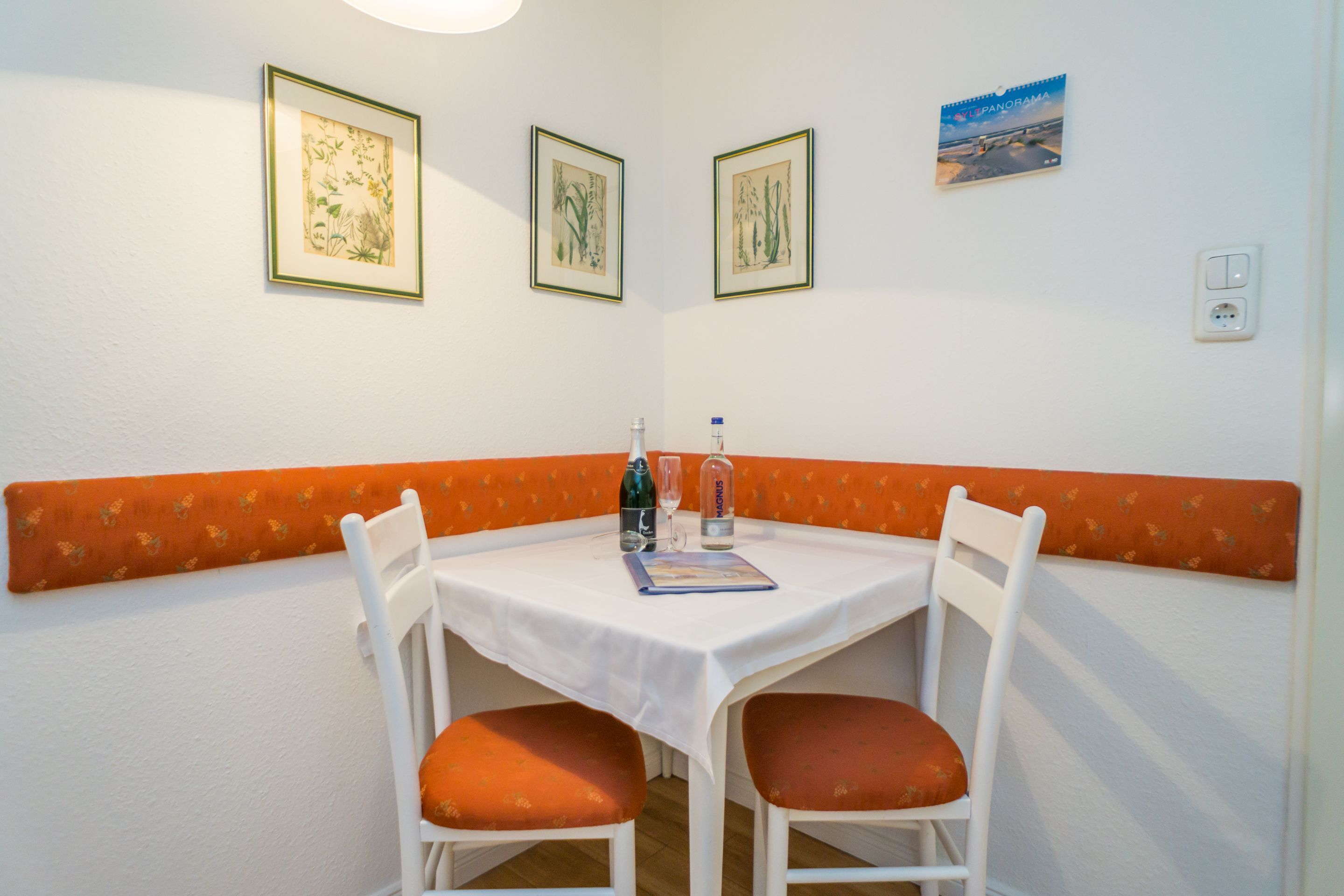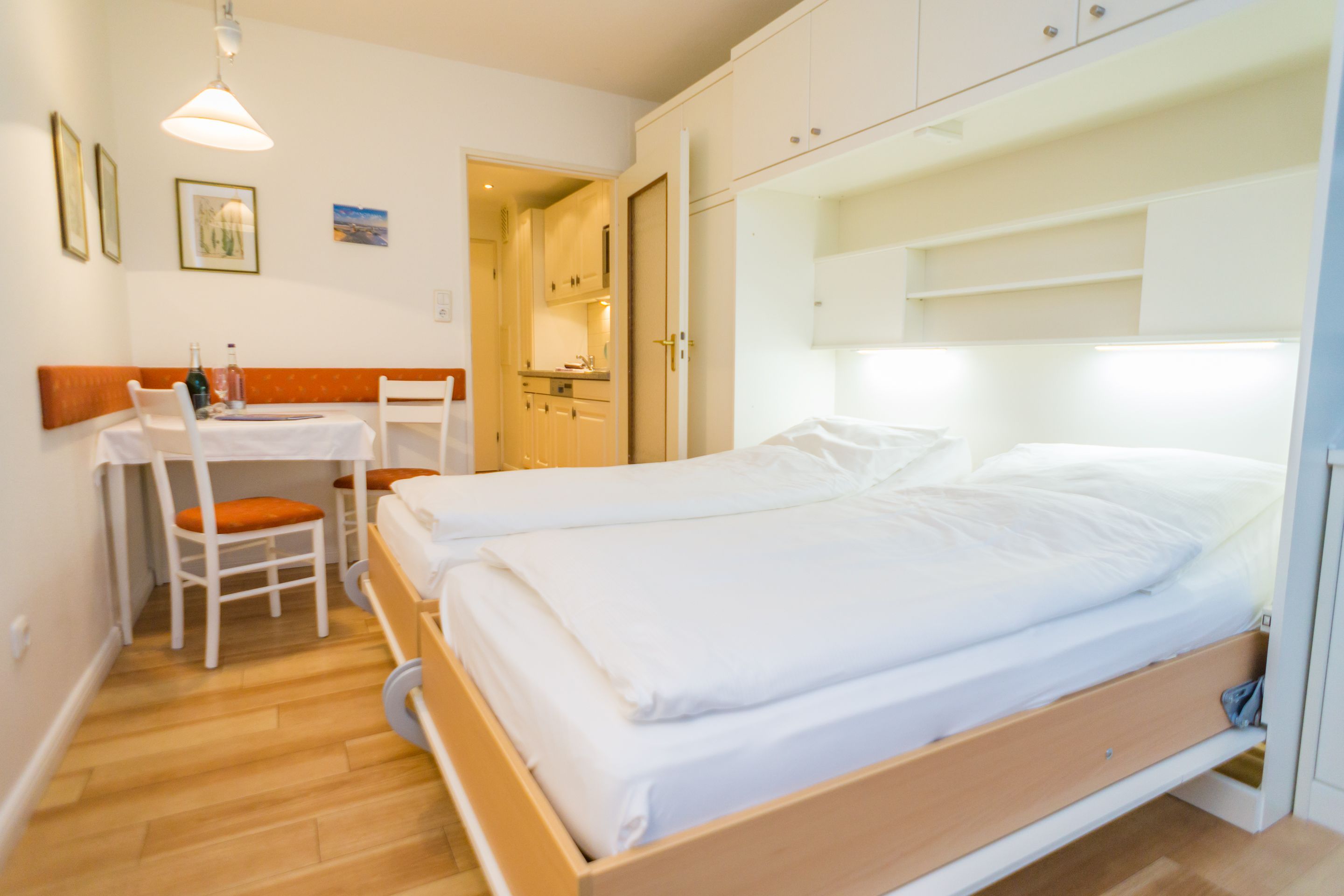 Der Wohn-/Schlafraum besteht aus einer gemütlichen Couch, einem Rattan-Sessel, einem separaten Essplatz, Doppelschrankbett (einzeln ausklappbar), Kabel-Flachbild-TV, CD/Radio-Minianlage.