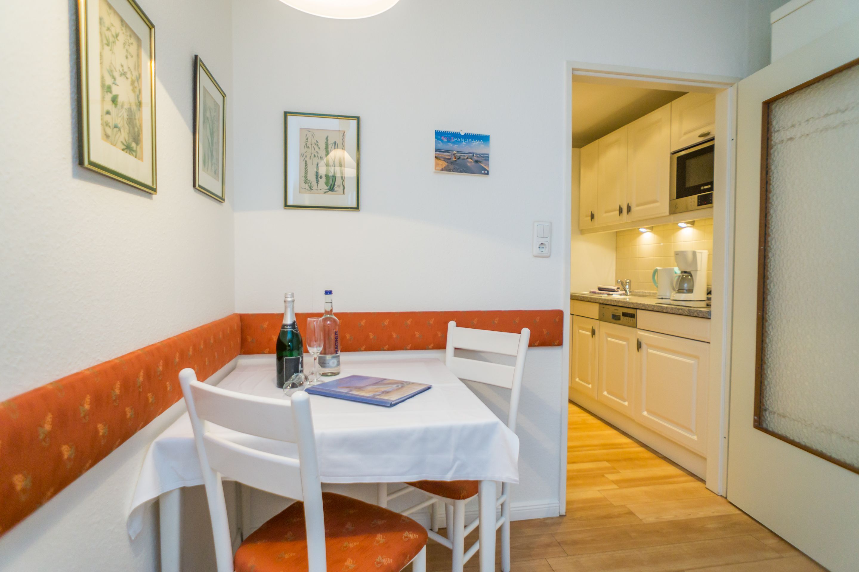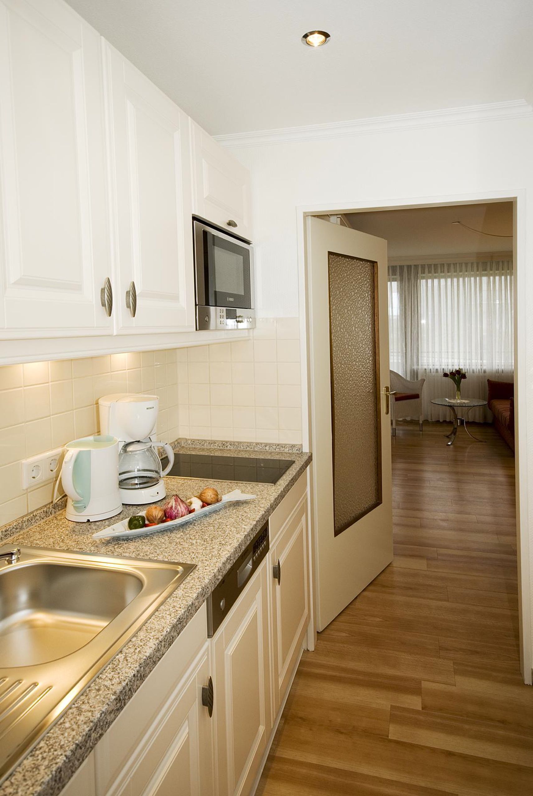 Die moderne Küchenzeile hat einen Geschirrspüler, ein Cerankochfeld, eine Mikrowelle und einen Kühlschrank mit Gefrierfach. Kaffeemaschine, Wasserkocher und Toaster gehören zur Grundausstattung.