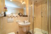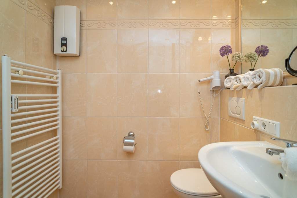 Das hochwertige Badezimmer ist mit Runddusche, Waschtisch, Fön und WC ausgestattet.