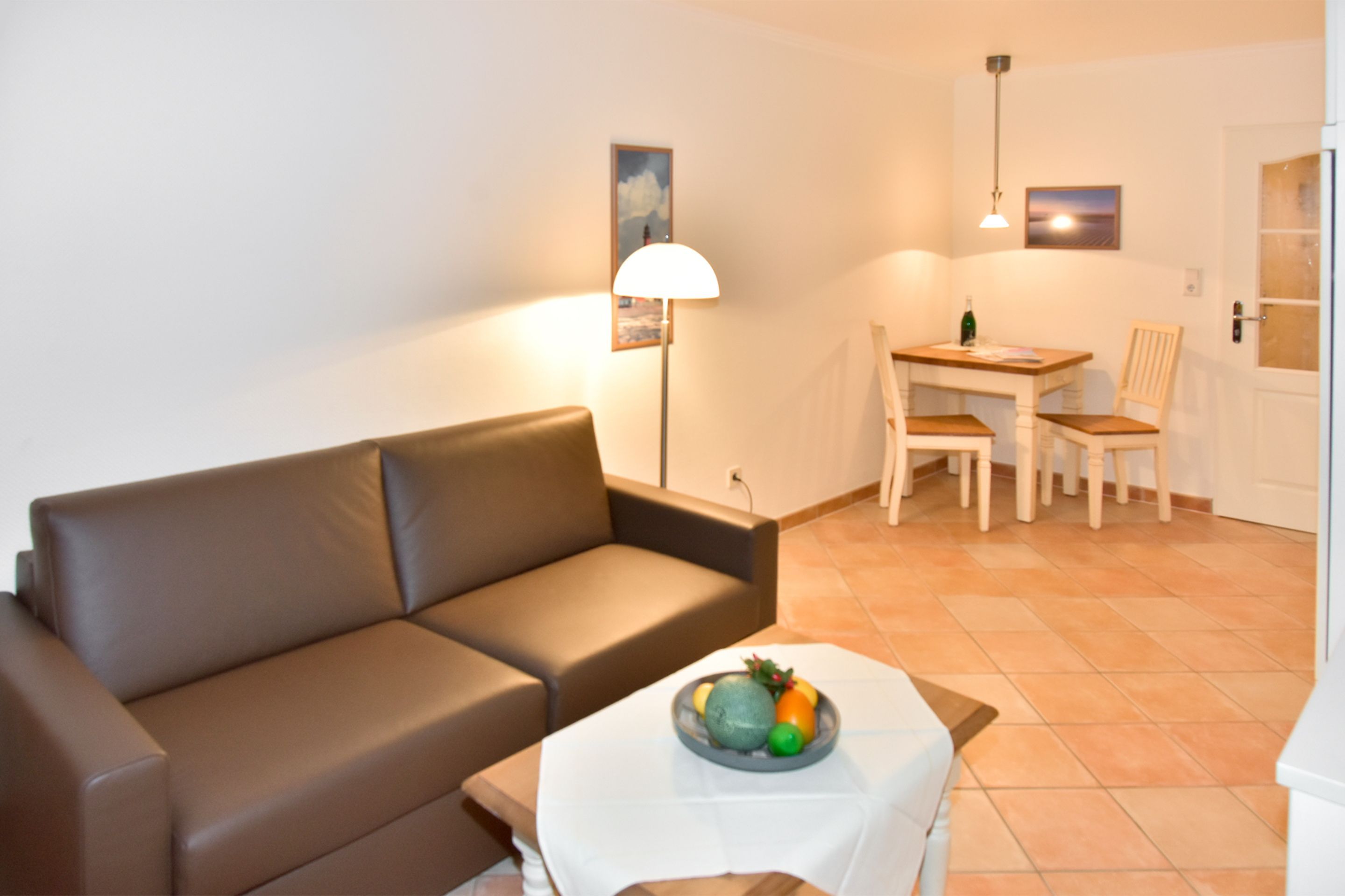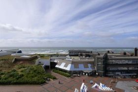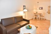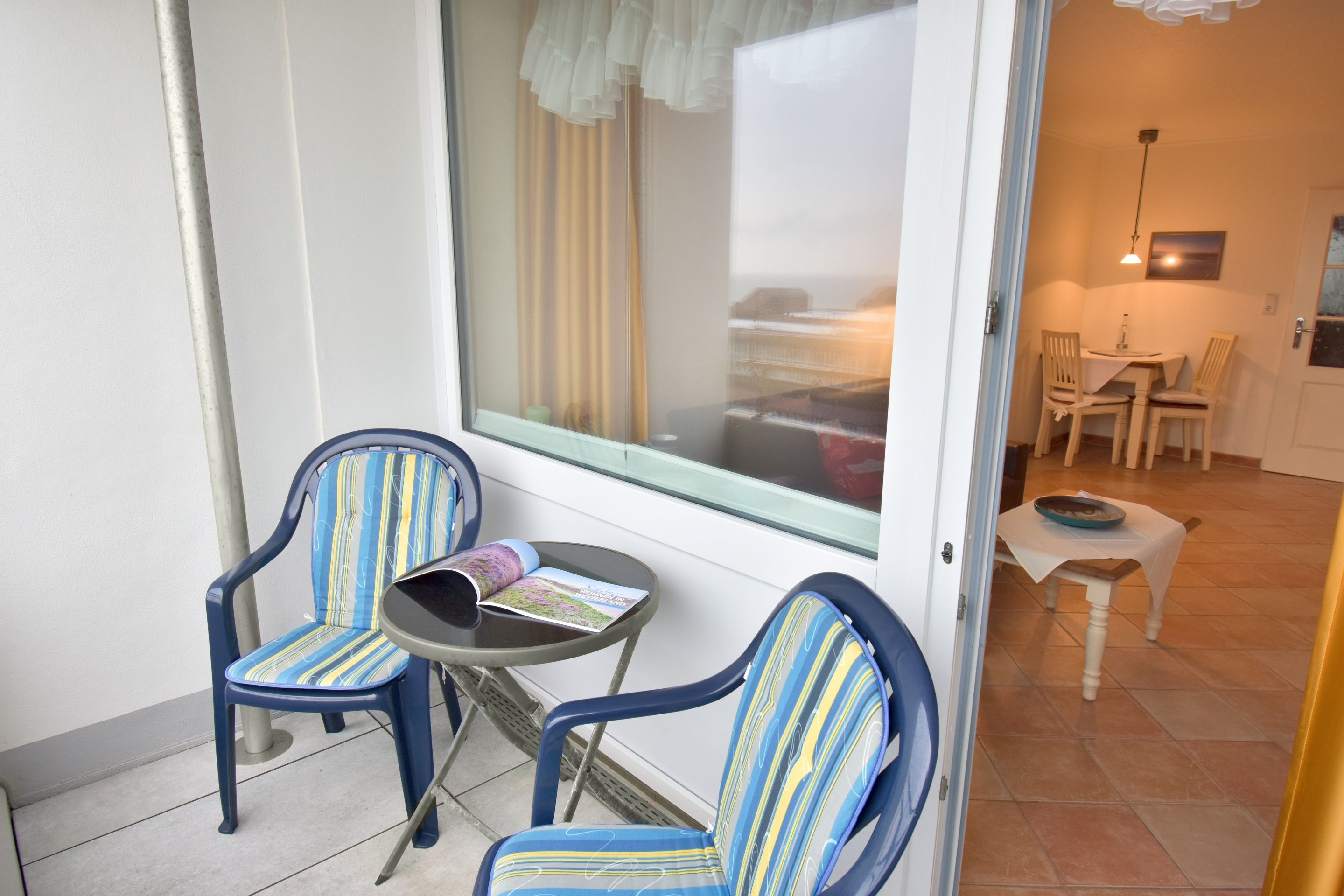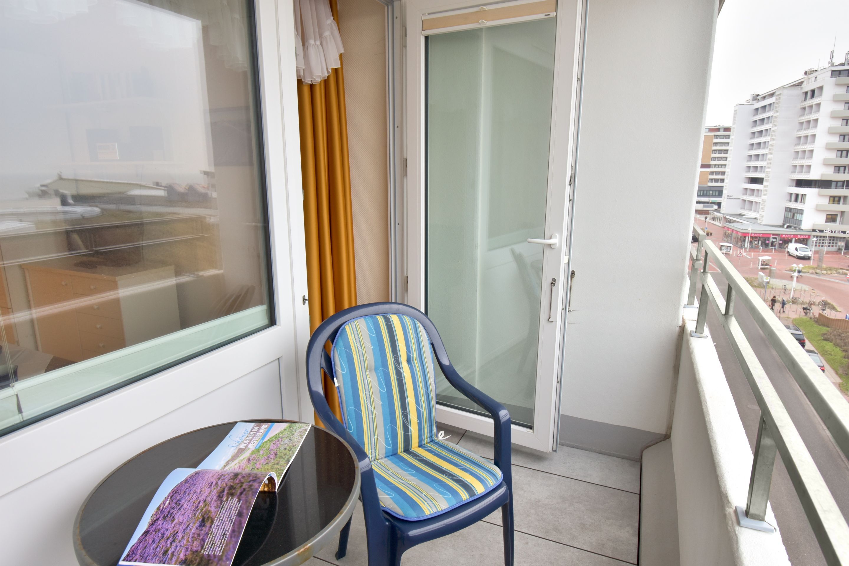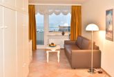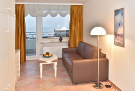 Komplett geflieste 1-Zimmer-Ferienwohnung (ca. 25 m²) in der 5. Etage zur Seeseite mit Westloggia und herrlichem Meerblick (Nachmittagssonne, mit Balkonmöbeln und Auflagen) für max. 2 Personen.