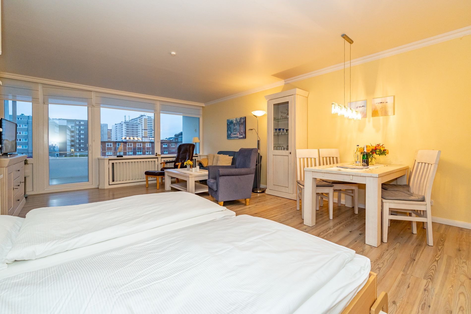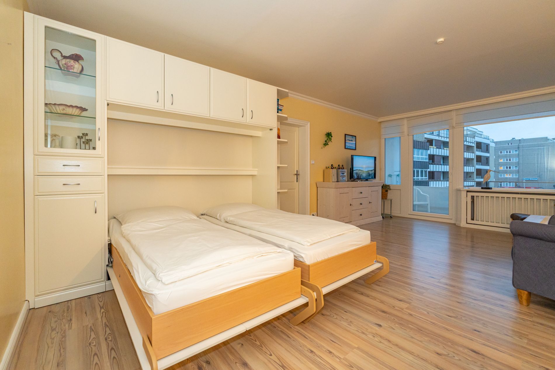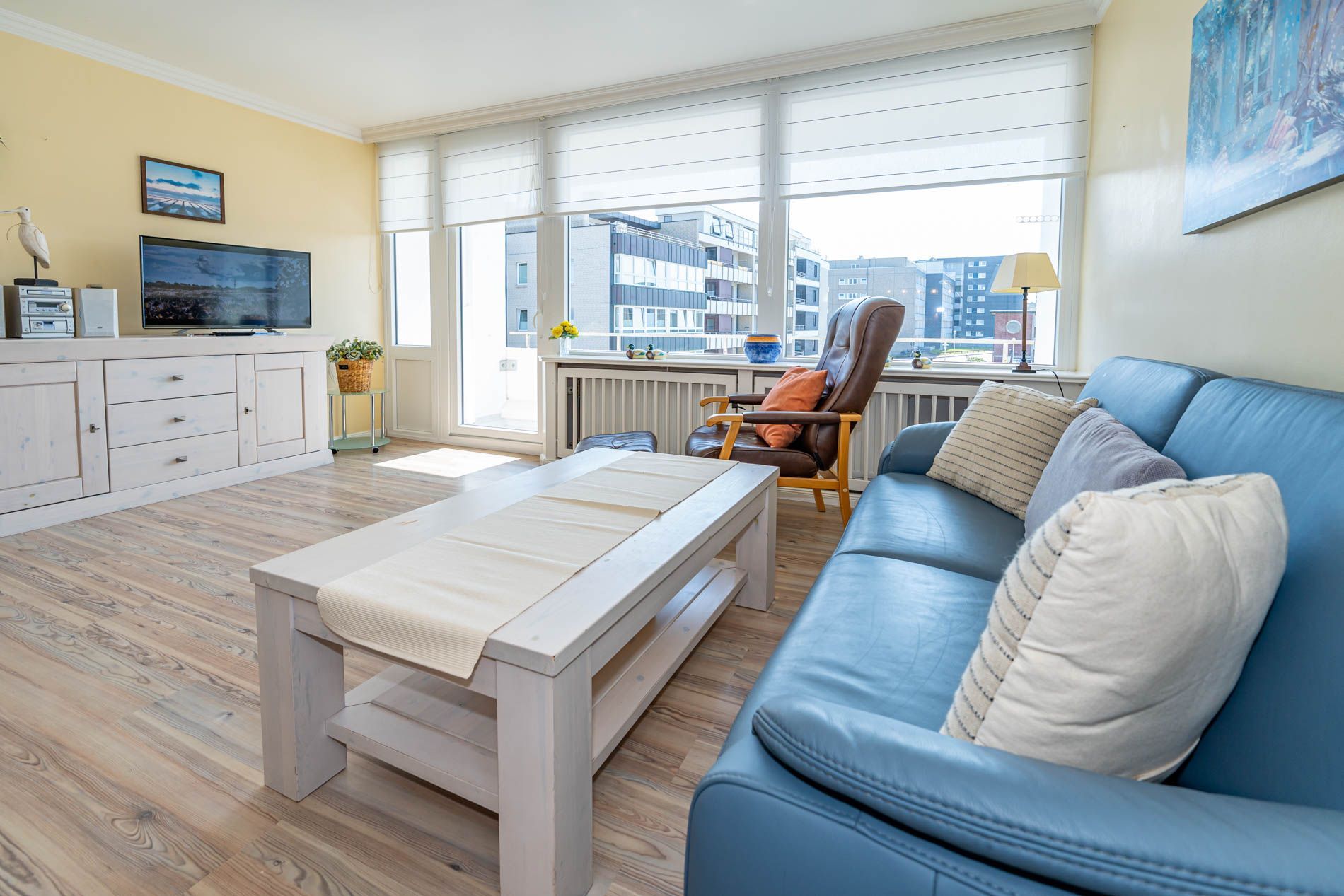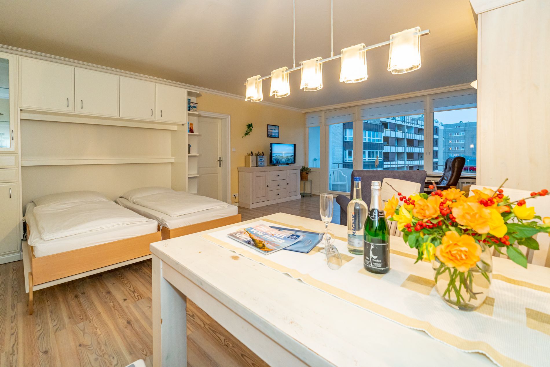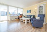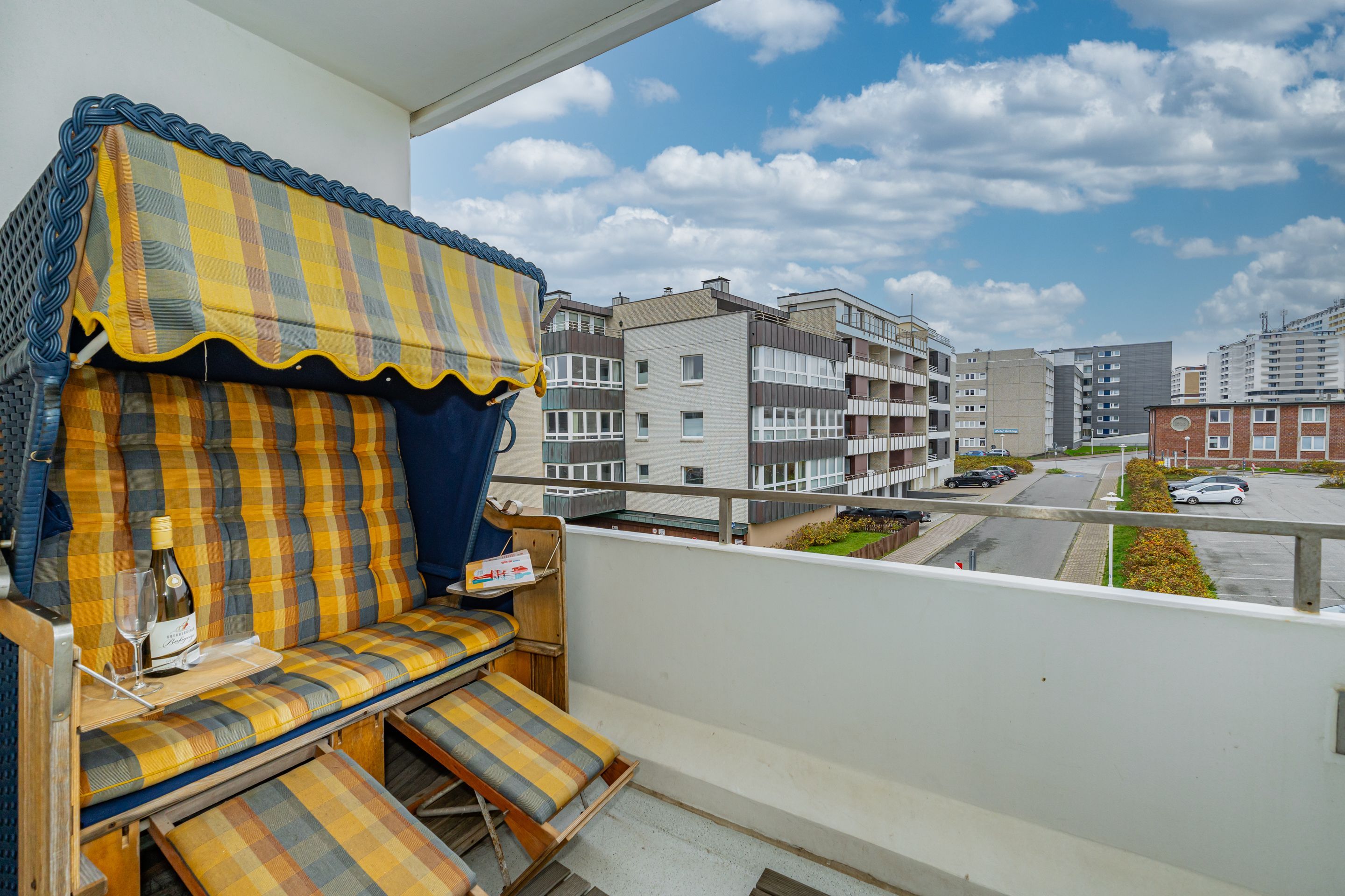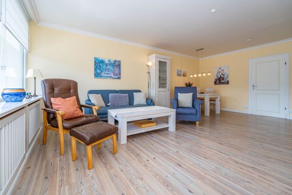 Wohnzimmer mit Sessel, Couchgarnitur, Schrankbetten (einzeln ausklappbar), Essplatz, Kabel-Flachbild-TV, Radio und CD, Südbalkon mit Strandkorb, separate Küche mit Fenster, Geschirrspüler, Mikrowelle, Kaffeemaschine, Wasserkocher und Toaster, Wannenbad/WC mit Fenster, Fön.