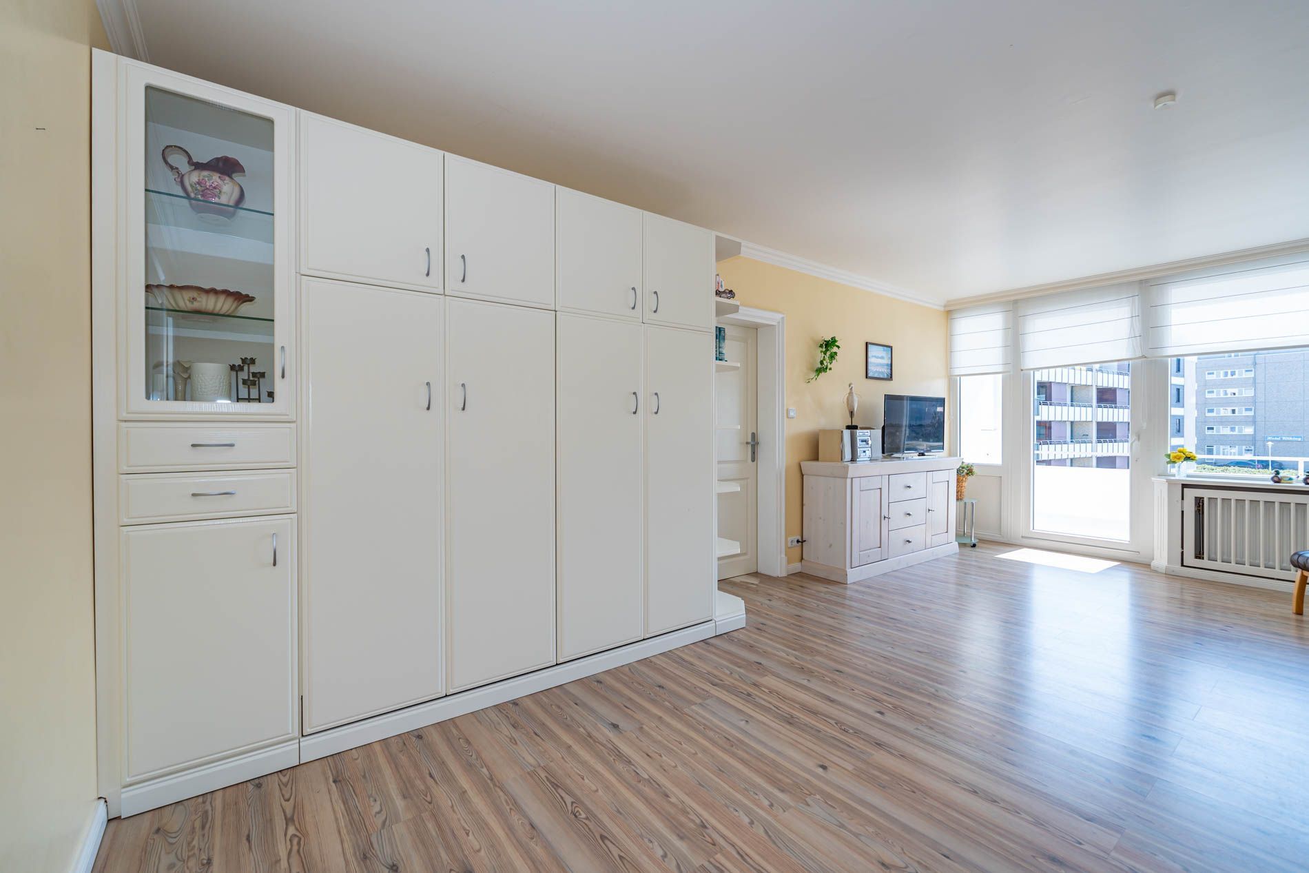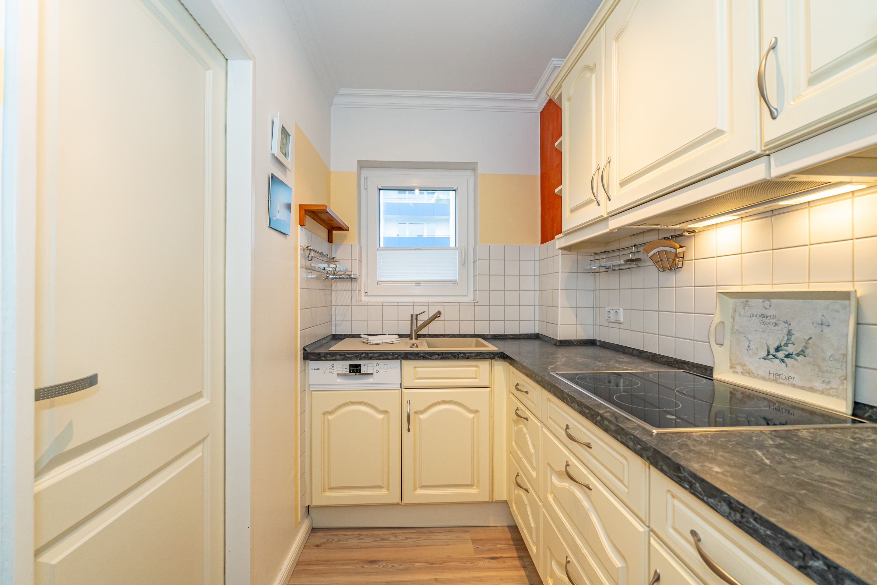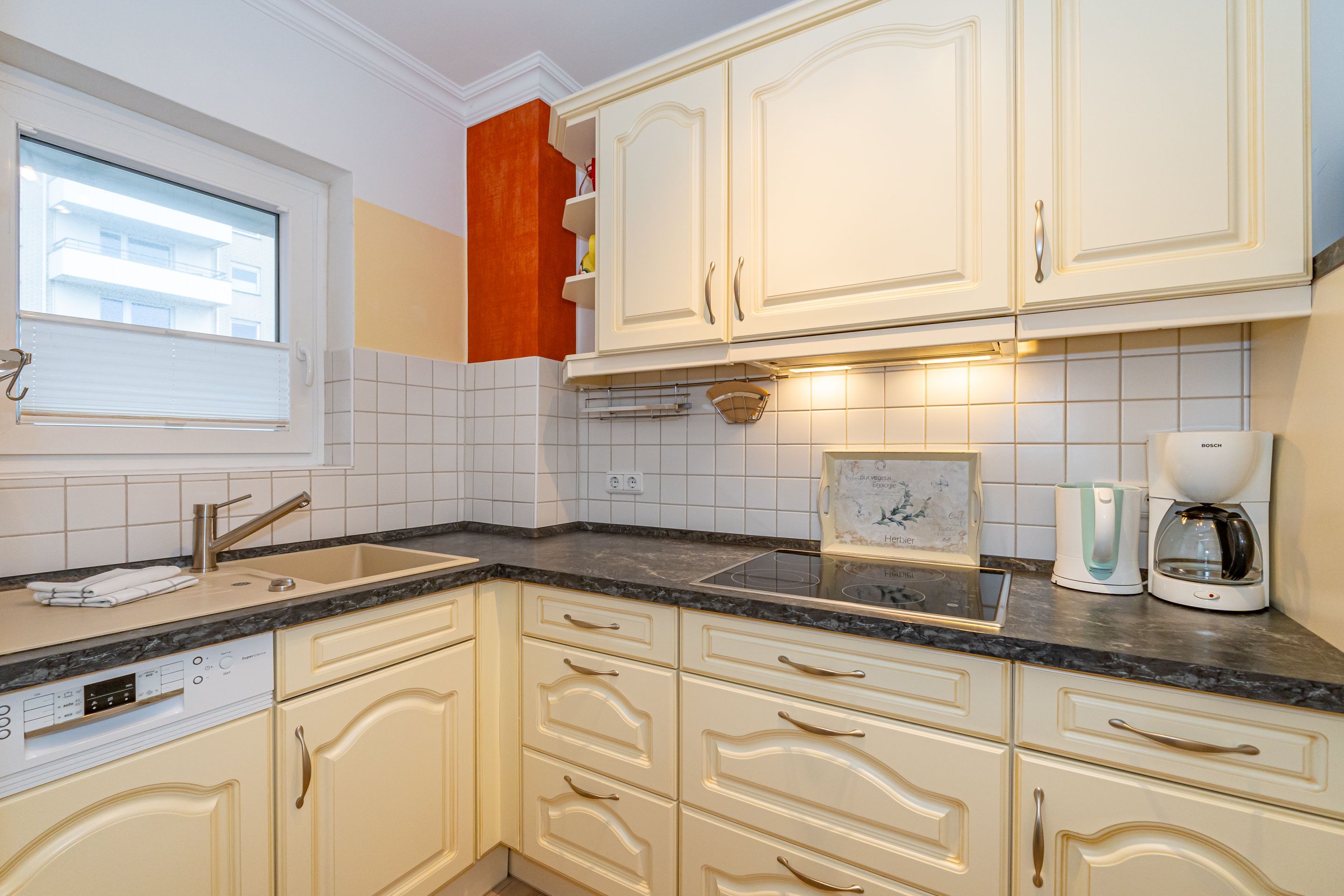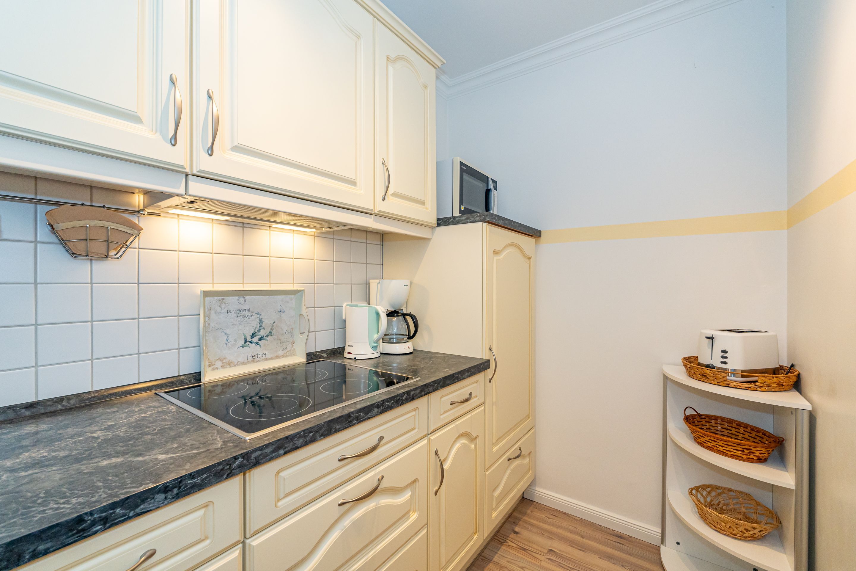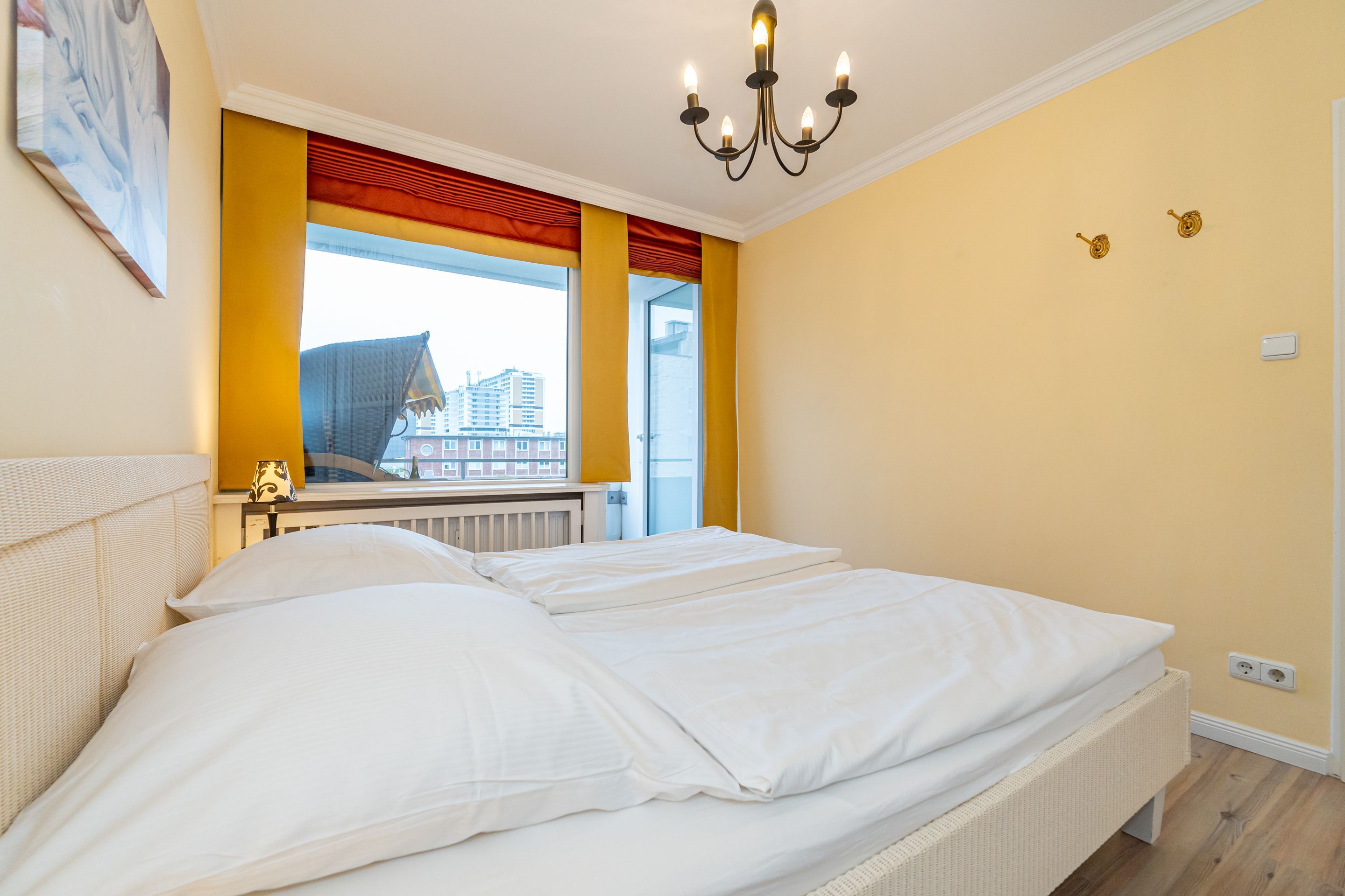 Wohnzimmer mit Sessel, Couchgarnitur, Schrankbetten (einzeln ausklappbar), Essplatz, Kabel-Flachbild-TV, Radio und CD, Südbalkon mit Strandkorb, separate Küche mit Fenster, Geschirrspüler, Mikrowelle, Kaffeemaschine, Wasserkocher und Toaster, Wannenbad/WC mit Fenster, Fön.