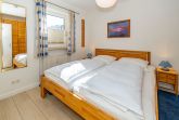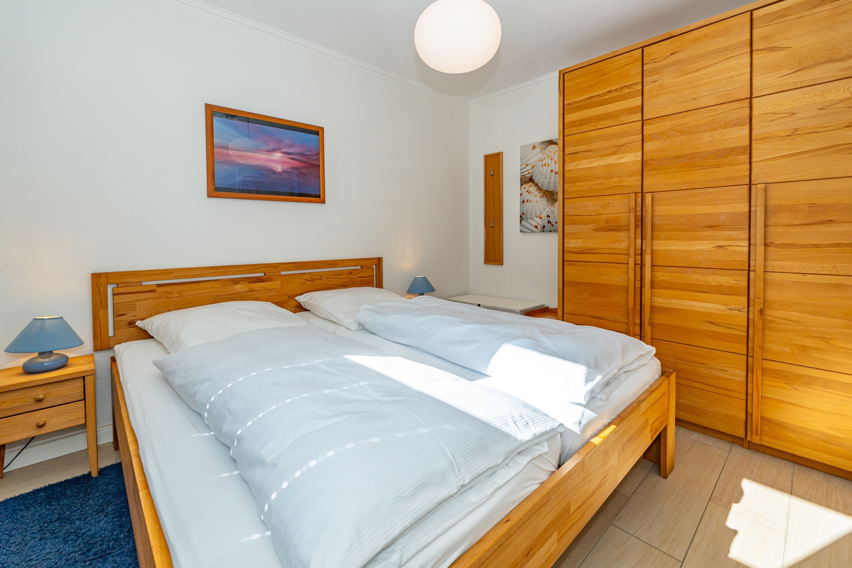 Das vom Wohnzimmer aus begehbare Schlafzimmer hat ein gutes Doppelbett (2 m x 1,80 m) mit zwei Einzelmatratzen, einen Kleiderschrank und zwei Nachttische.