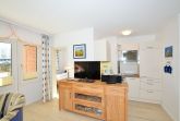 Der Wohnraum besteht aus einer bequemen Sitzgarnitur (Doppel-Schlafcouch 1,60 m x 2,00 m und zwei Sesseln), einem Essplatz, Kabel-Flachbild-TV, Radio und offener Küche.