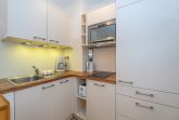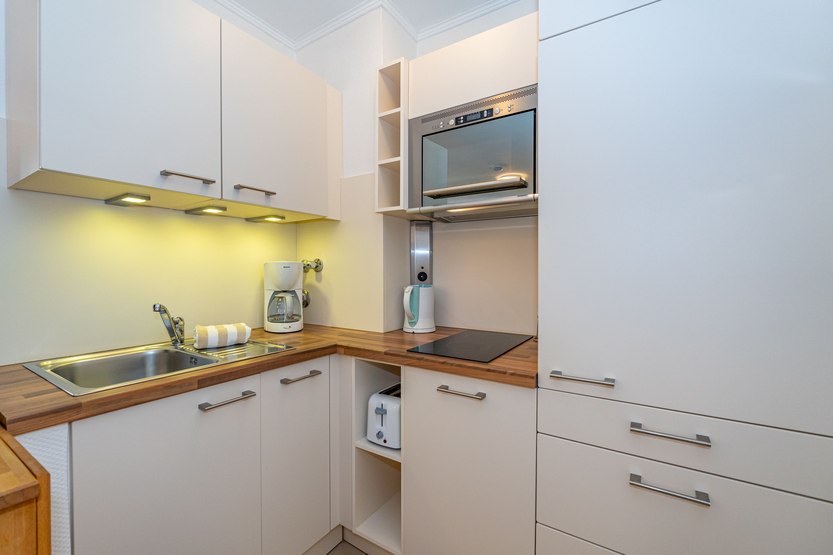 Die offene Küche hat einen Geschirrspüler, Mikrowelle mit Grillfunktion, Ceranfeld mit zwei Kochfeldern und Kühlschrank mit 3-Sterne-Gefrierfach.