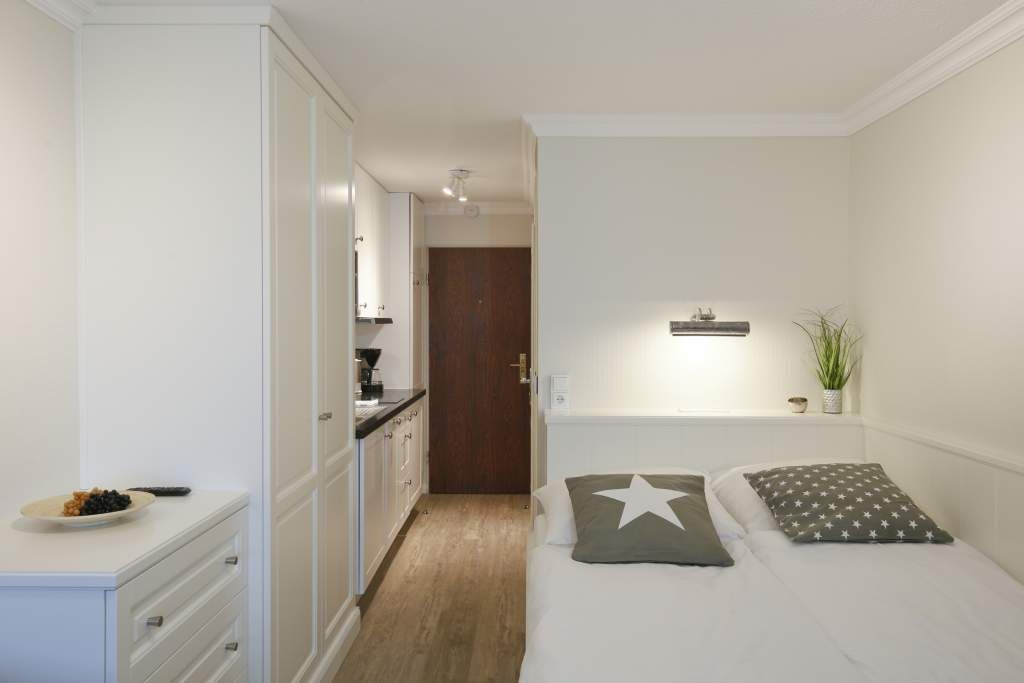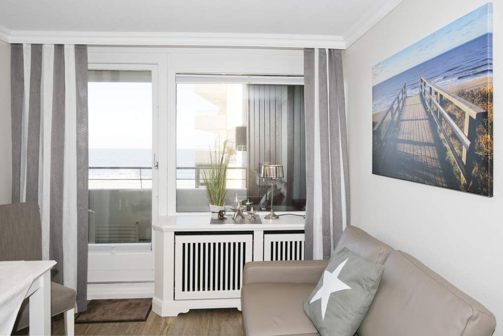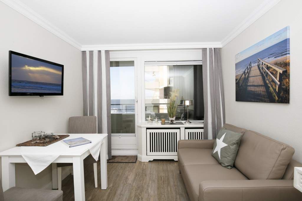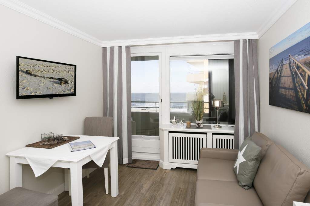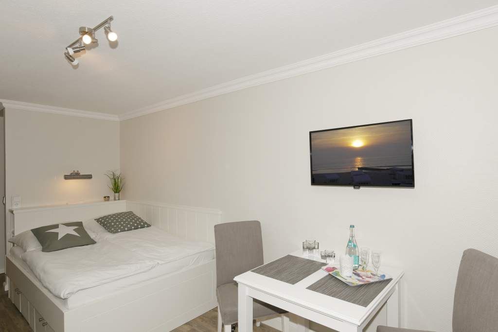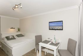 1-Zimmer-Nichtraucher-Ferienwohnung ca. 23 qm in der 3. Etage zur Westseite mit seitlichem Meerblick und Westloggia (Nachmittagssonne, mit Balkonmöbeln und Auflagen) für max. 2 Personen.