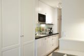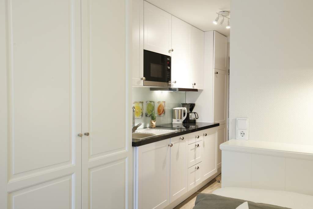 Die moderne Küchenzeile hat einen Geschirrspüler, eine Mikrowelle, ein Ceranfeld mit zwei Kochfeldern und ein Kühlschrank. Kaffeemaschine, Wasserkocher und Toaster gehören zur Grundausstattung.