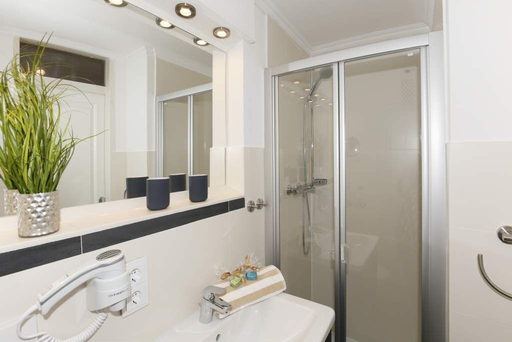 Im hellen, freundlichen Bad befinden sich eine Dusche, ein WC und ein Waschtisch.