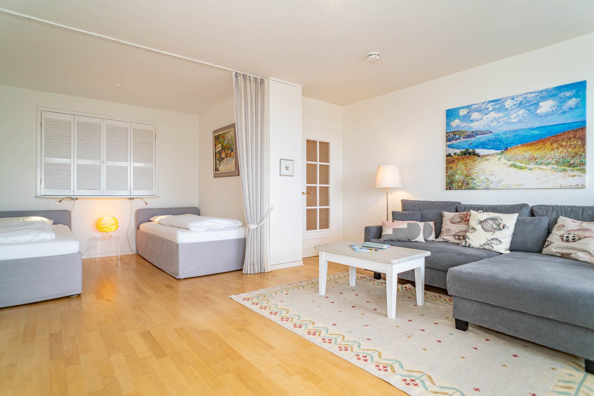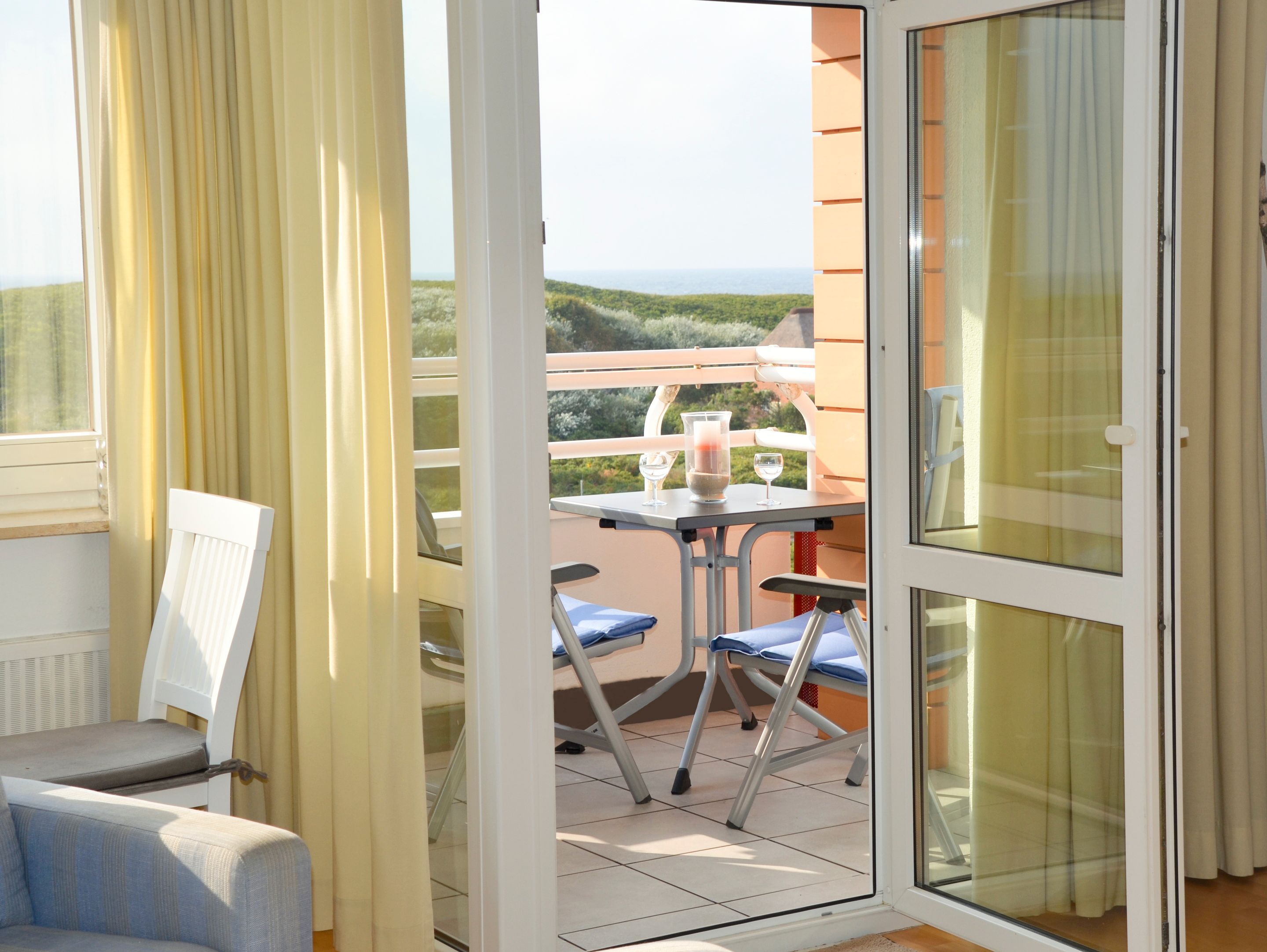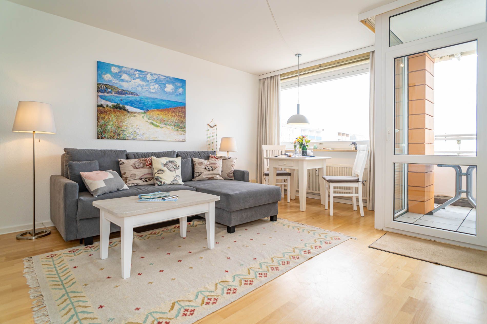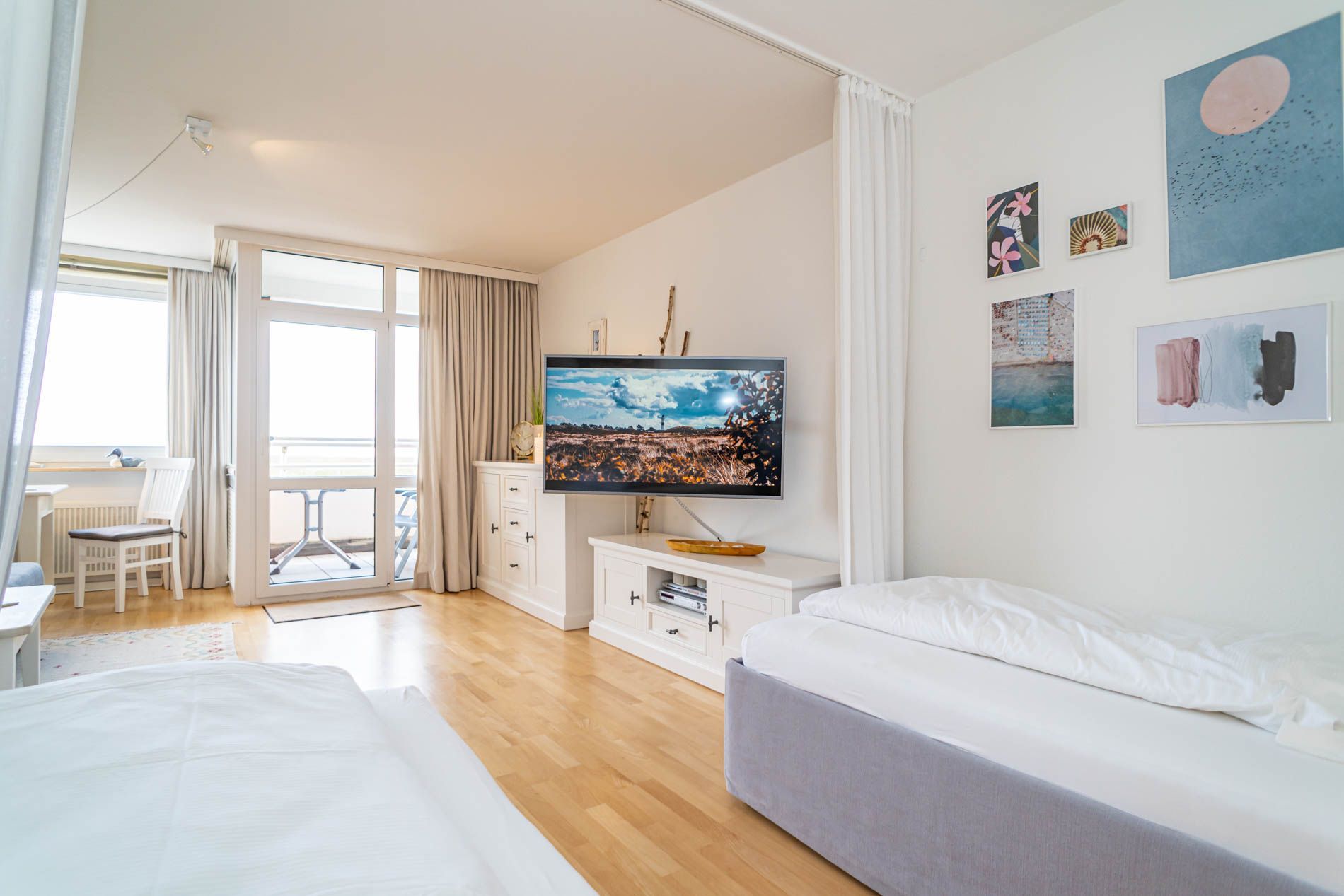 Großzügige 1-Zimmer-Ferienwohnung (ca. 48,5 qm) für 2 Personen, in der Nähe des Übergangs zu Promenade und Strand, in der 4. Etage mit direktem Meerblick, Balkon zur Seeseite mit Balkonmöbeln.