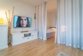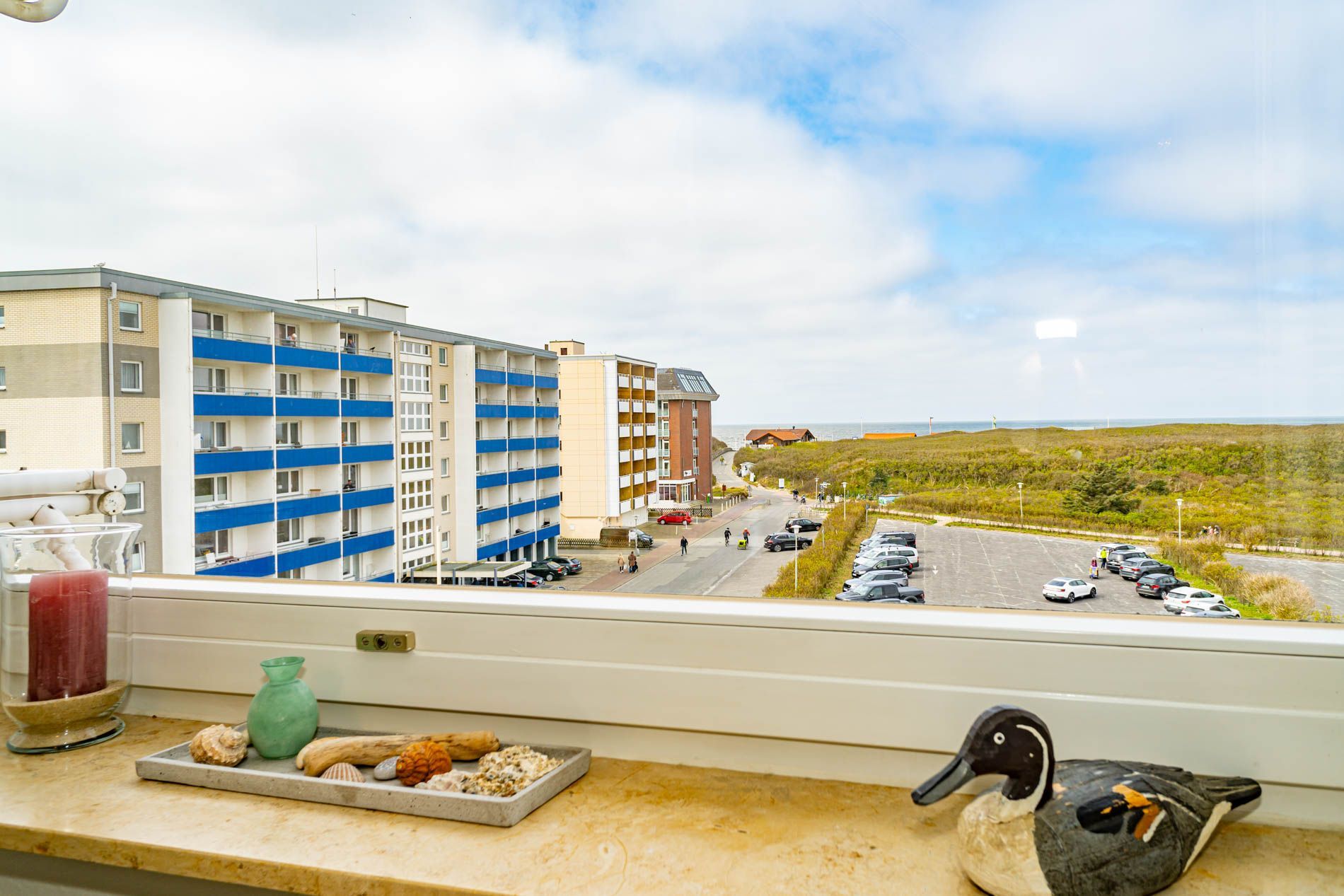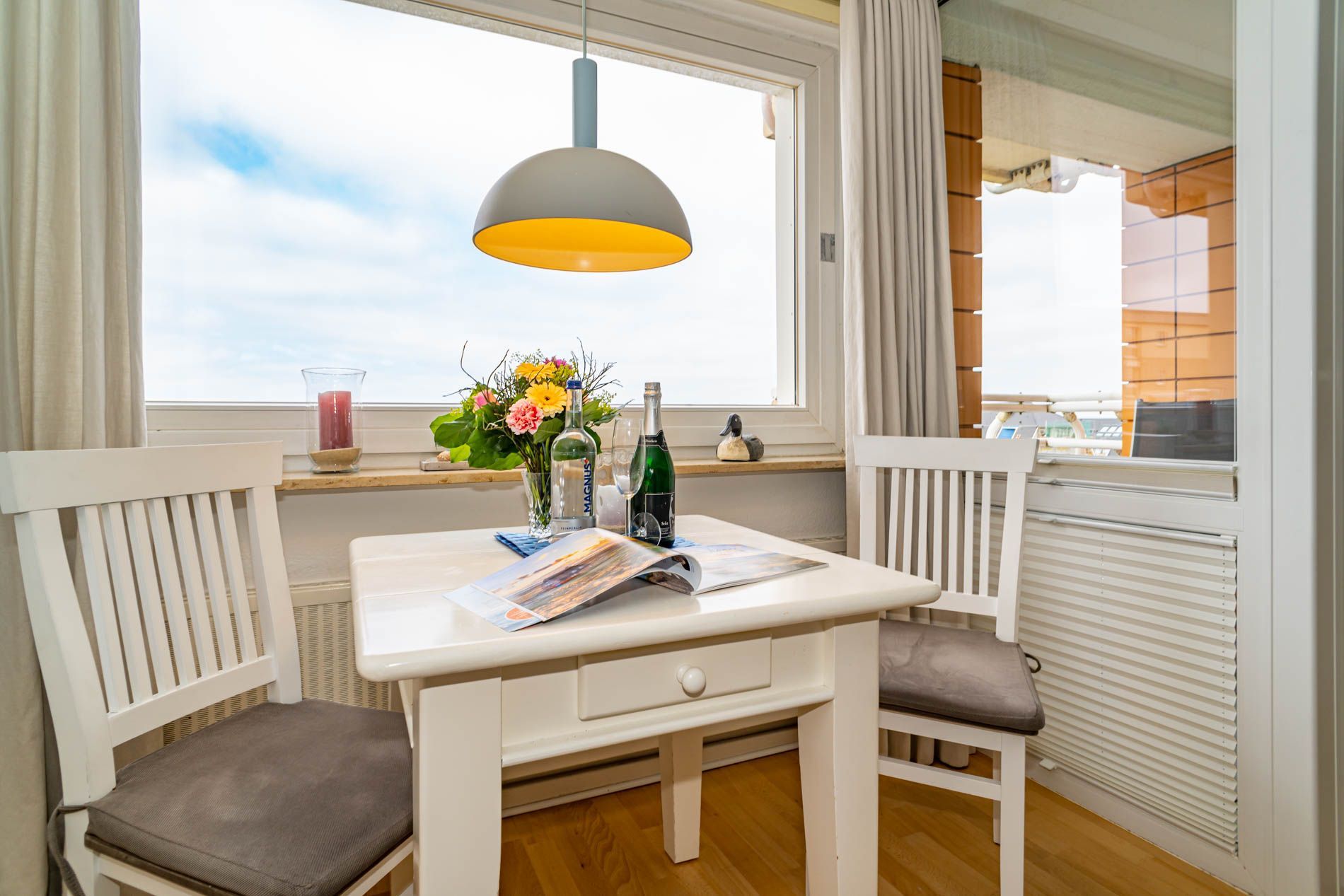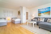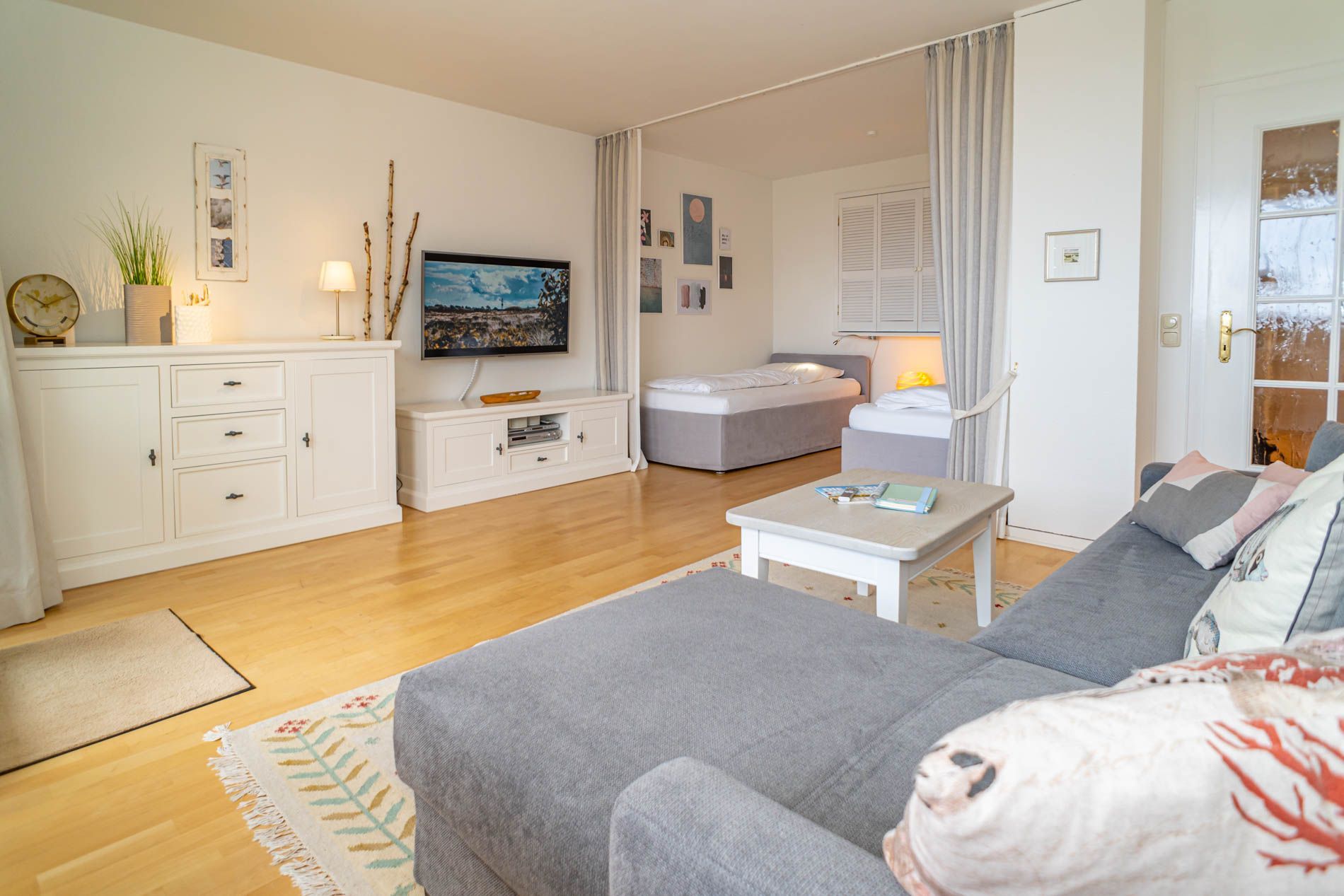 Großzügige 1-Zimmer-Ferienwohnung (ca. 48,5 qm) für 2 Personen, in der Nähe des Übergangs zu Promenade und Strand, in der 4. Etage mit direktem Meerblick, Balkon zur Seeseite mit Balkonmöbeln.