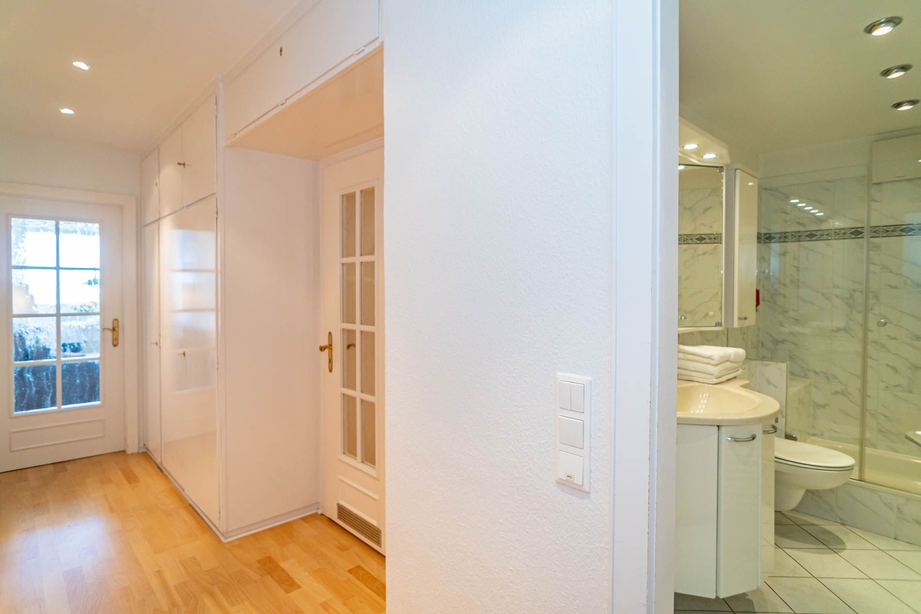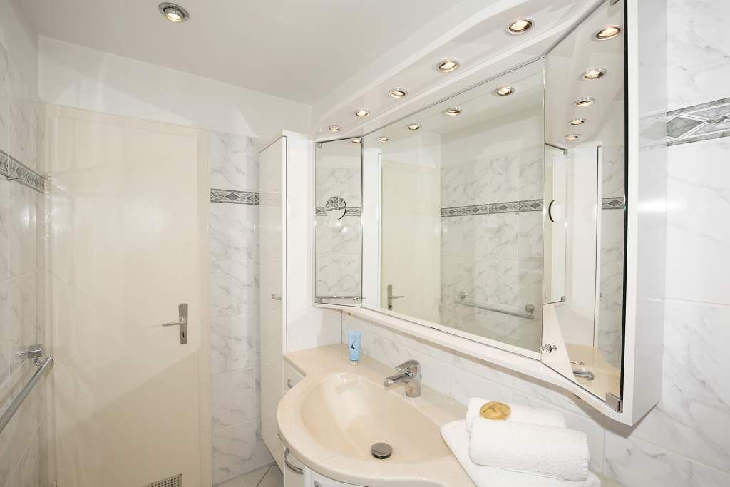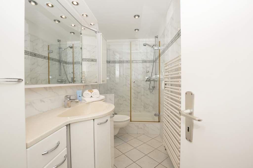 Das geräumige Bad ist mit Dusche, Waschtisch, Handtuchtrockner und WC ausgestattet.