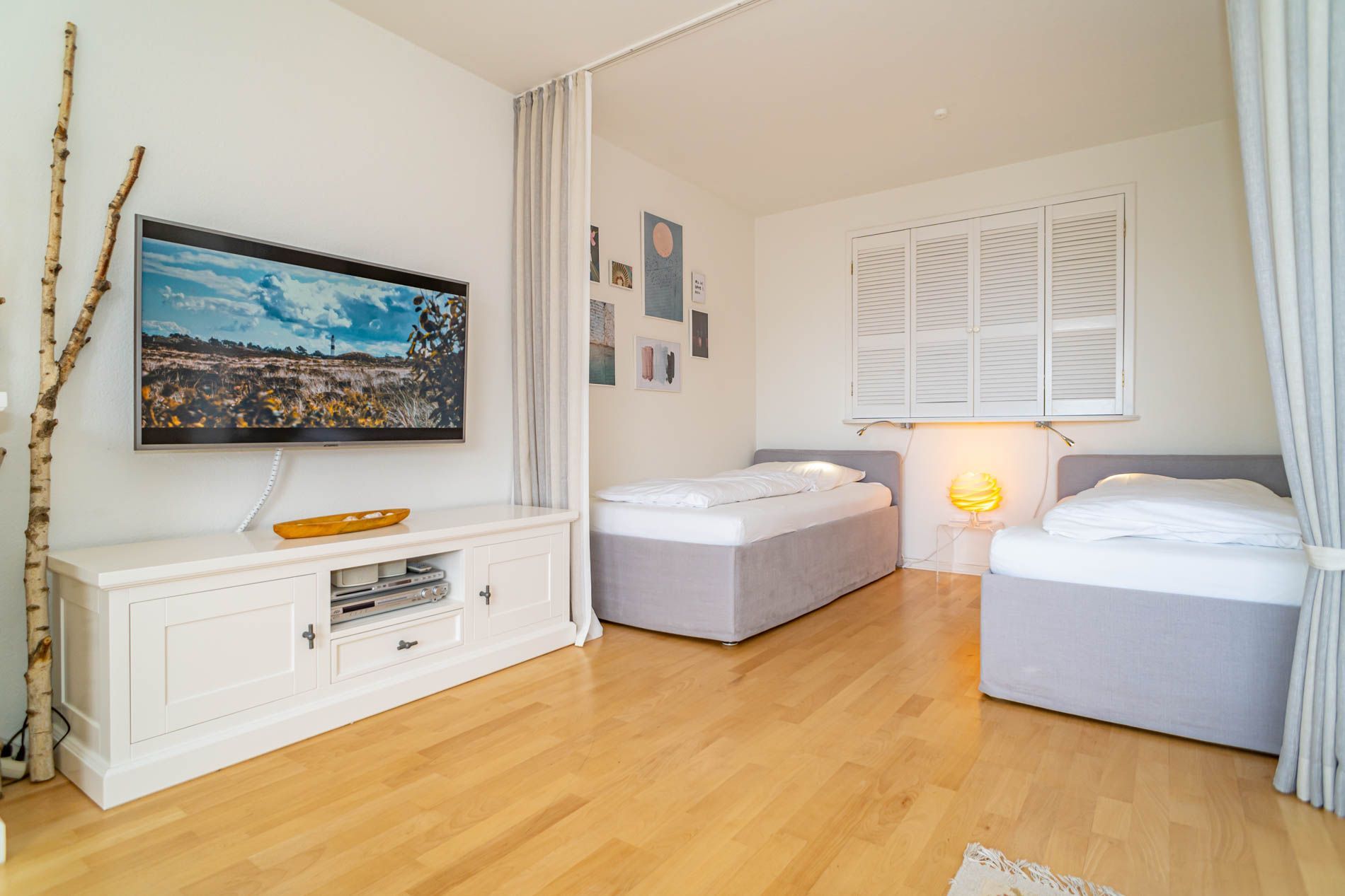 Im Schlafbereich befinden sich zwei Einzelbetten (1x2m, zusammenschiebbar als Doppelbett). Der Schlafbereich kann durch einen Vorhang vom Wohnbereich getrennt werden.
