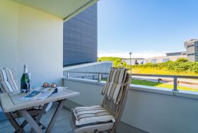 Helle, luxuriös sanierte 1-Zimmer-Ferienwohnung im Hochparterre mit großzügigem Westbalkon, auf dem Sie von mittags bis zum Abend die Sonne genießen können.